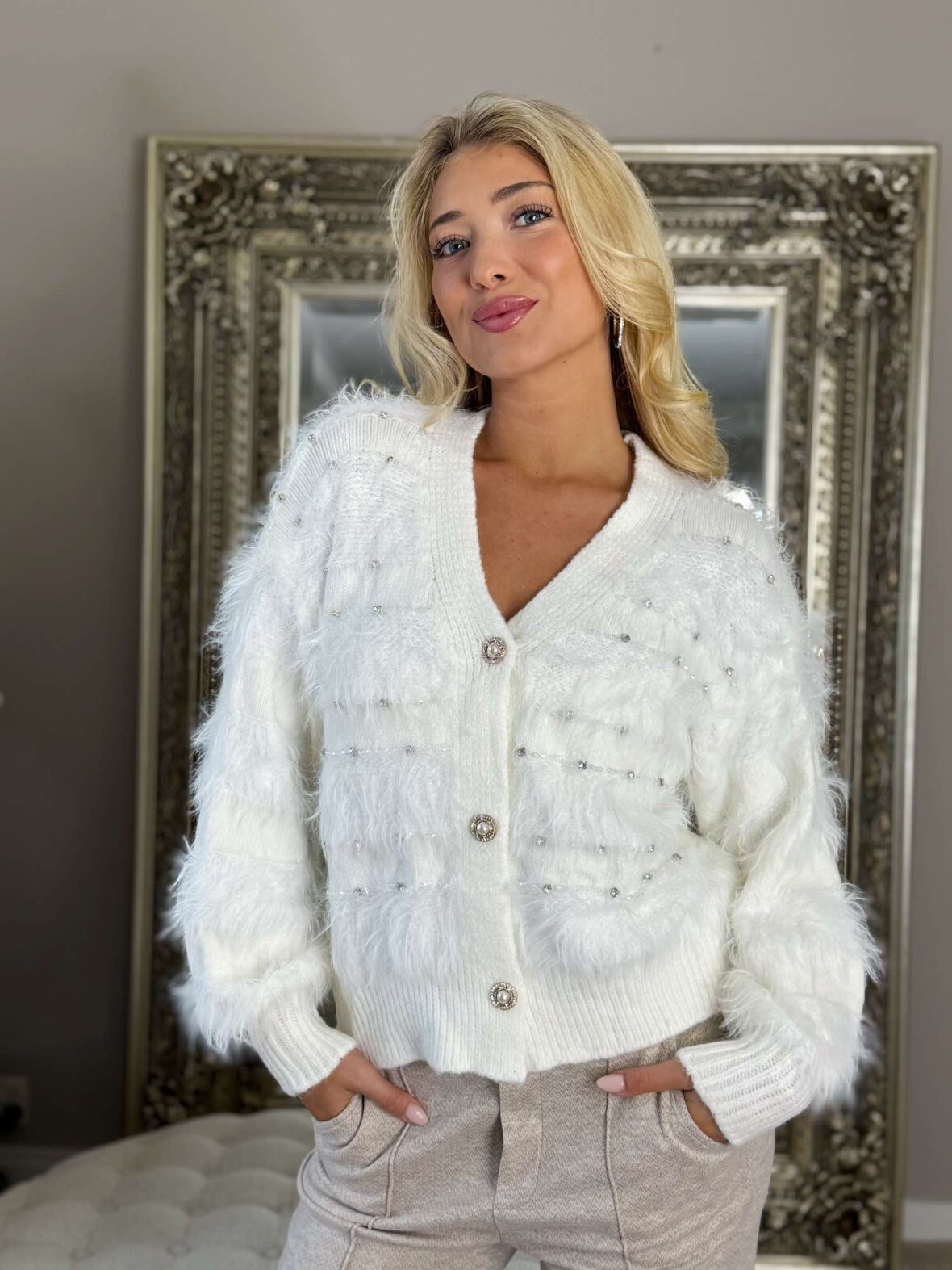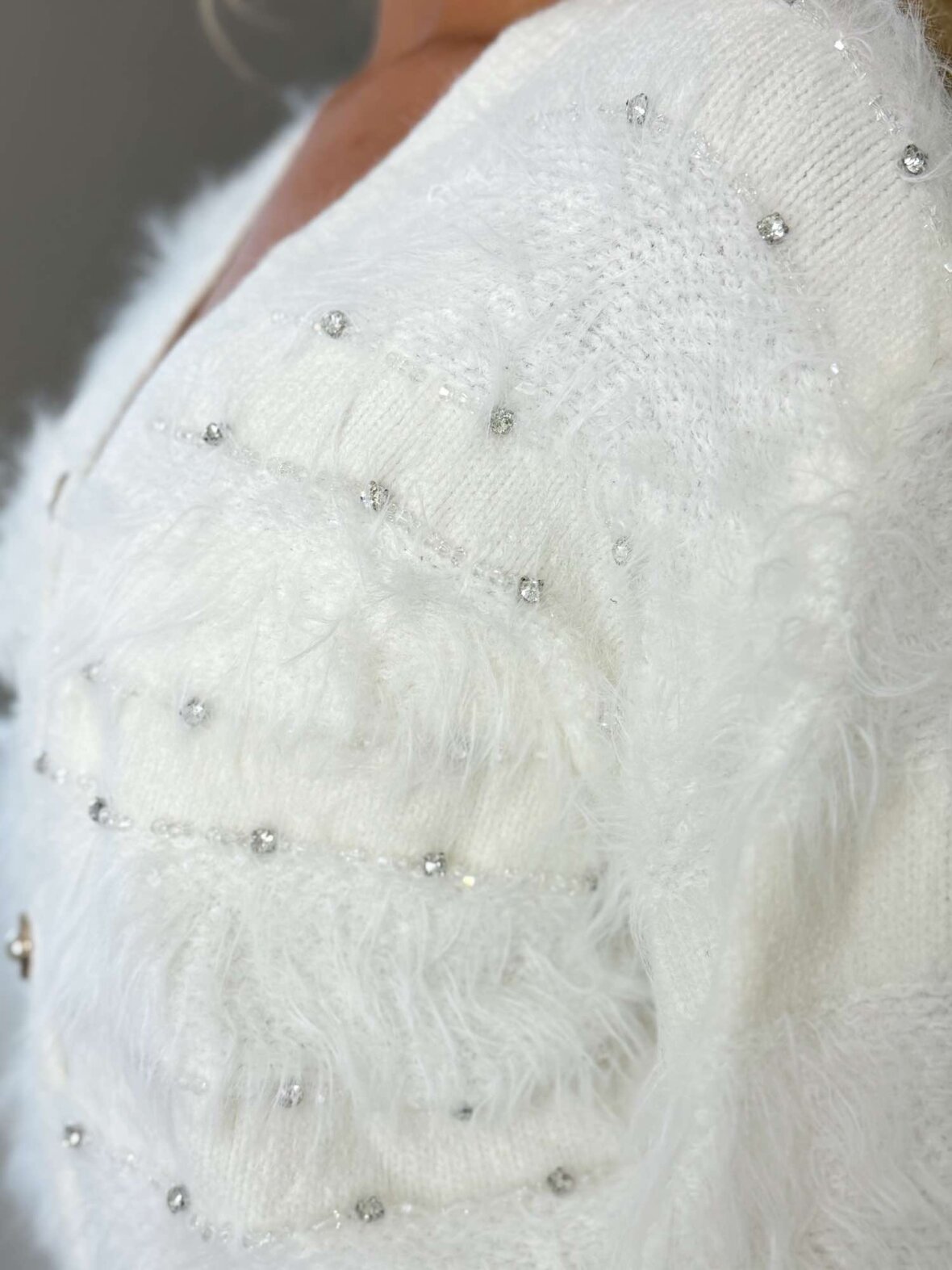Blød og fluffy hvid cardigan med elegante perle- og glitrende knapdetaljer. Denne strik er både varm og stilfuld med et unikt look, perfekt til kolde dage, hvor du ønsker ekstra glamour. Kombinér den med jeans eller nederdel for et afslappet og feminint outfit.