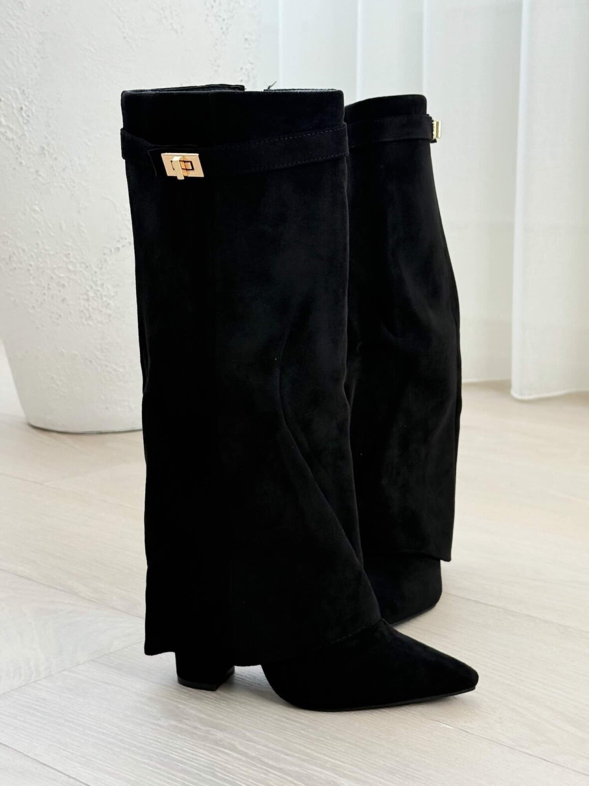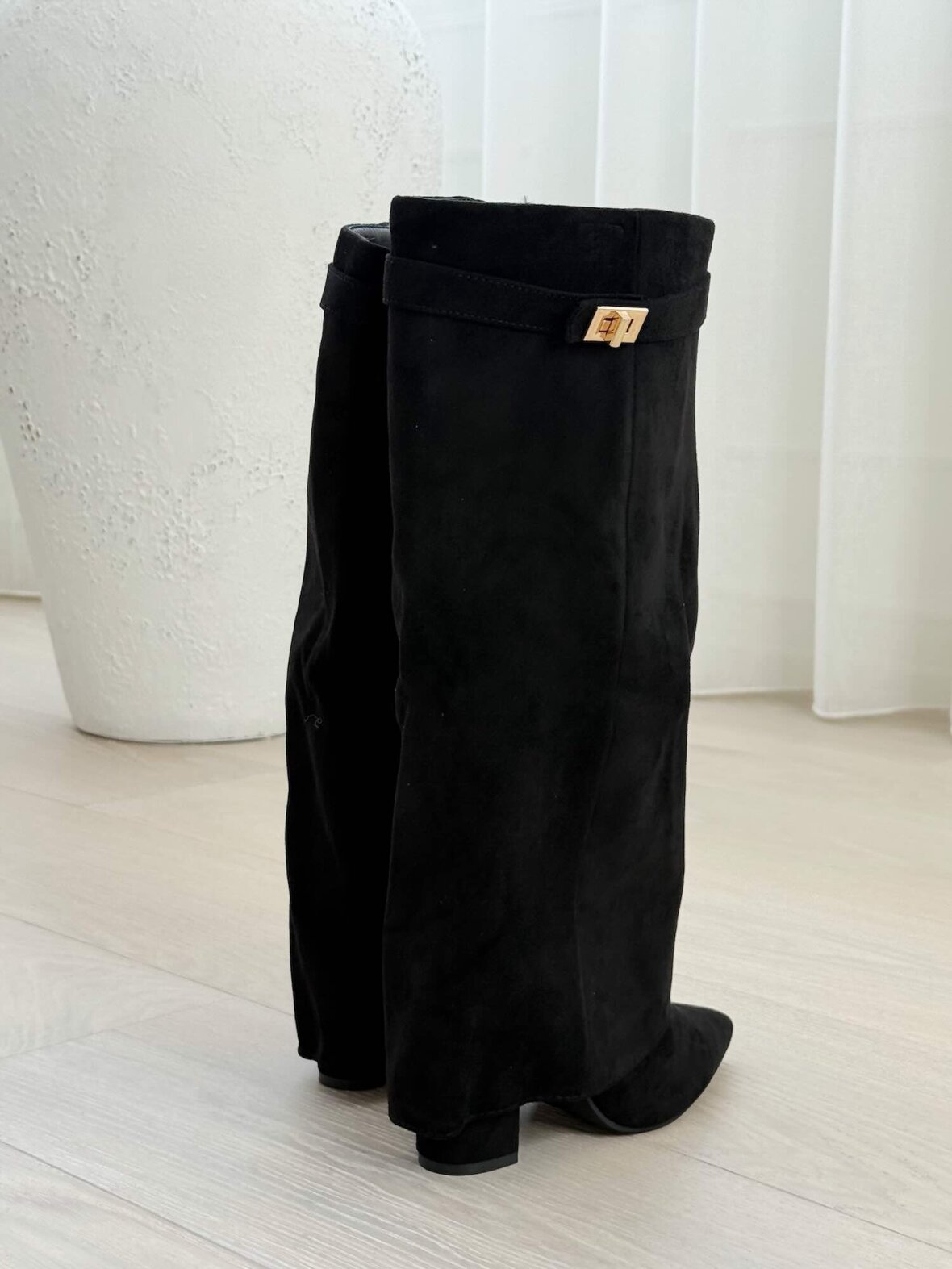 Disse elegante støvler i ruskindslook kombinerer stil og komfort til perfektion. Med et smart spænde øverst og en diskret lynlås på siden er de både funktionelle og fashionable. Perfekte til både hverdagsbrug og festlige anledninger, hvor du vil tilføre et sofistikeret præg. Let spids tå og lav hæl for ekstra komfort hele dagen.