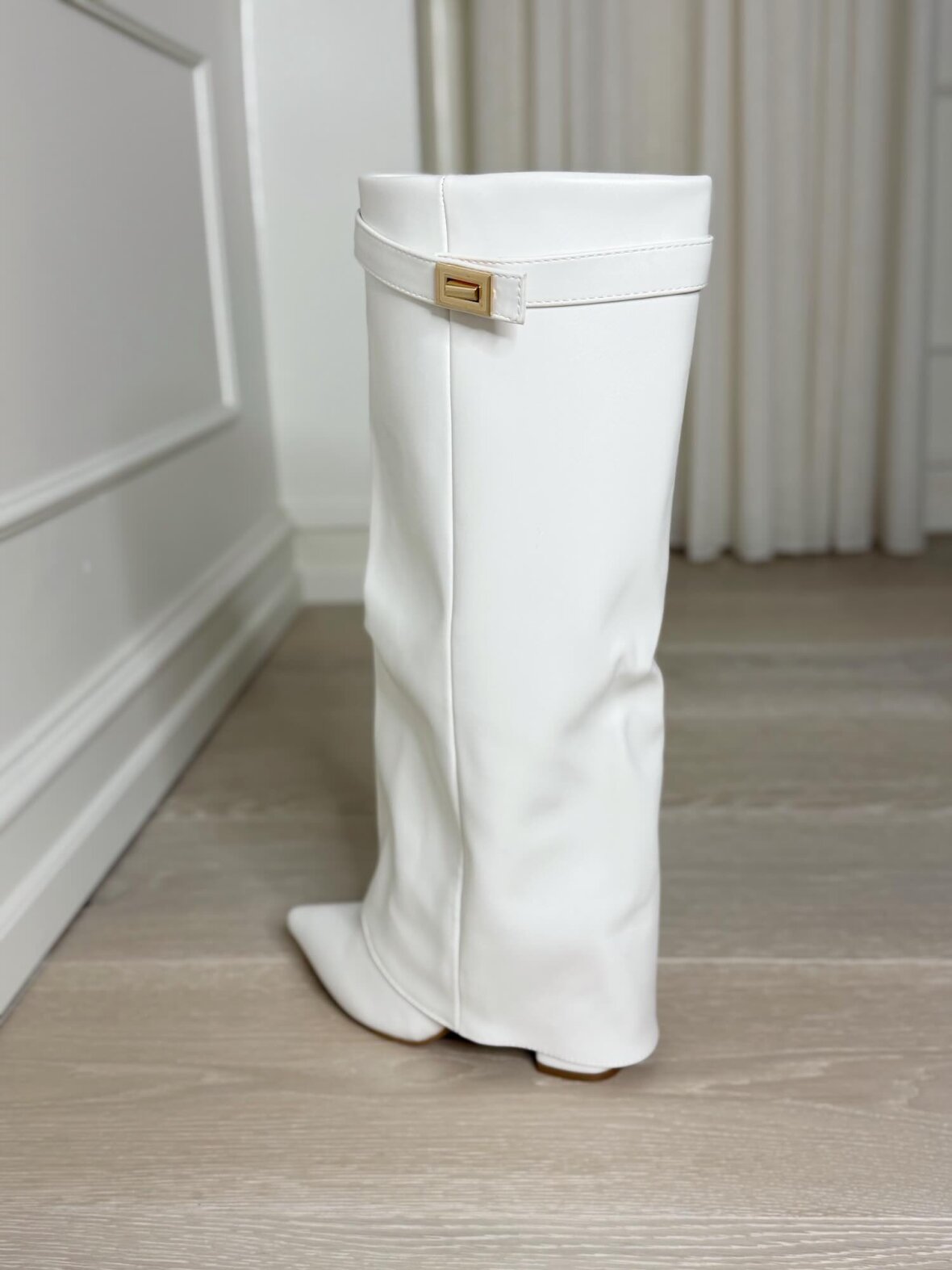 Disse elegante hvide knæhøje støvler fra Buch Copenhagen har et stilrent og feminint design med spids snude og lige skaft, der giver et eksklusivt og moderne udtryk. Støvlerne er udført i et glat materiale med en dekorativ rem og spænde ved skaftets top, som tilfører en raffineret detalje. Den indvendige lynlås gør dem nemme at tage af og på, mens pasformen sidder flot omkring benet. Perfekte til både kjoler, nederdele og bukser – et elegant valg til både hverdag og festlige anledninger.