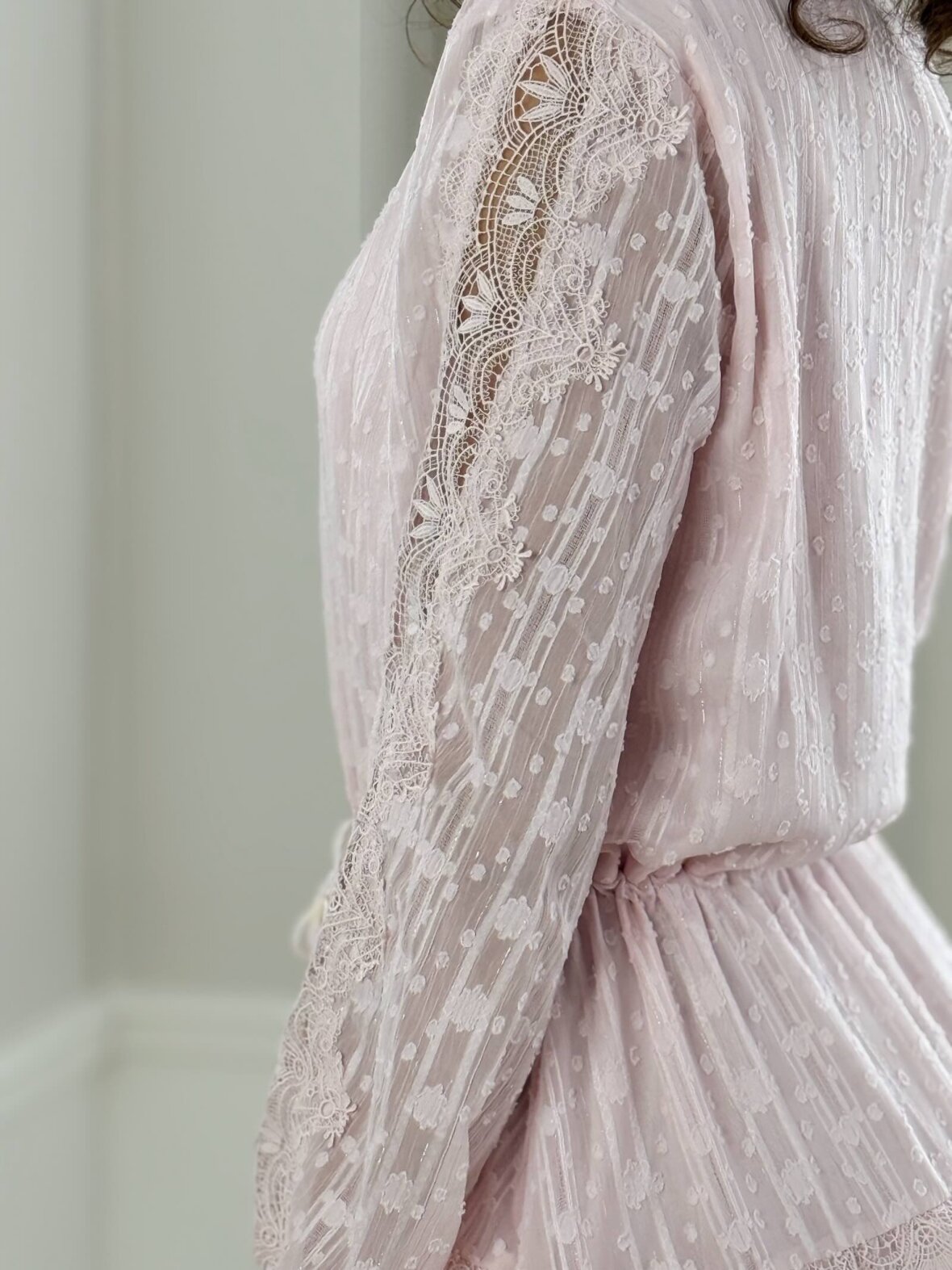 En romantisk lyserød kjole med fine detaljer og et feminint snit. Kjolen har knapper hele vejen ned, lange ærmer med elastik ved håndleddene og bindebånd i taljen. De diskrete blonder og let transparente stof skaber et let og sommerligt udtryk.