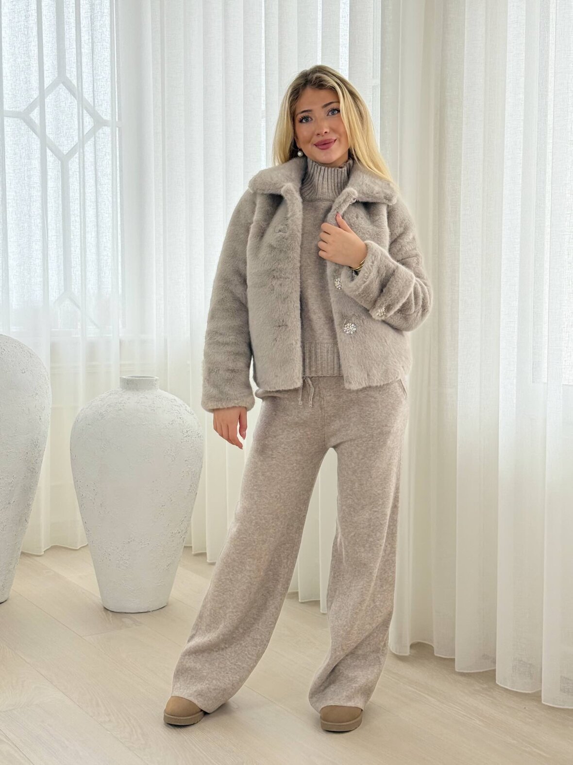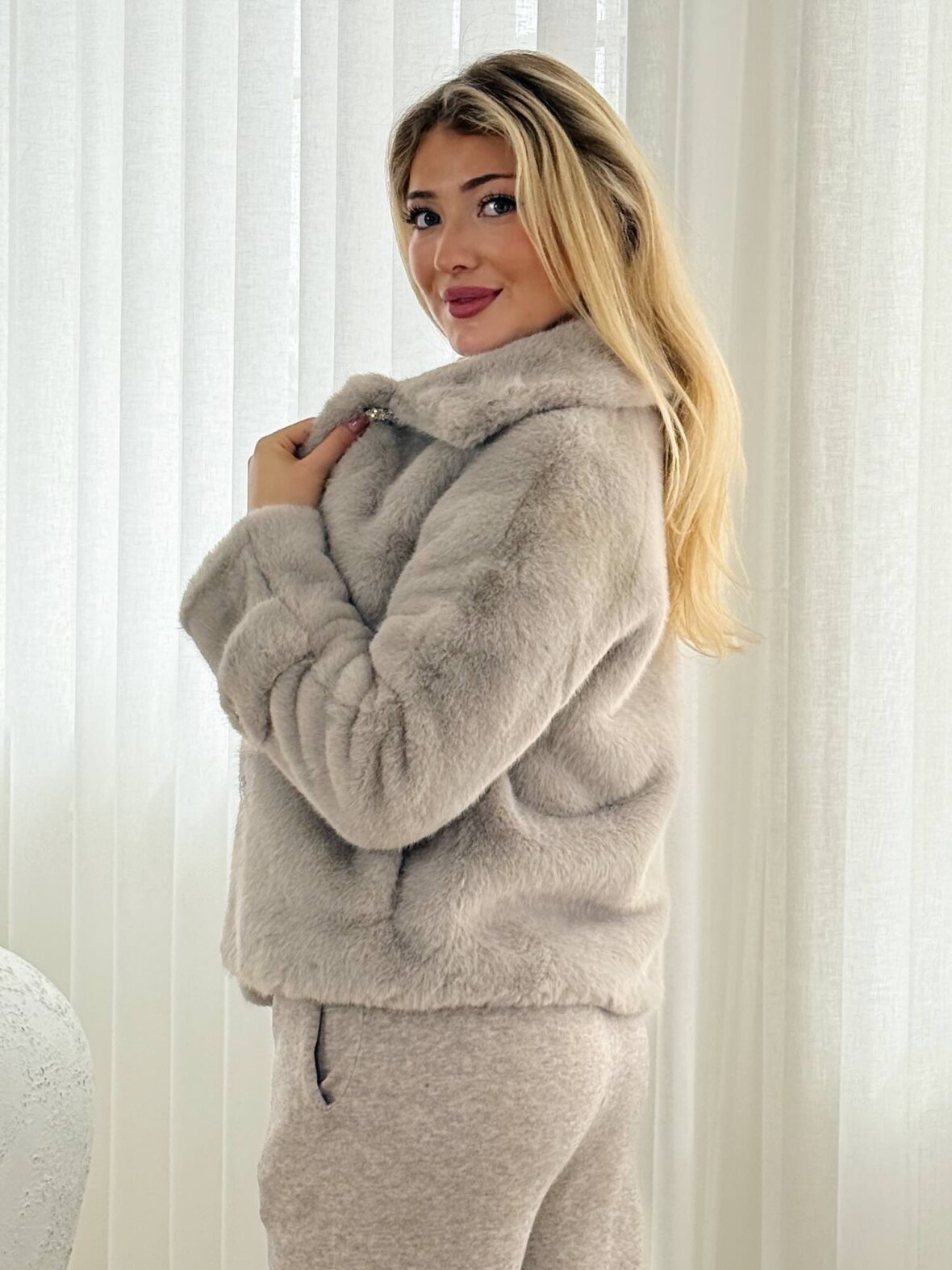 Kort, eksklusiv tætsiddende fake fur-jakke i en sten grå, elegant nuance. Designet med klassisk krave og skjulte lukninger, som giver et sofistikeret og rent udtryk. Perfekt til både hverdagsbrug og aftenlooks, hvor du ønsker at tilføre varme og luksus til outfittet.