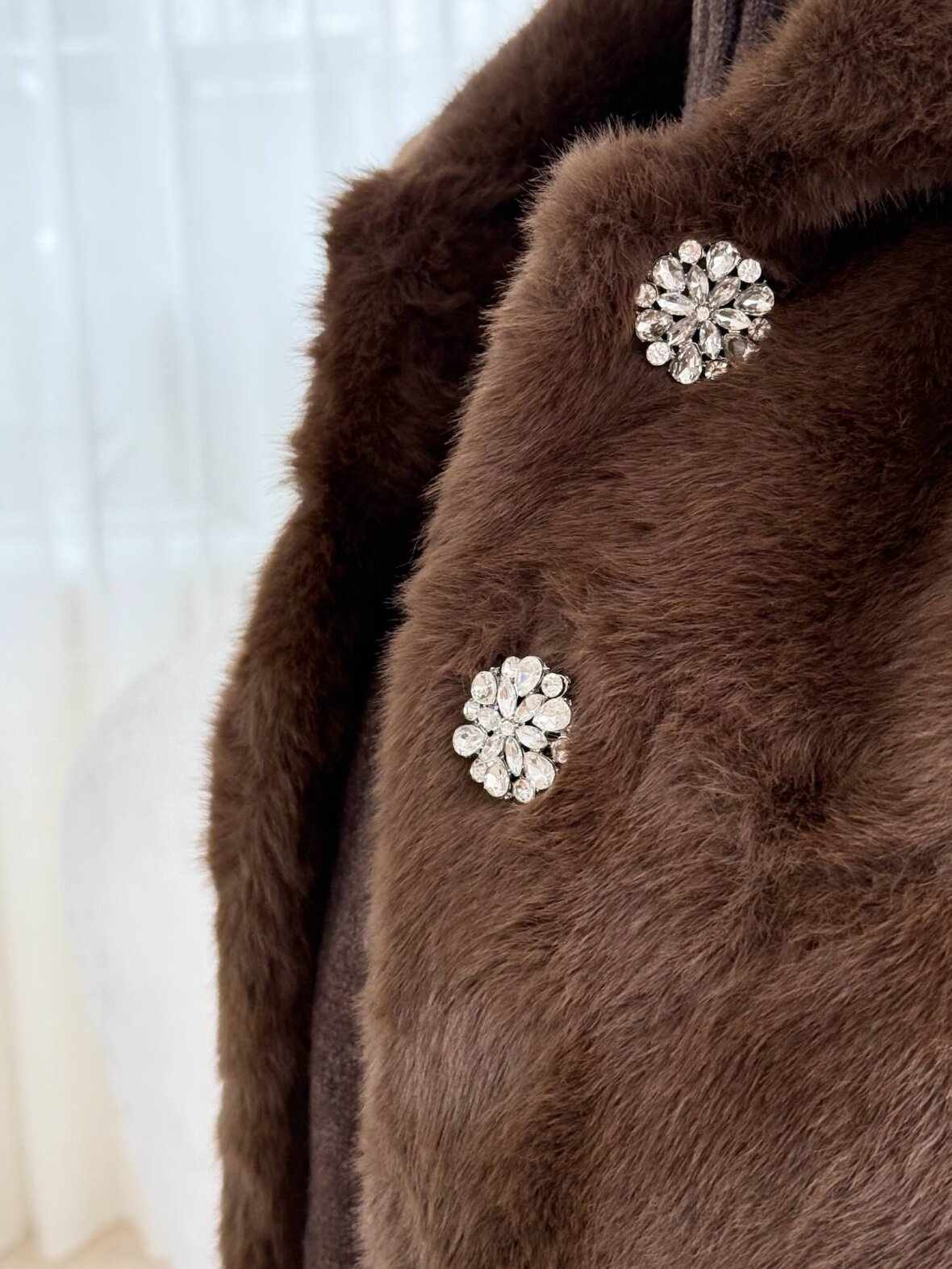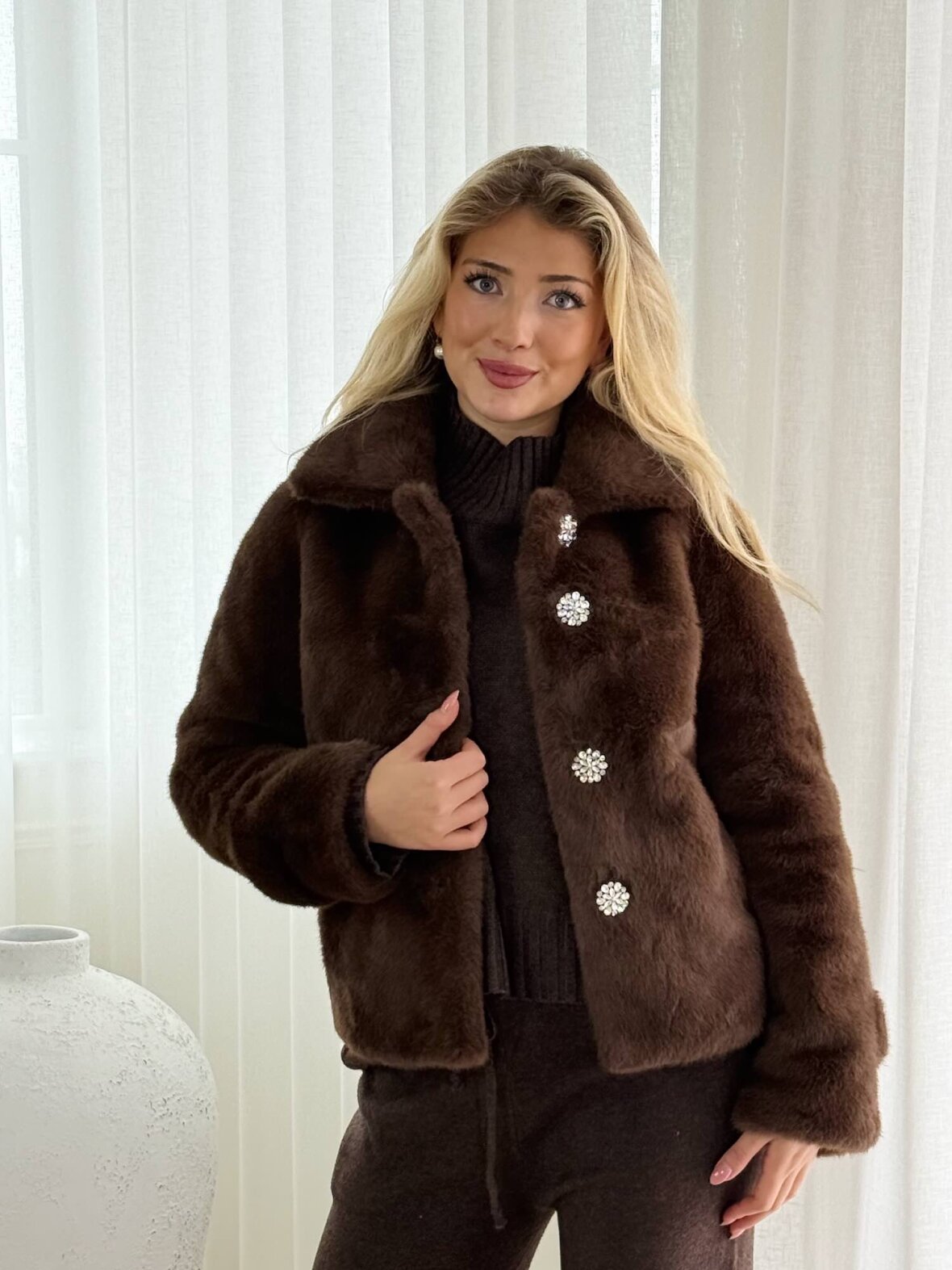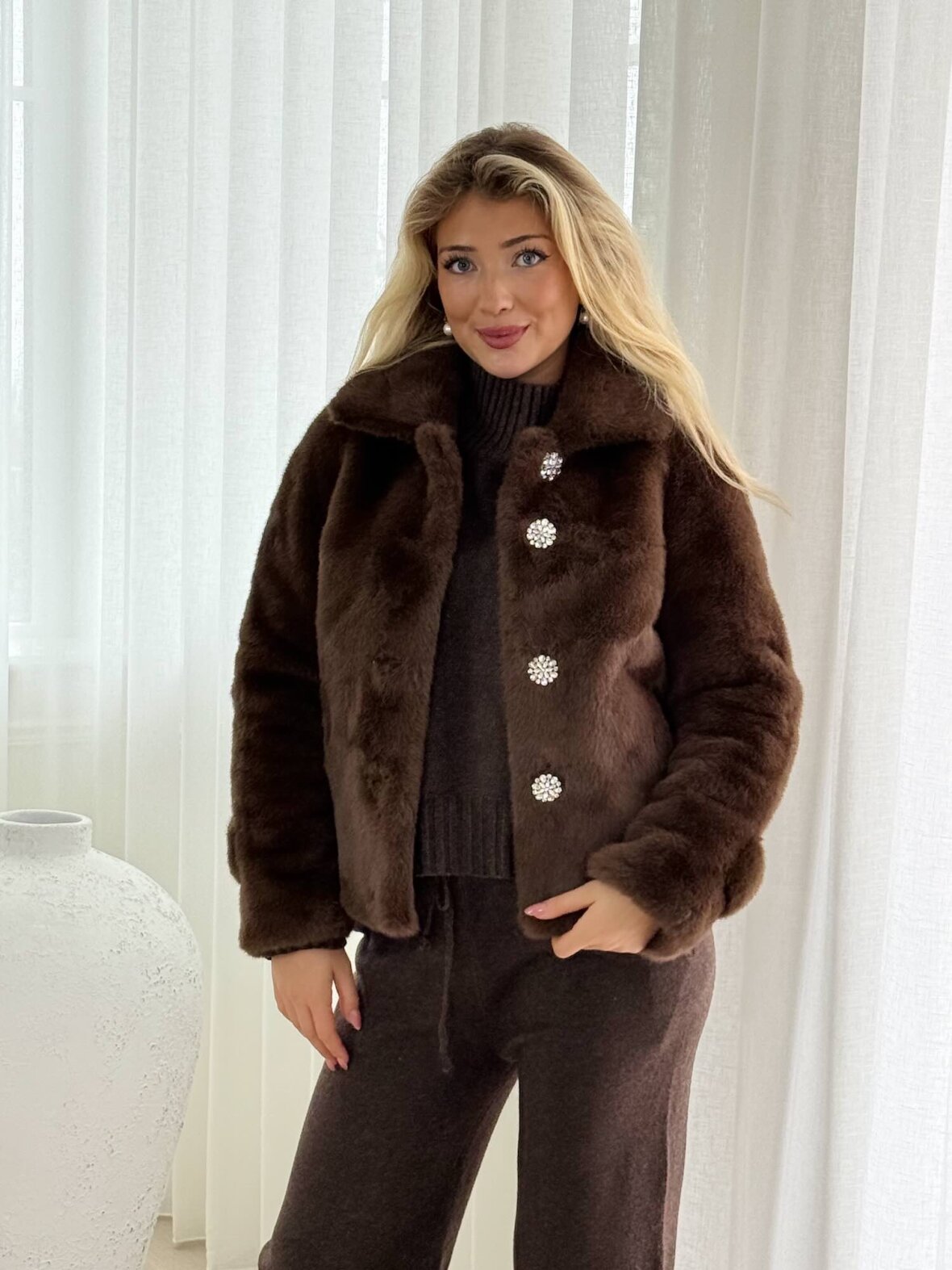 Kort, eksklusiv tætsiddende fake fur-jakke i enchokolade elegant nuance. Designet med klassisk krave og skjulte lukninger, som giver et sofistikeret og rent udtryk. Perfekt til både hverdagsbrug og aftenlooks, hvor du ønsker at tilføre varme og luksus til outfittet.