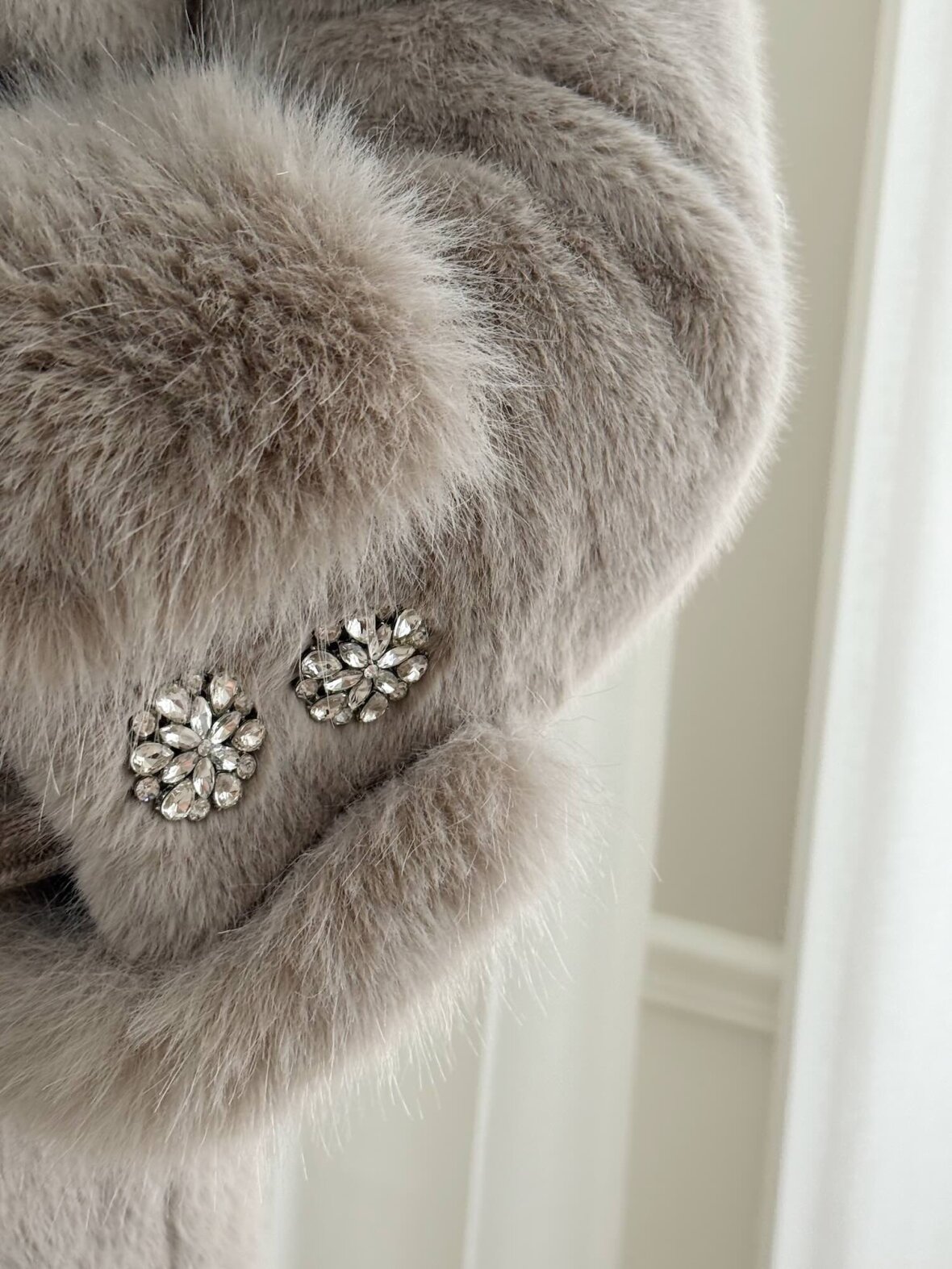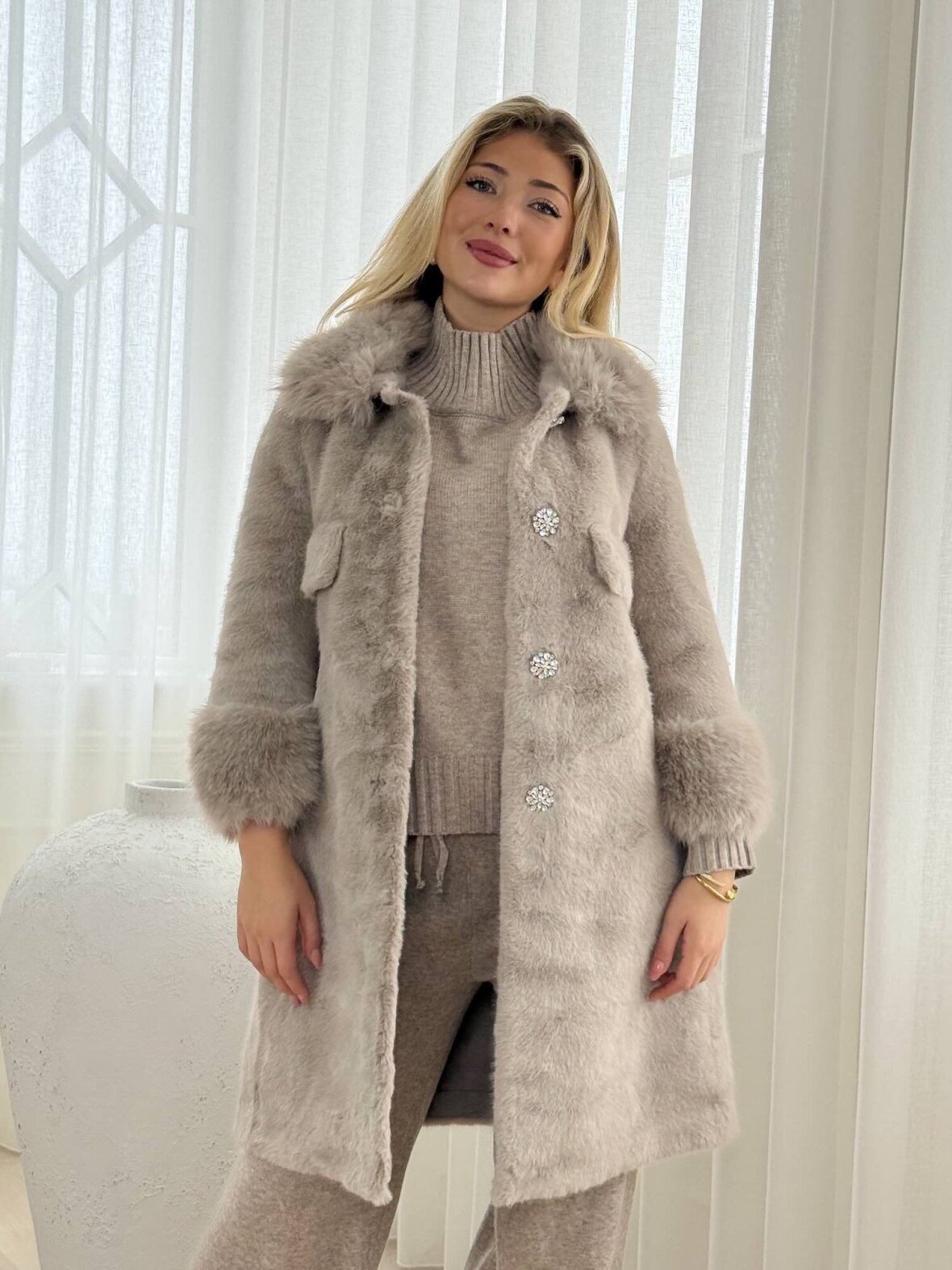 Luksuriøs lang tætsiddende fake fur jakke i den elegante farve stone. Pelskrave og ærmekanter tilfører et eksklusivt udtryk, mens krystalinspirerede knapper understreger det feminine look. En del af Buch Lux kollektionen.
