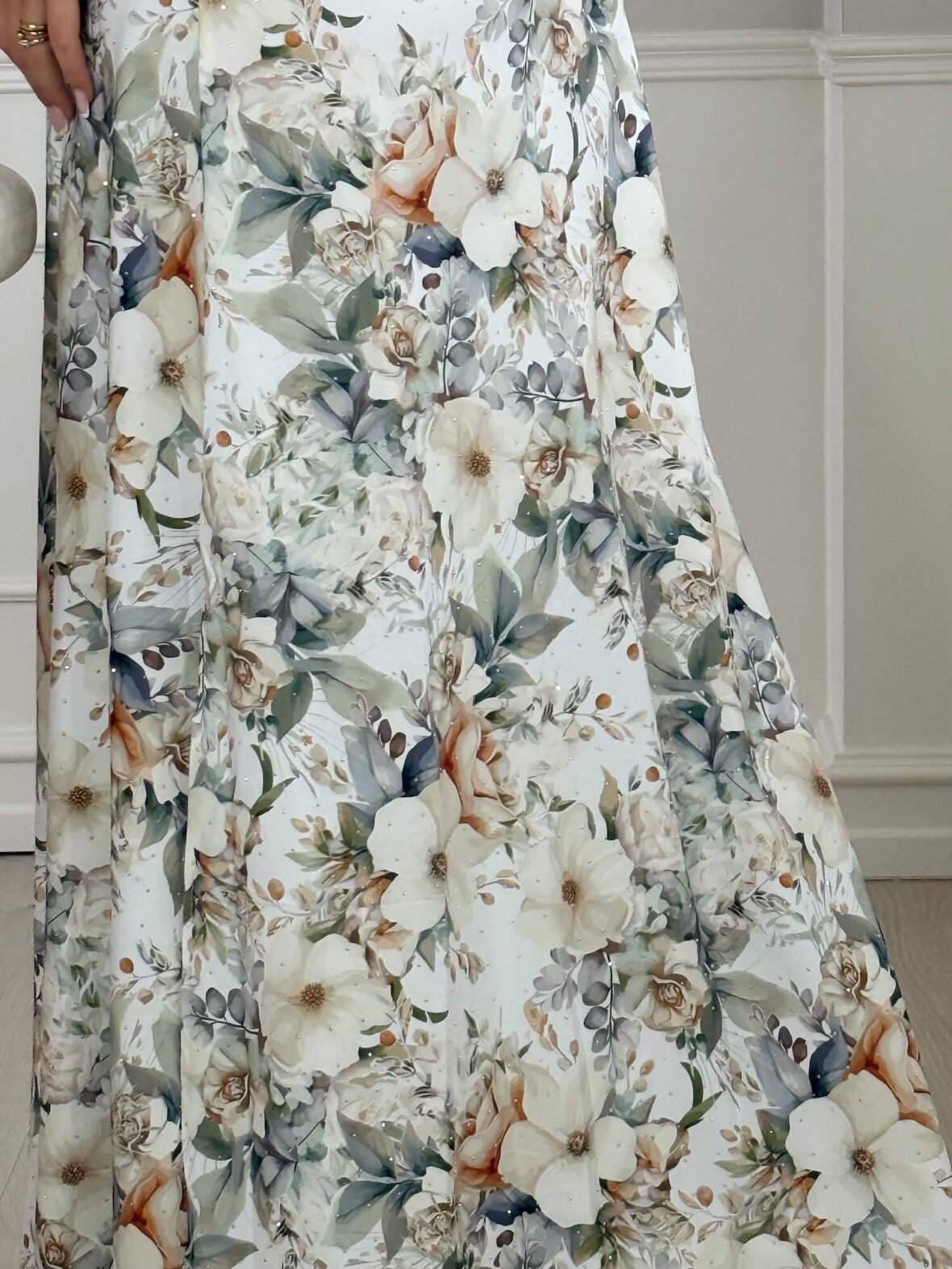 Denne elegante maxikjole fra Buch Copenhagen er designet i en let og smukt faldende kvalitet med et romantisk blomsterprint i afdæmpede, naturlige nuancer. Den feminine V-udskæring kombineret med fine flæsedetaljer ved skuldrene giver et eksklusivt og sofistikeret udtryk, mens den lange silhuet skaber et elegant og flatterende fald. Slidsen i siden tilfører et let og luftigt look samt ekstra bevægelsesfrihed. En kjole, der er ideel til både sommerens særlige anledninger og stilfulde hverdage.
