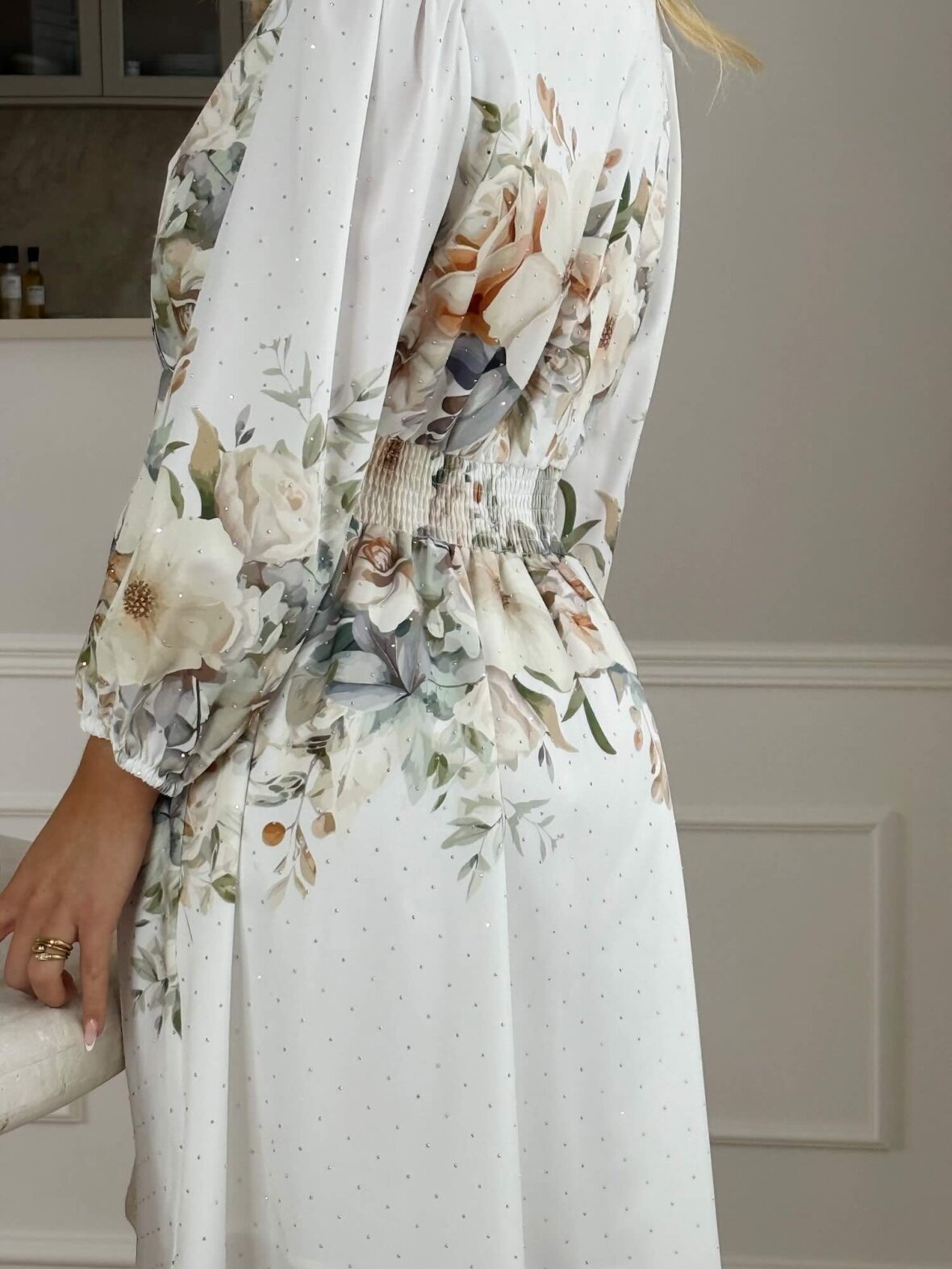 Denne feminine kjole fra Buch Copenhagen er designet i en let og luftig kvalitet med et romantisk blomsterprint i afdæmpede, eksklusive nuancer. Den elegante V-udskæring og den gennemknappede front skaber et sofistikeret udtryk, mens den markerede talje giver en smuk og flatterende pasform. De lange ærmer med let volumen tilfører et elegant touch og gør kjolen ideel til både hverdag og mere formelle anledninger. En alsidig og tidløs kjole, der kombinerer komfort, elegance og feminin charme.