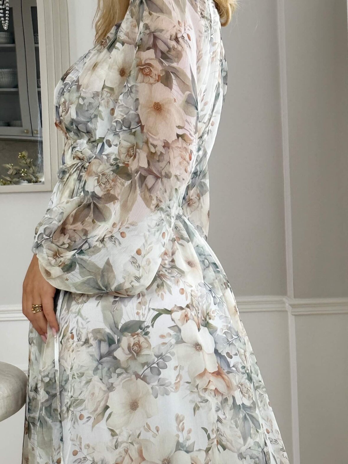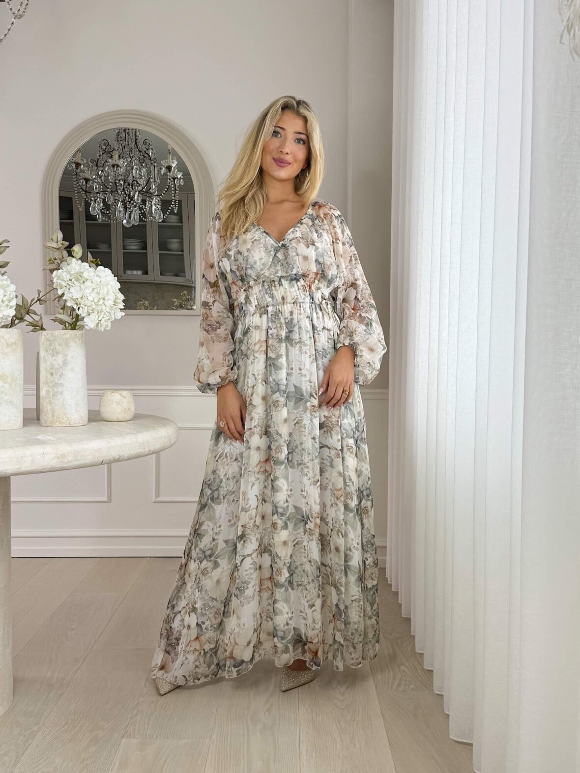 Denne smukke maxikjole fra Buch Copenhagen er designet i et let, luftigt materiale med et romantisk blomsterprint i afdæmpede, harmoniske nuancer. Kjolen har en feminin V-udskæring og en elastisk talje, der smukt fremhæver figuren og giver en behagelig pasform. De lange, let transparente ærmer tilfører et elegant og sofistikeret udtryk, mens det lange, flowy skørt skaber en yndefuld bevægelse. En alsidig kjole, der er perfekt til både hverdagsbrug, sommerens begivenheder og festlige anledninger.