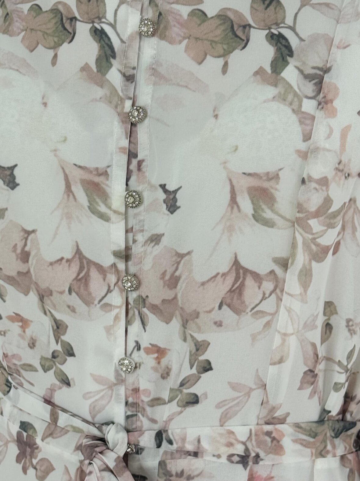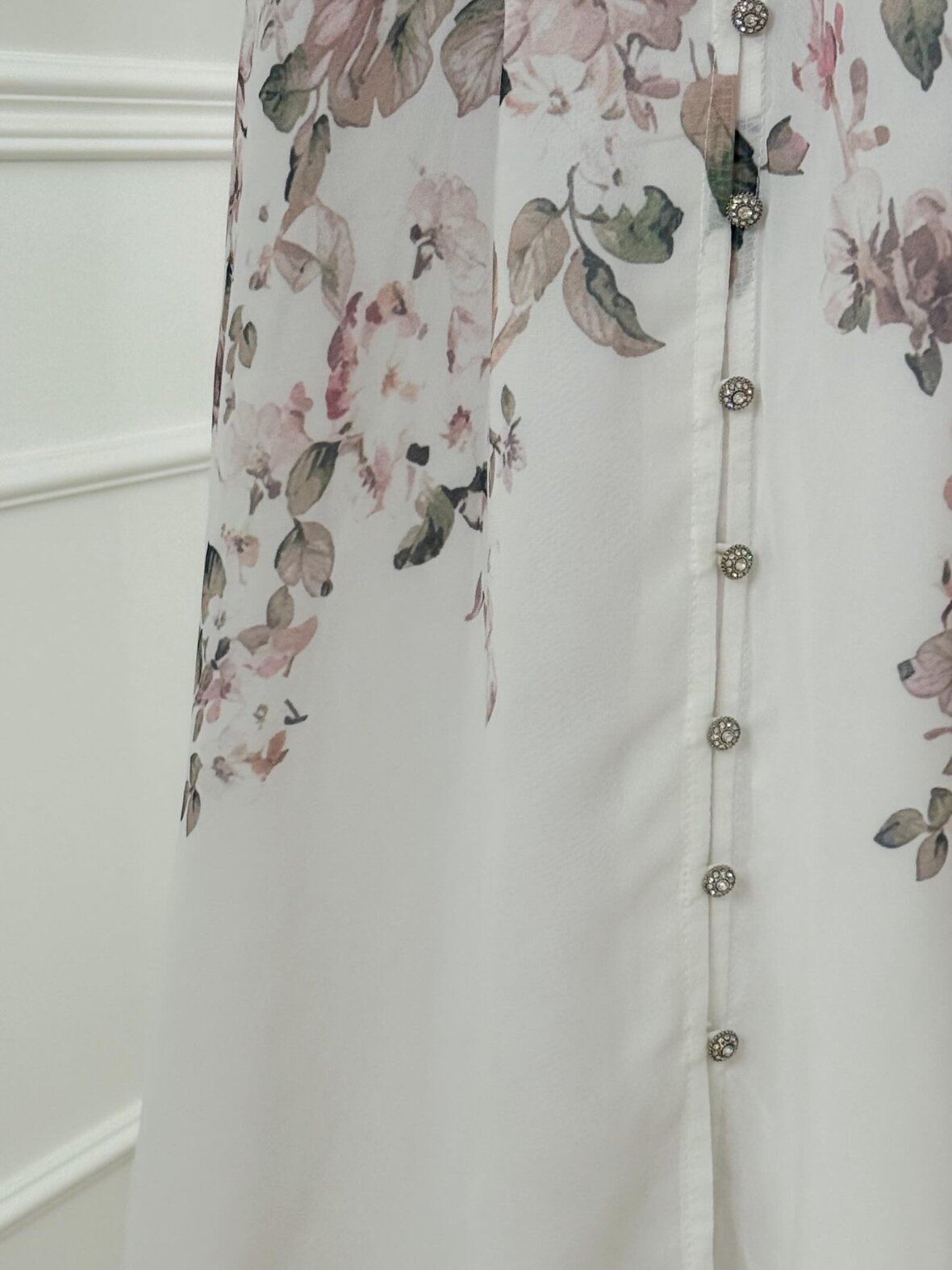 Lang hvid kjole med romantisk blomsterprint i sarte nuancer. Kjolen har gennemgående perleknapper, bindebånd i taljen og smock-detaljer ved manchetterne, som fremhæver det feminine snit. Perfekt til alt fra hverdagsbrug til sommerens fester.