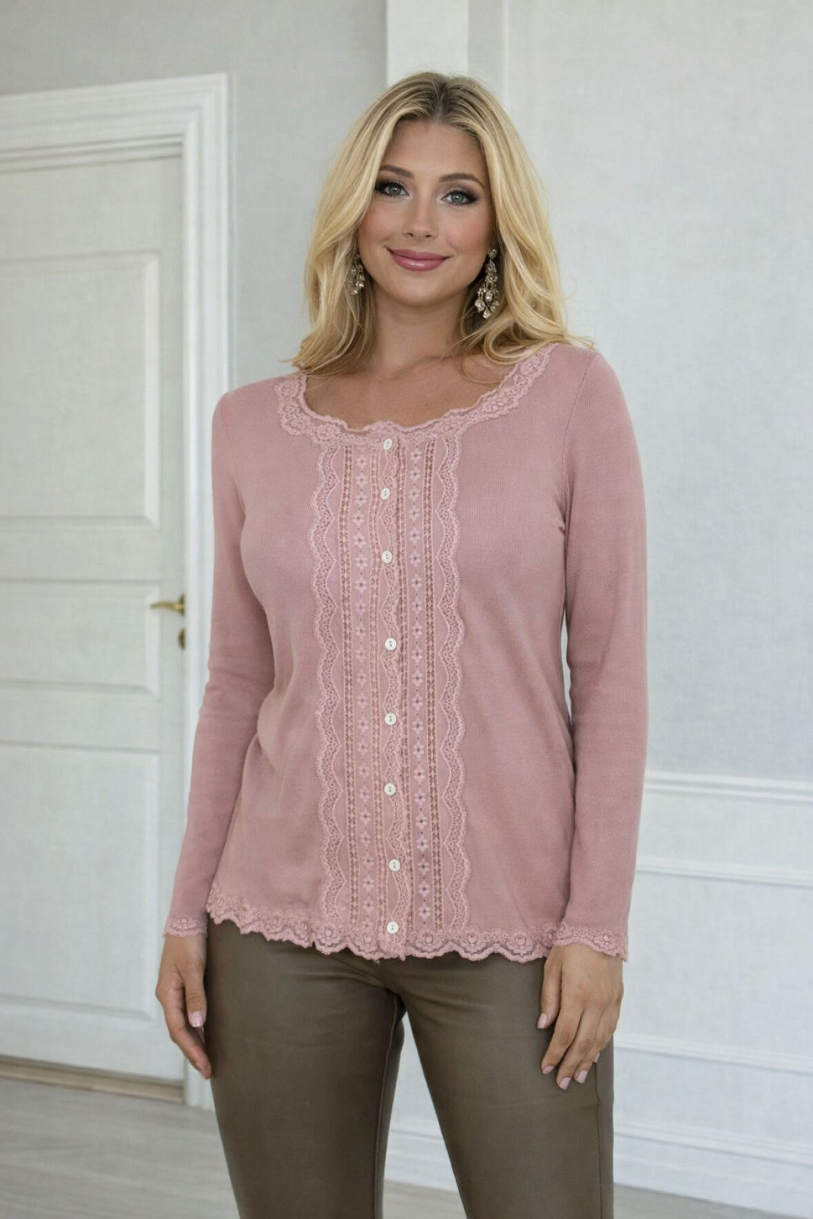 Elegant rosa cardigan i blød rib med fine blondedetaljer foran. Designet har gennemgående knaplukning, bølgekant forneden og ved ærmer samt smuk blondekant i halsudskæringen. Perfekt som et feminint lag over toppe, kjoler eller bluser. En del af Buch Basic.
