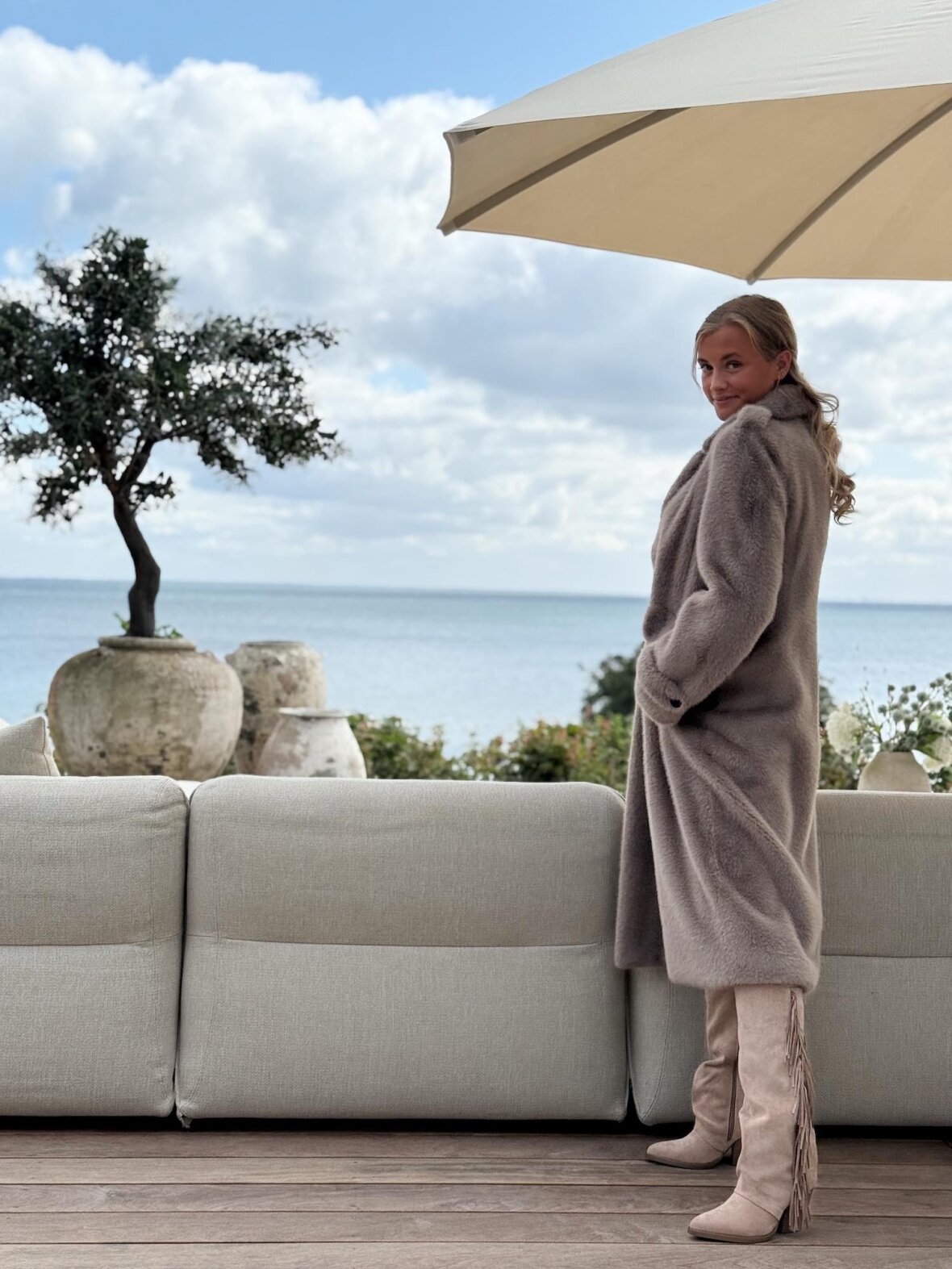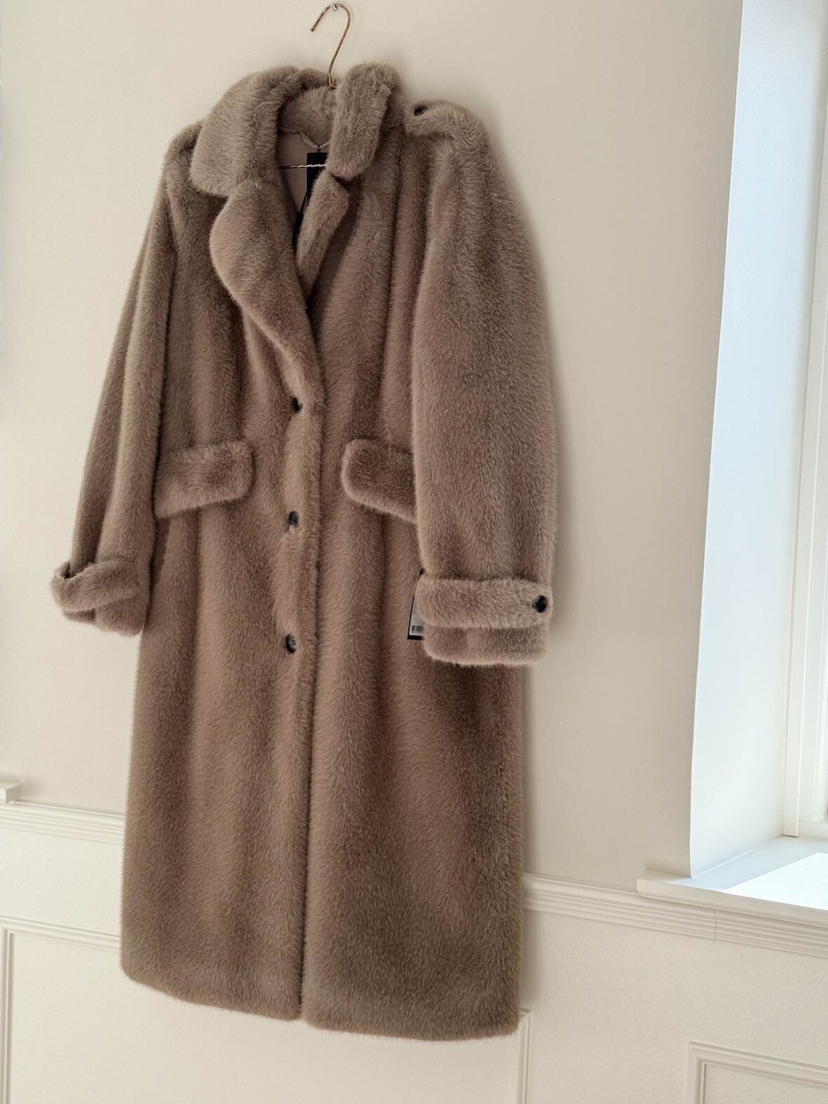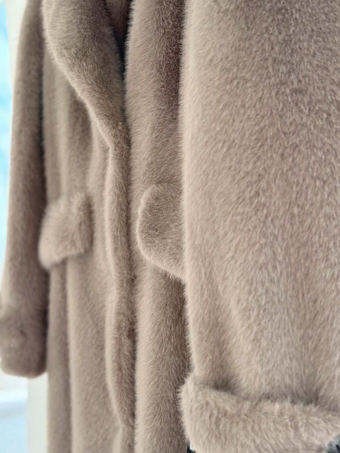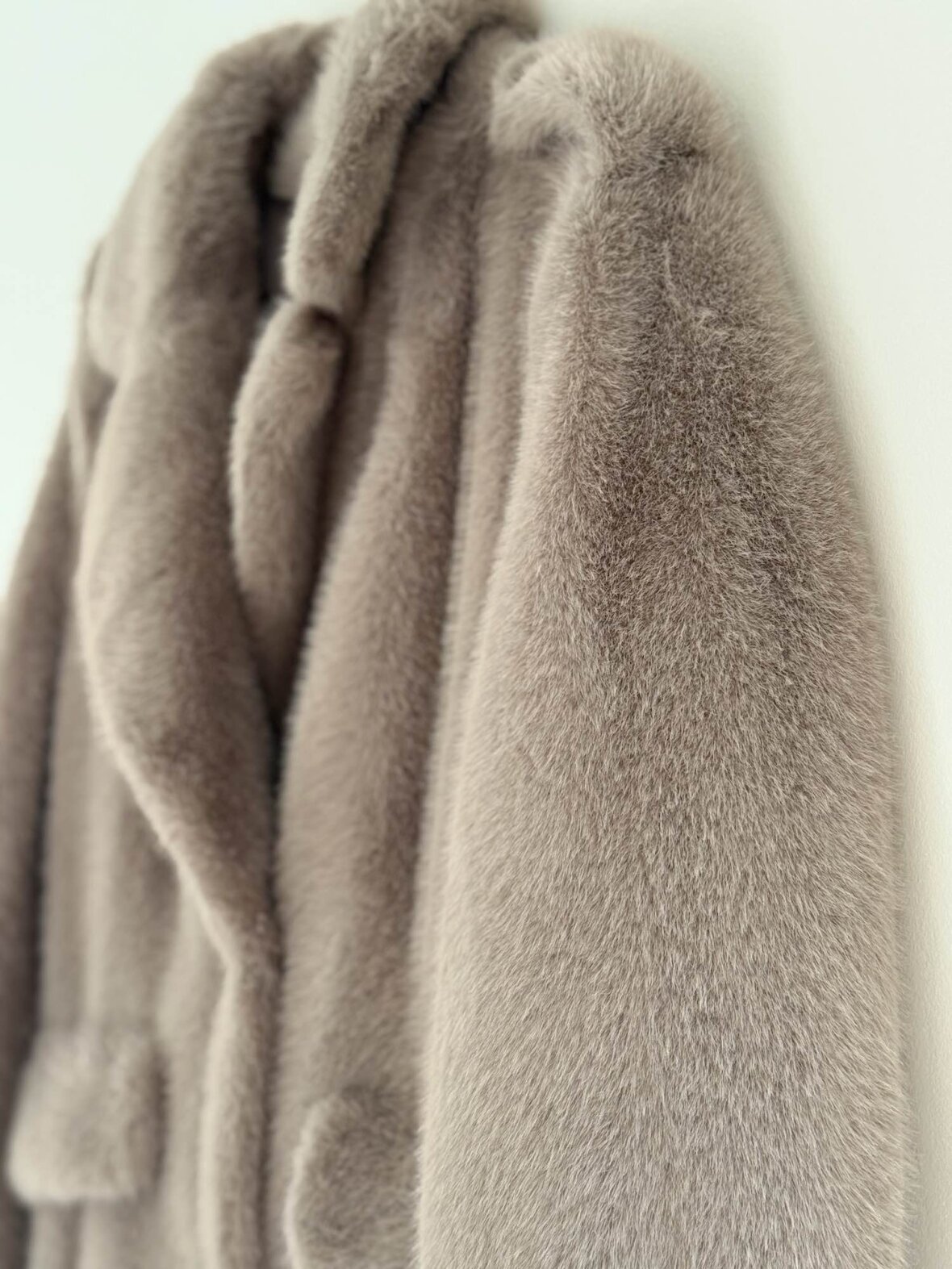 Lækker og stilfuld faux fur frakke i en varm taupe nuance. Modellen har klassisk krave, lommer og knaplukning foran, der giver et tidløst udtryk. De elegante manchetter med knapdetaljer fuldender designet og tilfører et eksklusivt touch. En frakke, der både luner og løfter ethvert outfit – perfekt til efterår og vinter med fokus på komfort og luksus.