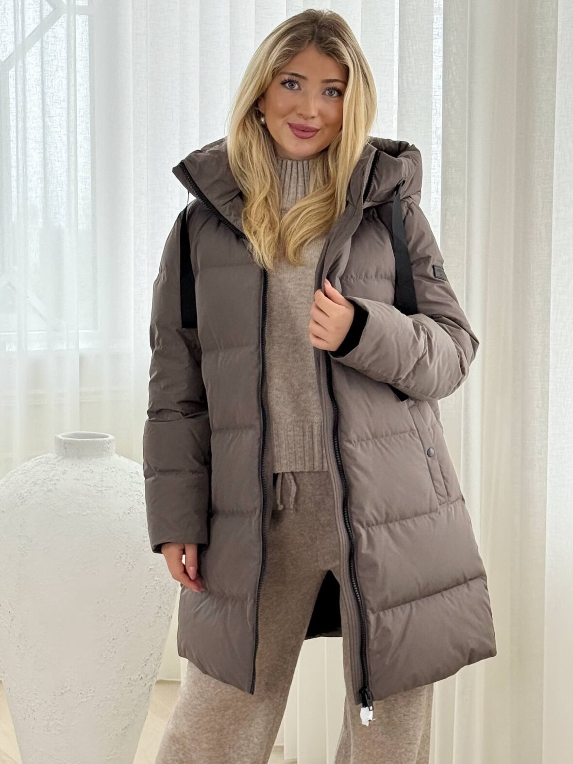 Kort, varm dunjakke fra Rock and Blue i en smuk chokoladebrun nuance. Vandafvisende med BIONIC-FINISH®ECO teknologi. Den har en flatterende pasform med praktiske lommer, høj krave og sort lynlåsdetalje. Perfekt til kolde dage, hvor du vil føle dig både beskyttet og stilfuld. Matcher flot med alt fra jeans til skindleggings.