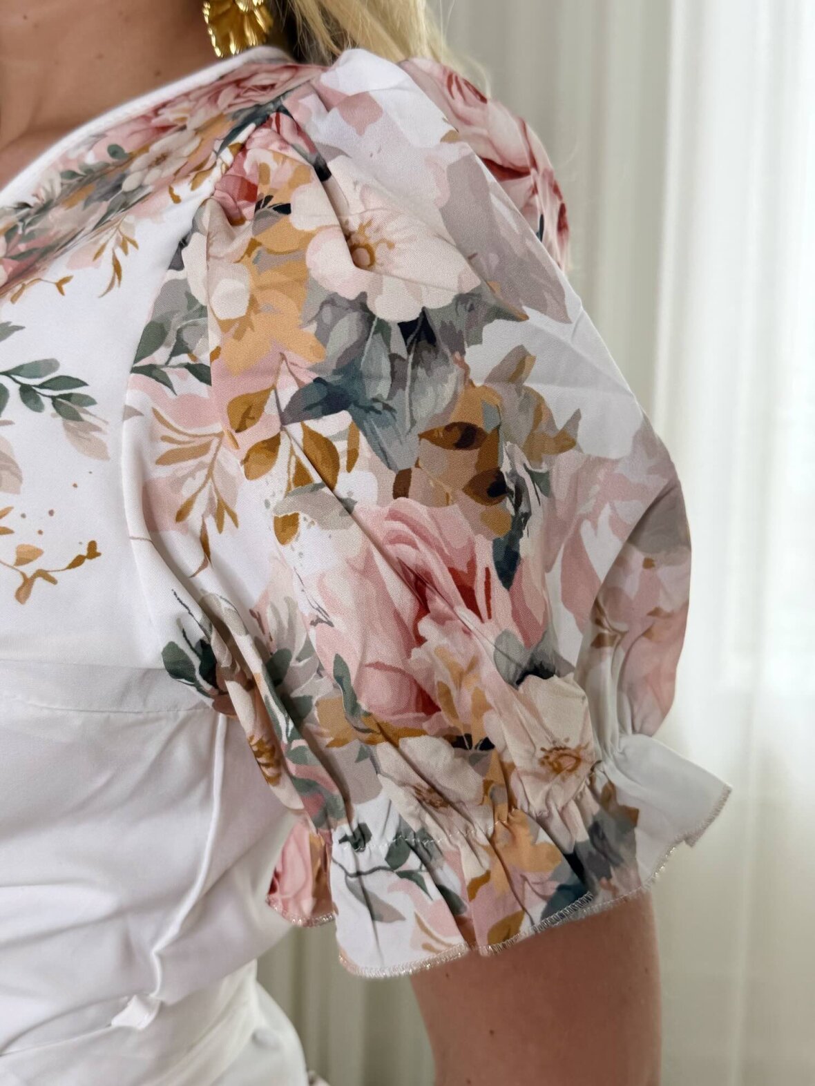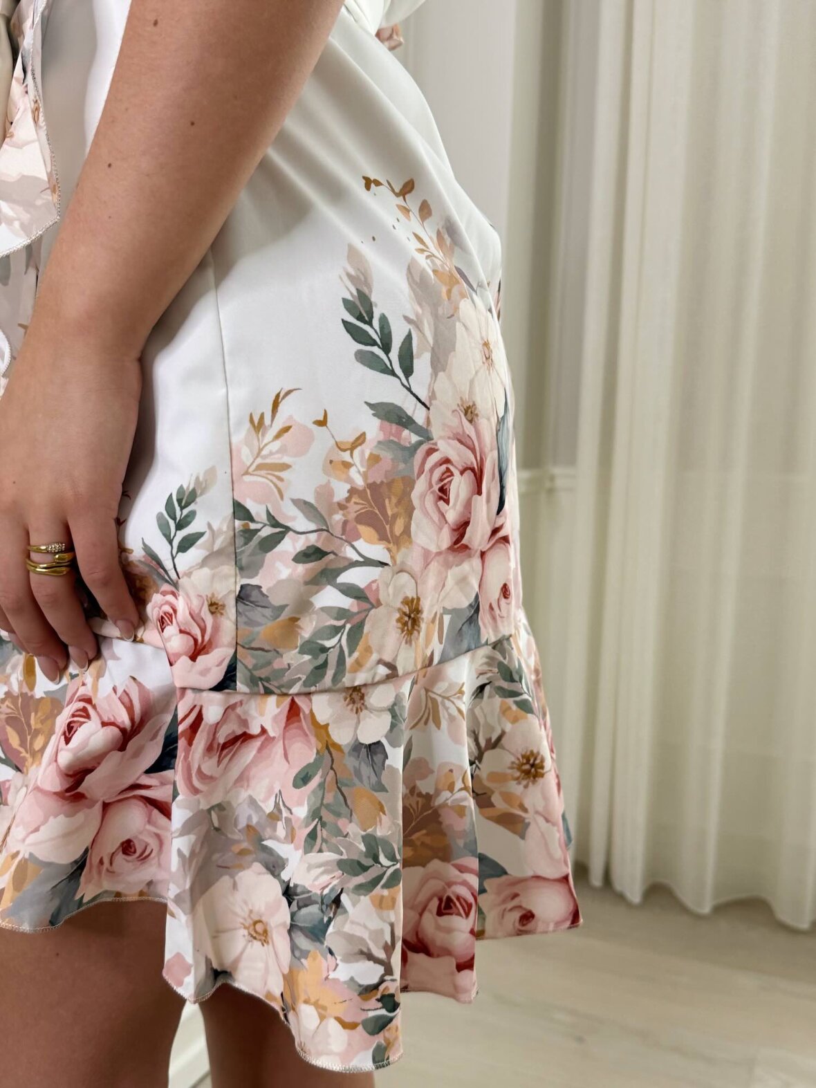 Feminin wrap kjole 2026 med smukt blomsterprint i bløde rosa og beige nuancer. Den flatterende slå-om-effekt og bindebælte i taljen fremhæver silhuetten, mens de lette ærmer og fine flæsedetaljer giver et romantisk udtryk. Perfekt til sommerfester, bryllupper og elegante hverdagslooks.