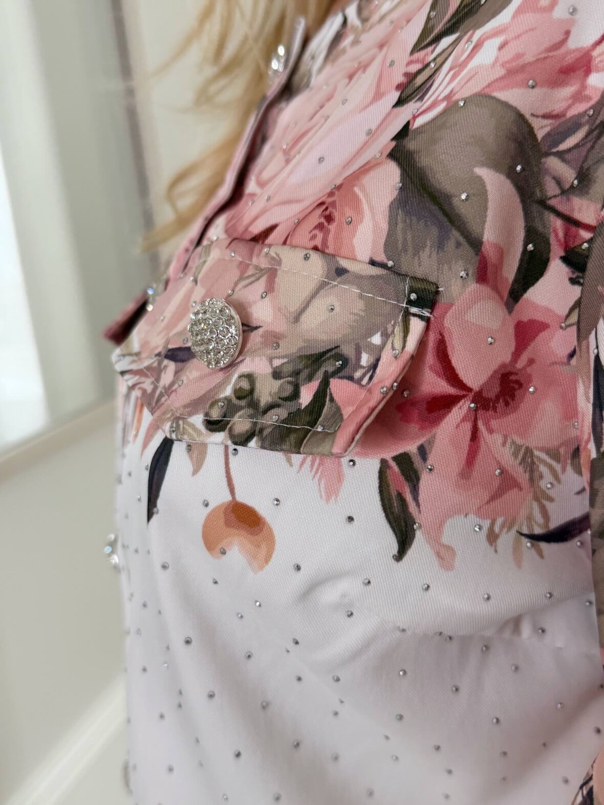 Elegant kort jakke med små sten smukt blomsterprint i rosa nuancer over skuldre og bryst. Den runde hals og dekorative knapper fuldender det romantiske udtryk. Perfekt over en kjole eller til højtaljede bukser for et sofistikeret look.