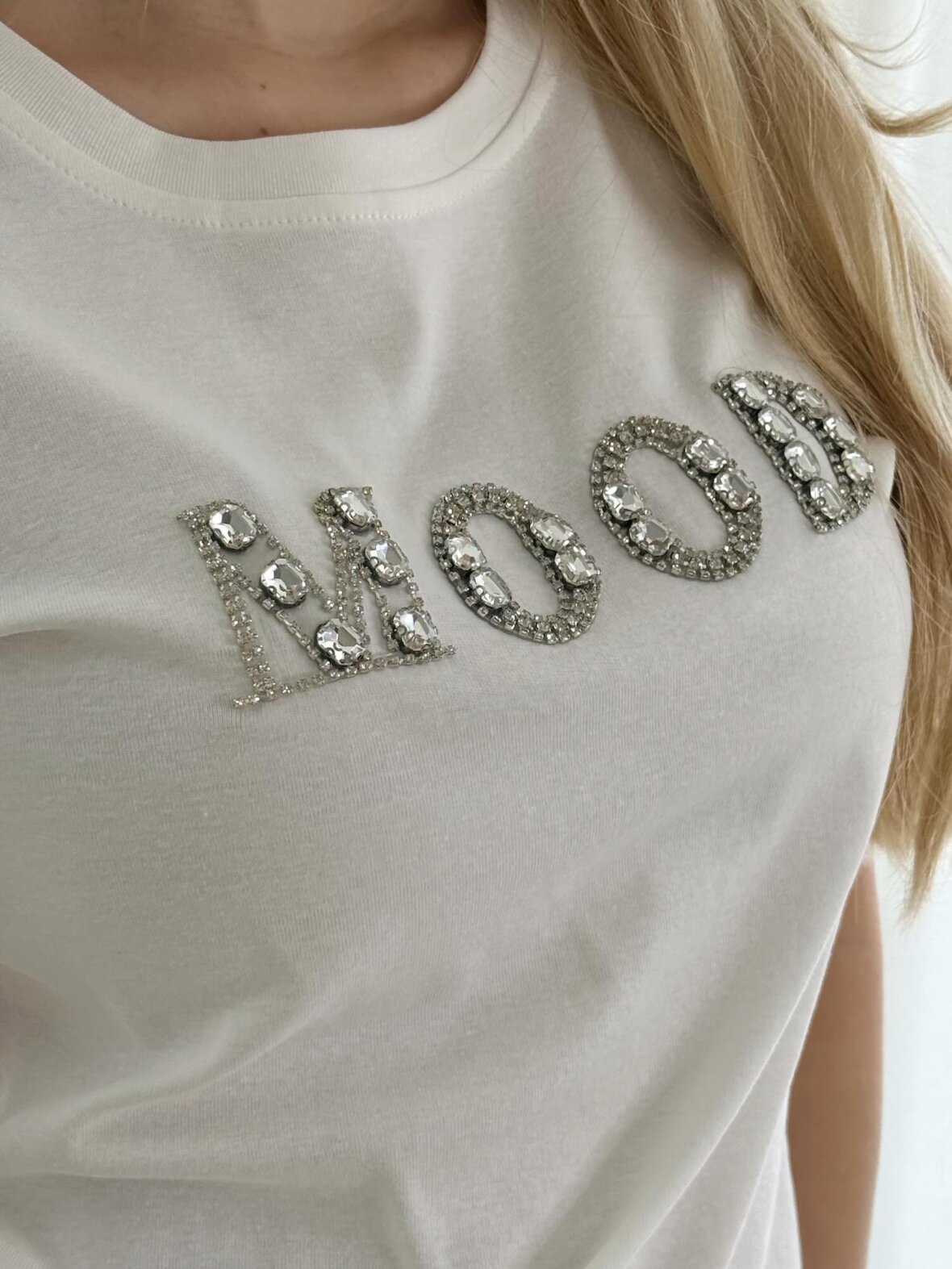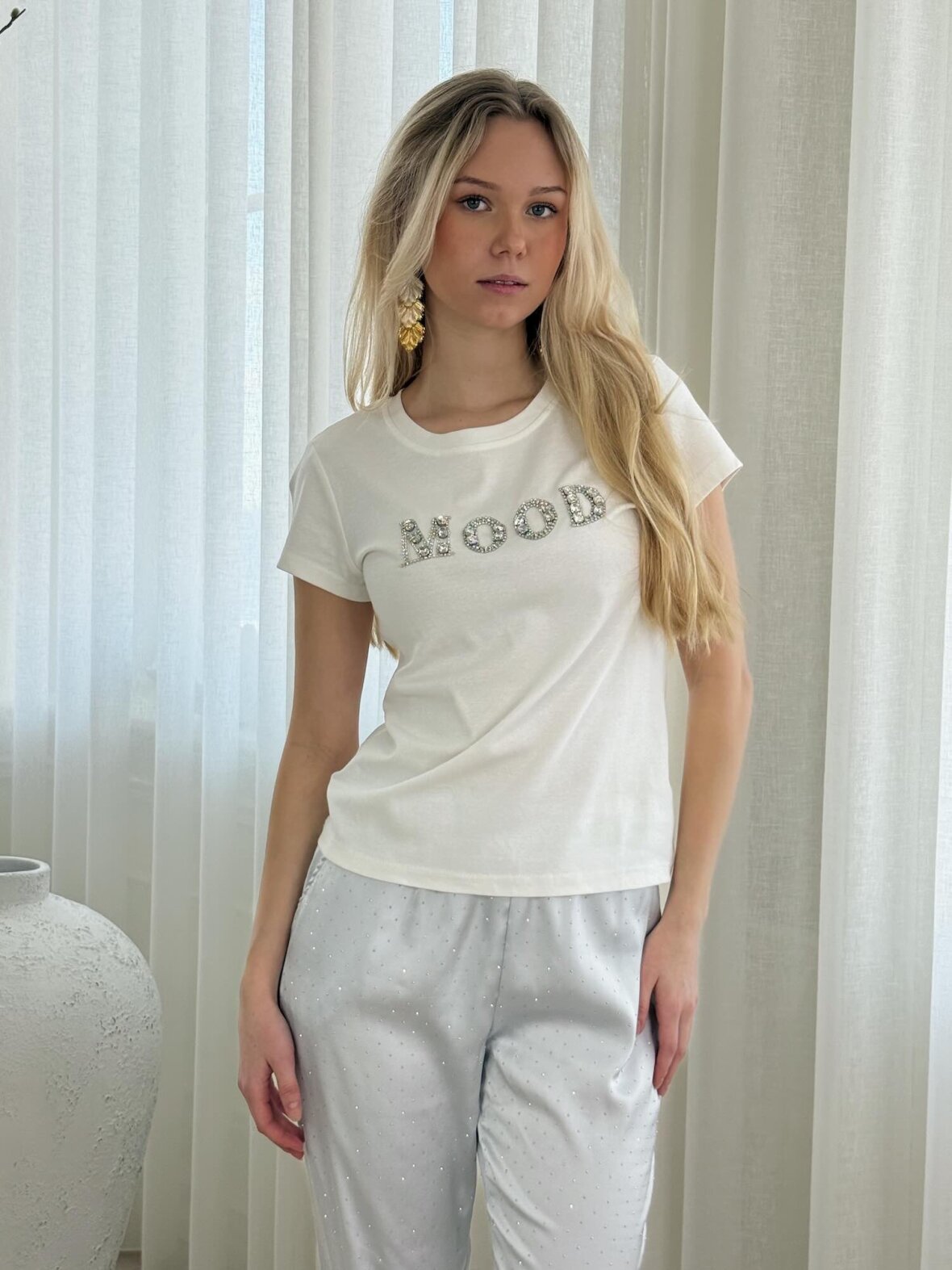 Cool og feminin T-shirt i blød bomuld med stræk og glitrende MOOD-sten foran. Den klassiske pasform og korte ærmer gør den nem at style både til hverdag og fest. Brug den med jeans, nederdel eller shorts for et casual, men stilfuldt look.