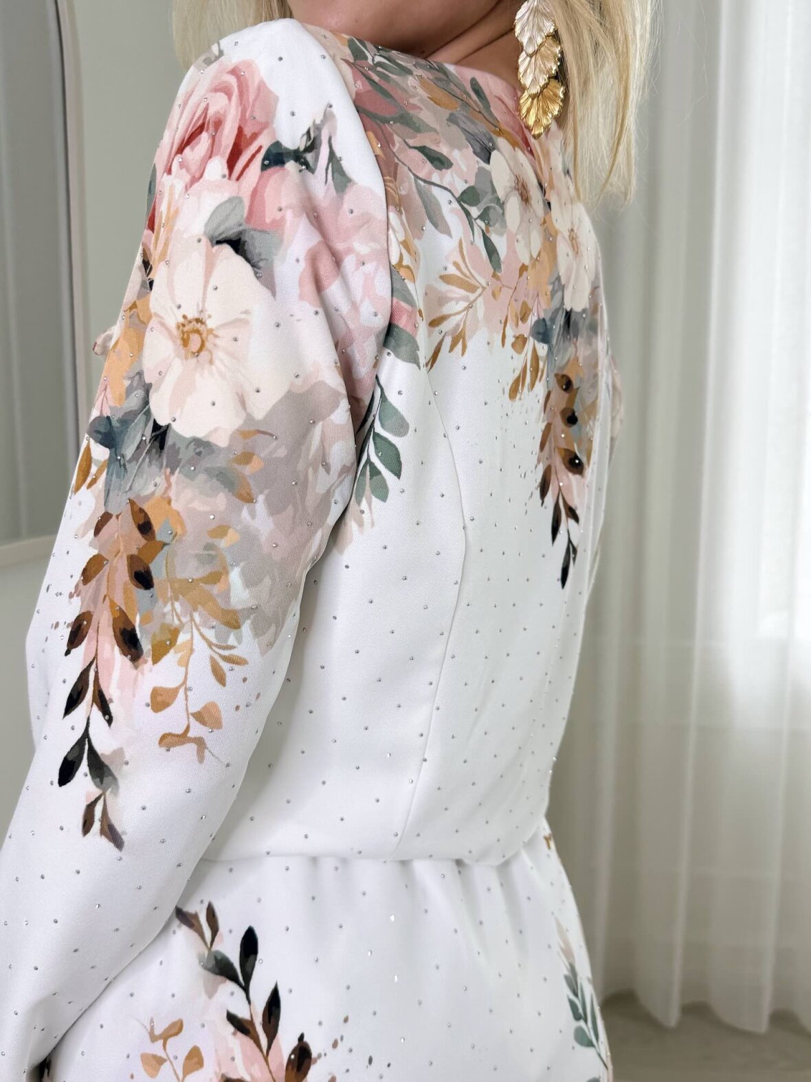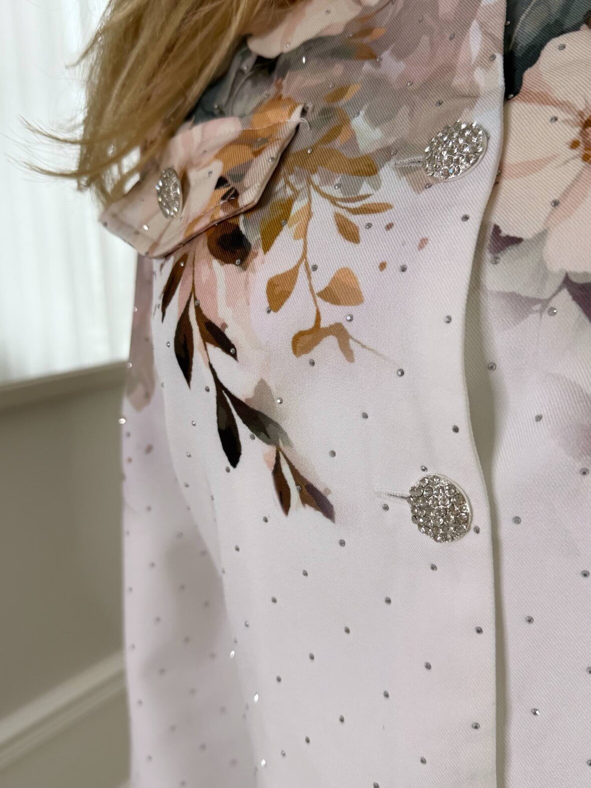 Kort, feminin jakke med smukt blomsterprint og fine stenknapper, der tilfører et eksklusivt touch. Designet i hvid med diskrete prikker og florale nuancer i rosa, beige og gyldne toner. De dekorative lommeklapper og glimtende sten giver jakken et elegant og moderne udtryk – perfekt til både hverdag og styling med matchende nederdel.
