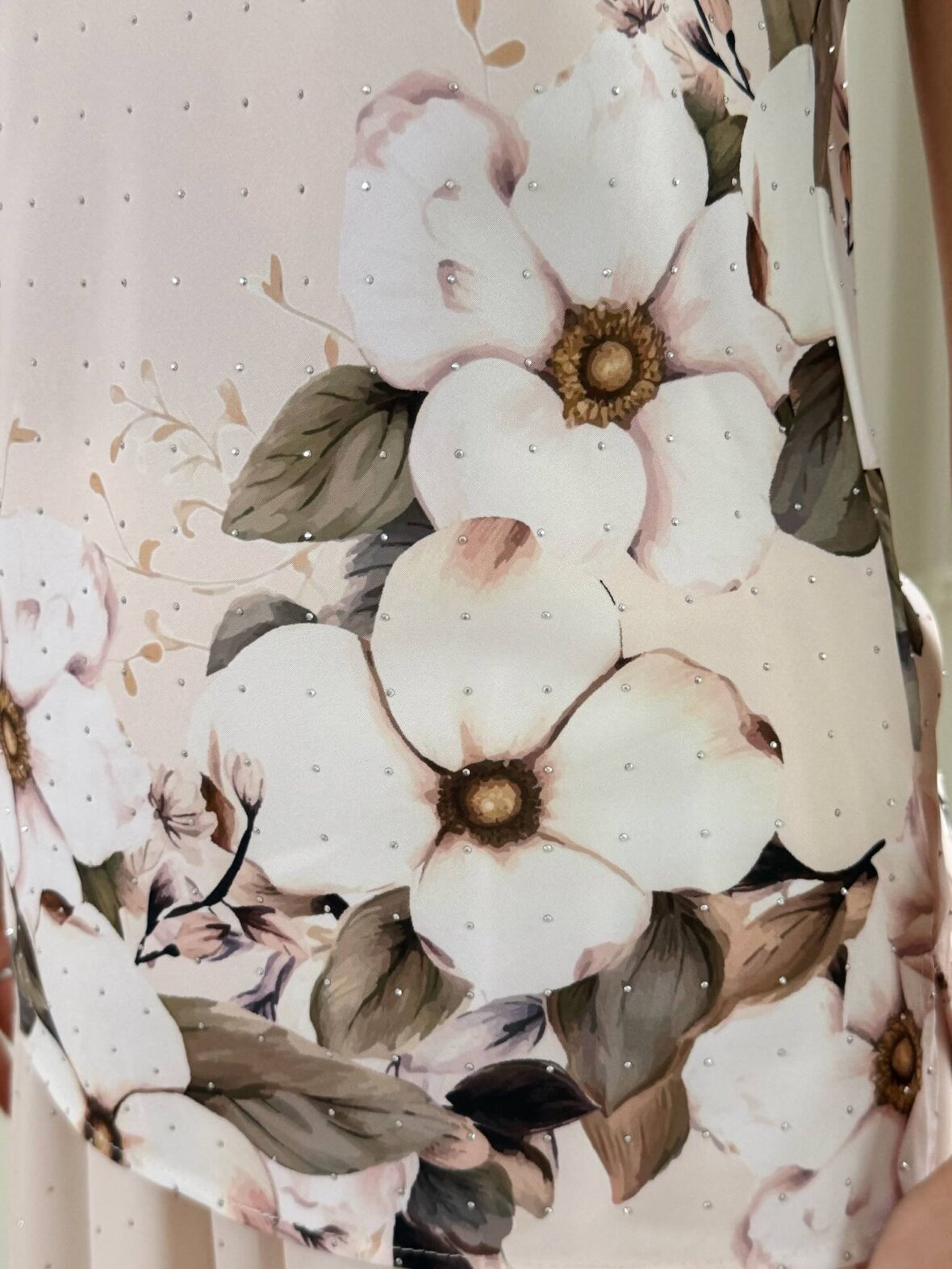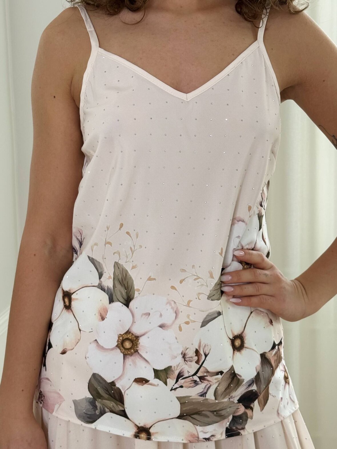 Feminin top i lys creme med smukt blomsterprint og fine små sten, der giver et diskret og eksklusivt shine. Den lette kvalitet og de smalle stropper skaber et elegant og enkelt udtryk. Perfekt alene på varme dage eller stylet under en matchende bluse eller jakke.