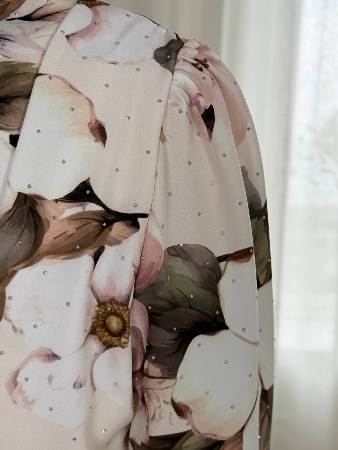 Elegant kjole i lys creme med romantisk blomsterprint og fine små sten, der giver et diskret og eksklusivt shine. Den feminine silhuet fremhæves af bindebånd i taljen og let volumen i ærmerne. En perfekt kjole til festlige anledninger eller særlige øjeblikke.