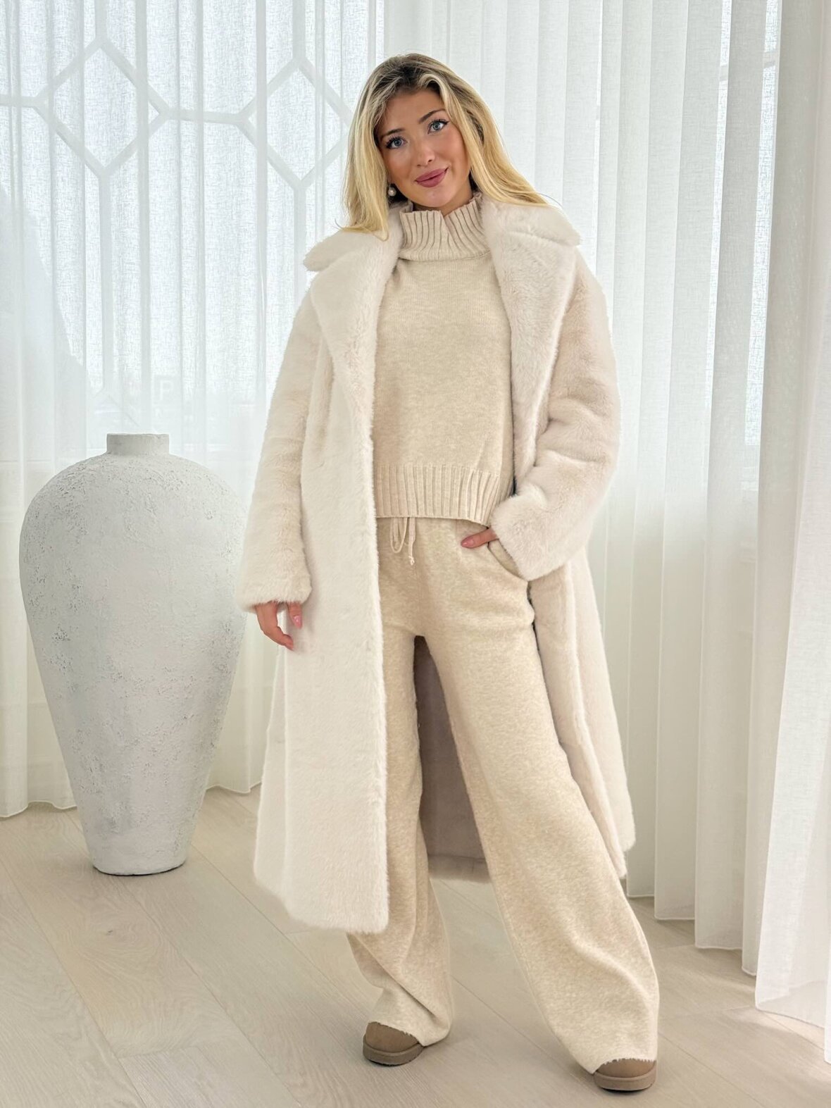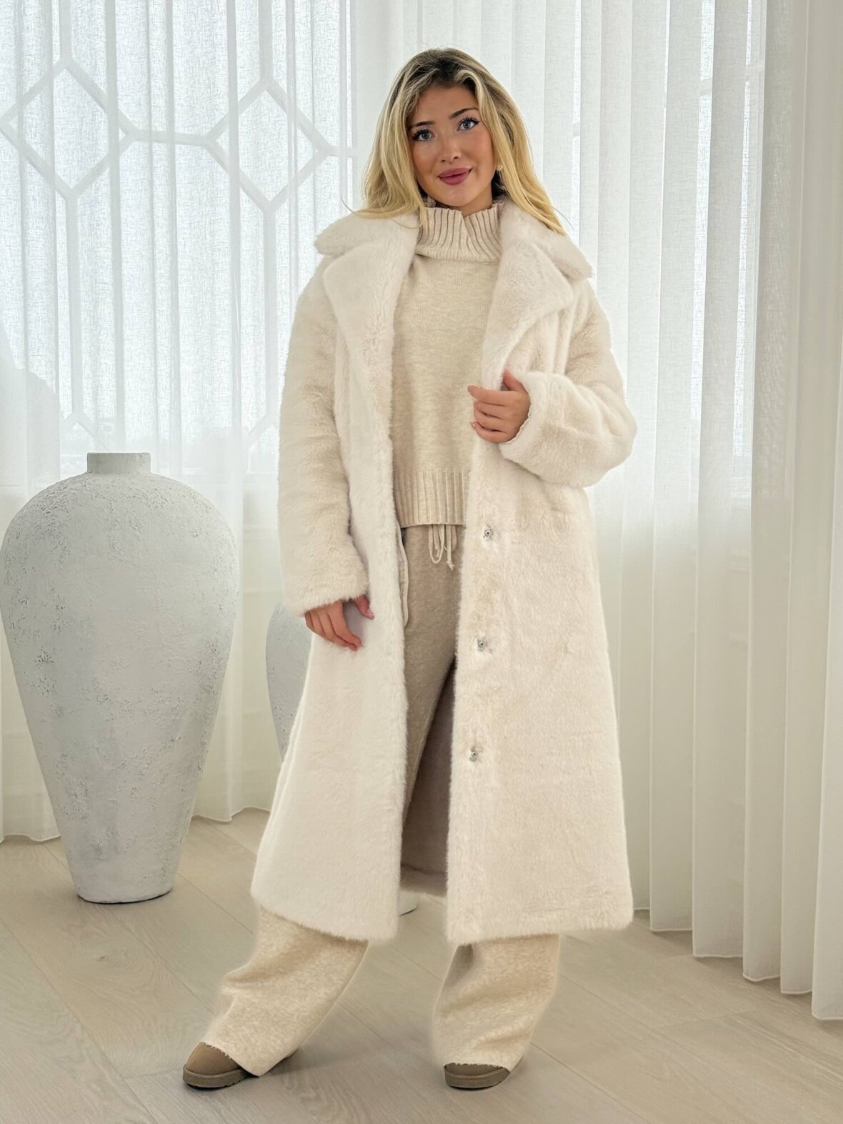Drøm dig væk i denne eksklusive fake mink-frakke i elegant cream. Det bløde, luksuriøse materiale og det lange snit skaber et sofistikeret udtryk, perfekt til både hverdag og fest. Frakken lukkes med trykknapper og giver et voluminøst, men elegant fald. Et glamourøst statement-piece, der holder dig varm med stil.