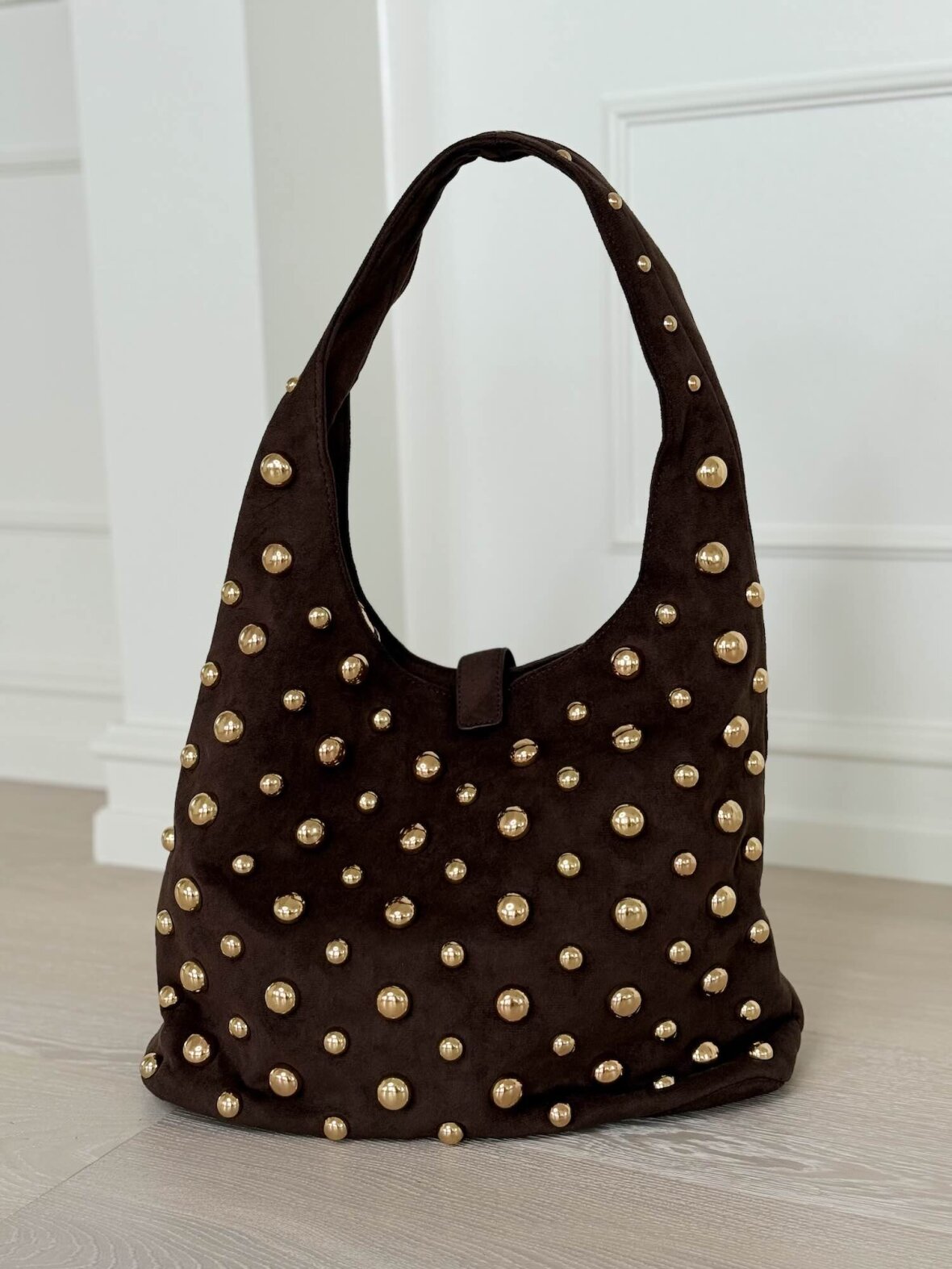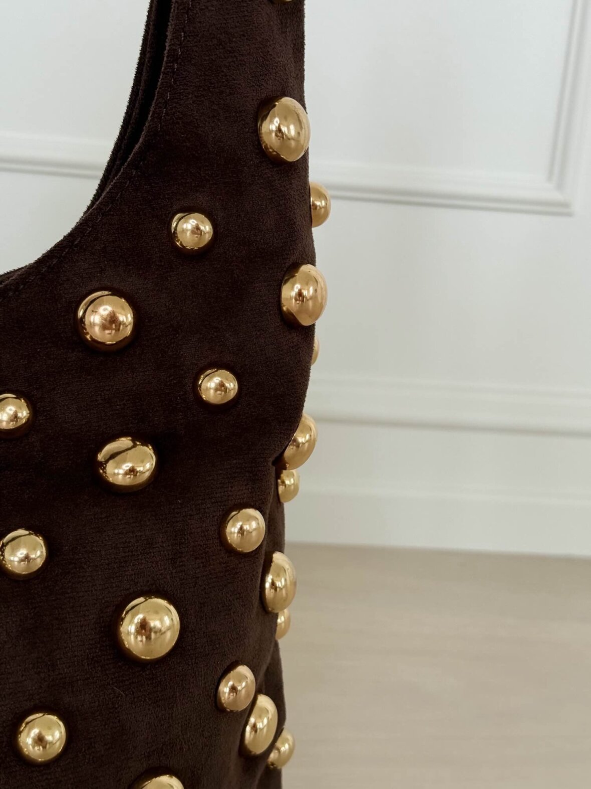 Eksklusiv chokofarvet taske i blødt ruskindslook, udsmykket med skinnende guldfarvede nitter for et edgy og luksuriøst udtryk. Den rummelige form gør den ideel til både hverdagsbrug og aftener ude, hvor du ønsker at tilføje et stilfuldt statement til dit look. En moderne taske med masser af attitude.