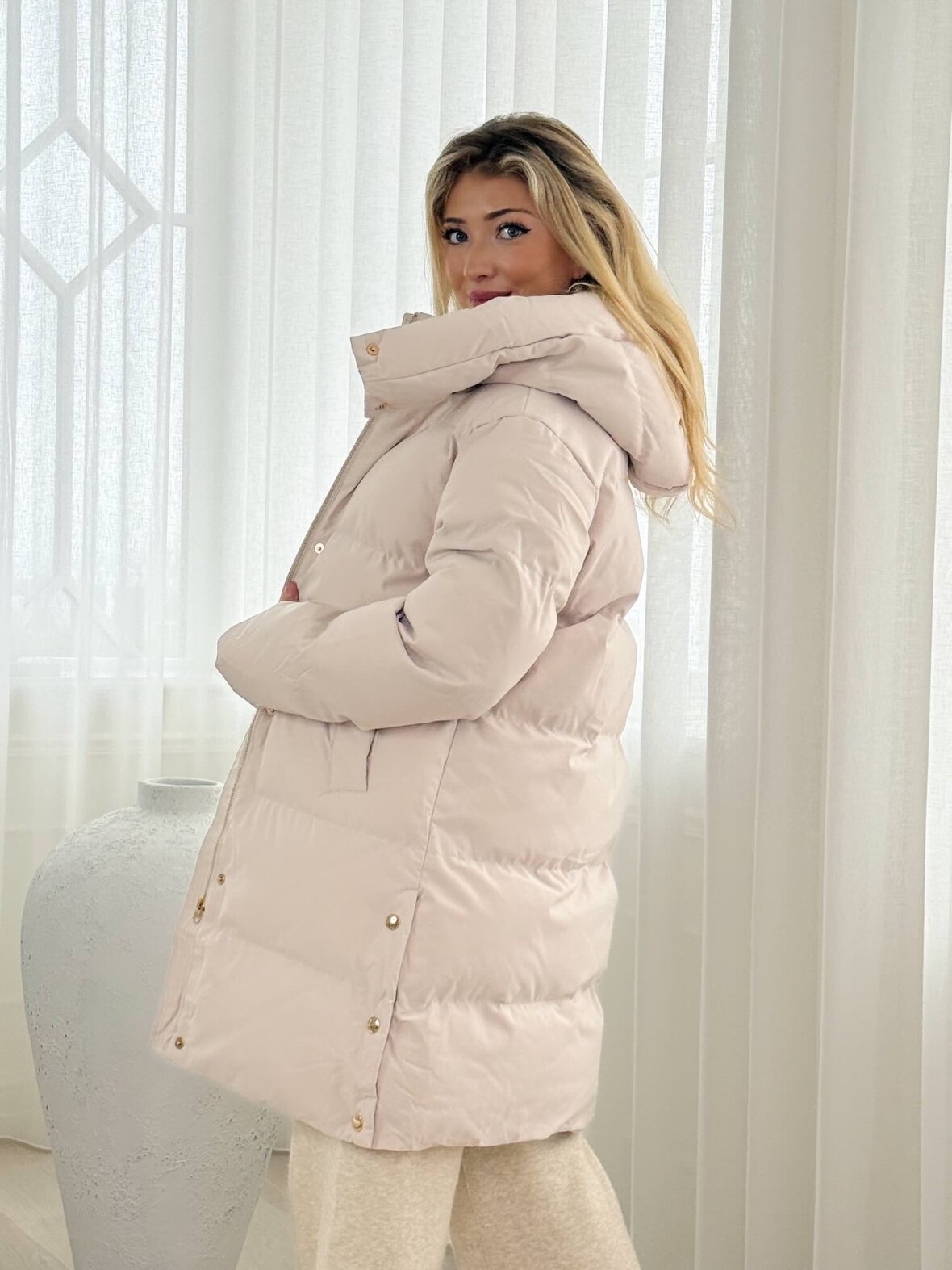 Lang, beige vinterjakke i quiltet design med aftagelig hætte og høj krave, der beskytter mod kulde og vind. Jakken lukkes med lynlås og trykknapper og har praktiske sidelommer. Den bløde polstring sikrer varme og komfort, mens det enkle design giver et stilrent og tidløst udtryk til vinterens garderobe.