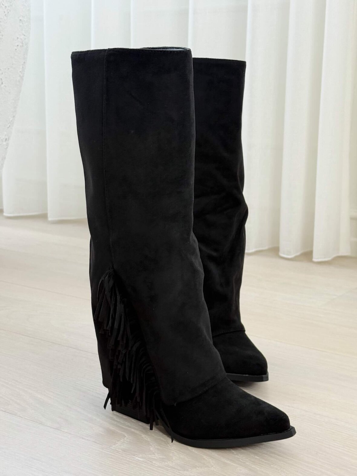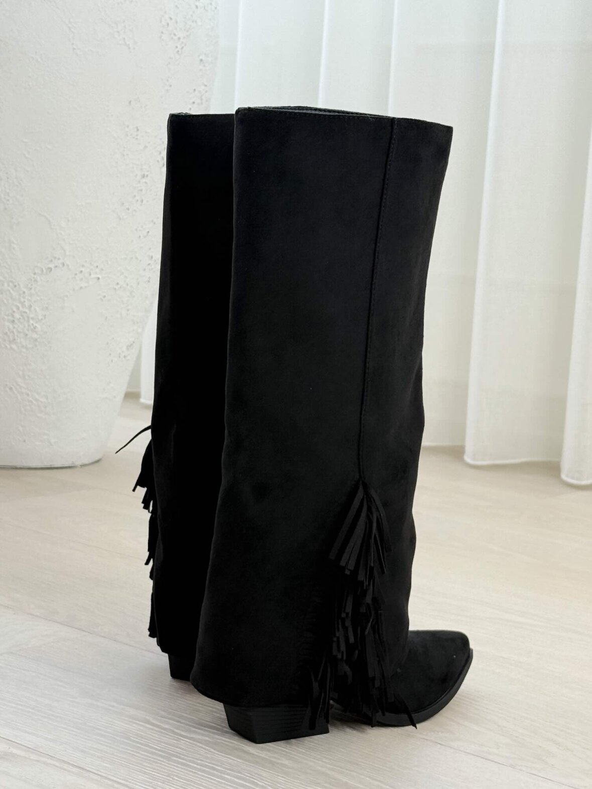 Stilfulde sorte cowboystøvler i ruskindslook med frynser langs skaftet. De har spids snude, indvendig lynlås og stabil blokhæl, som giver både komfort og et moderne western-udtryk. Perfekte dame støvler til både hverdagsbrug og festlige outfits – et tidløst valg, der passer til enhver garderobe.