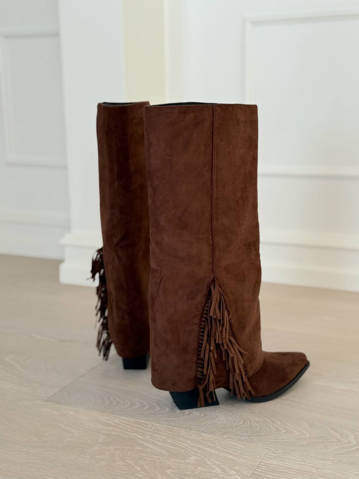 Cowboystøvler i chokoladebrunt ruskindslook med dekorative frynser langs skaftet. Designet med spids snude, indvendig lynlås og stabil blokhæl, der giver både komfort og stil. De feminine støvler til dame kombinerer western-inspiration med moderne design og er nemme at style til både kjoler, nederdele og jeans.