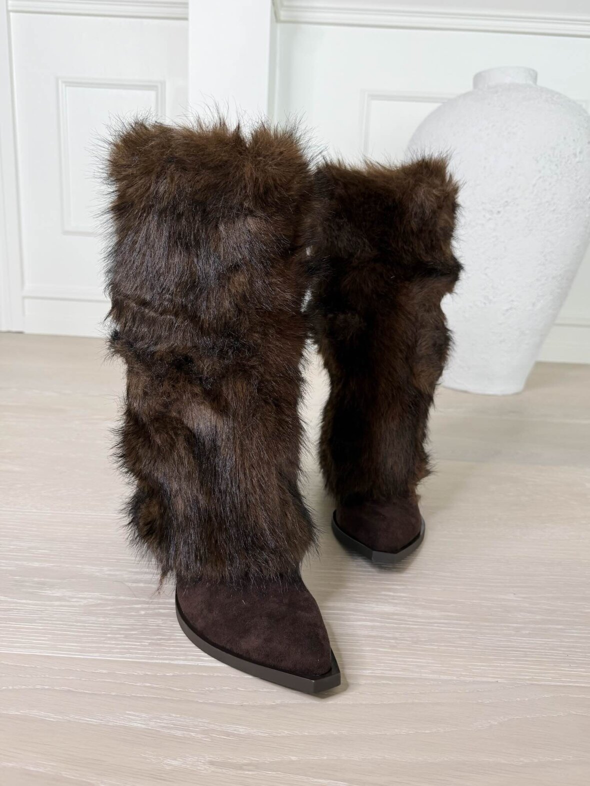 Mørkebrune støvler i ruskindslook med fyldigt kunstpels-skaft, der giver et eksklusivt og luksuriøst vinterudtryk. Den spidse snude og kraftige sål tilfører et moderne touch, mens det bløde pelslook sikrer varme og komfort. Perfekte til både kjoler og bukser, når du vil skabe et sofistikeret outfit med et unikt statement i de kolde måneder.