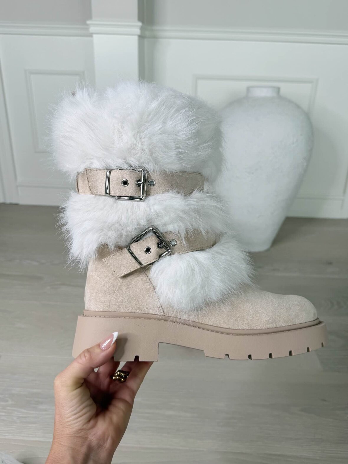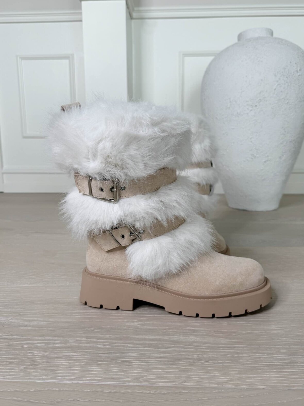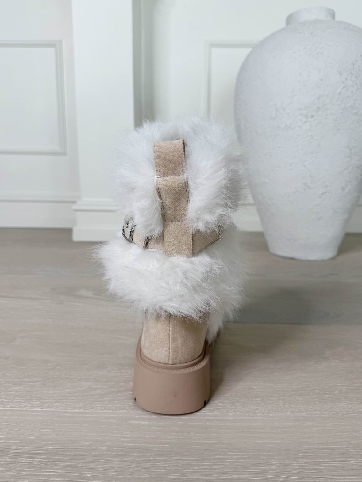 Beige vinterstøvler i ruskindslook med markant sål og blødt kunstpels-detaljeret skaft i hvid. De dekorative spænder tilfører et råt touch, mens det fluffy pelslook giver et feminint og luksuriøst udtryk. En perfekt kombination af komfort og stil til kolde dage, hvor du ønsker varme fødder uden at gå på kompromis med et fashionabelt look.
