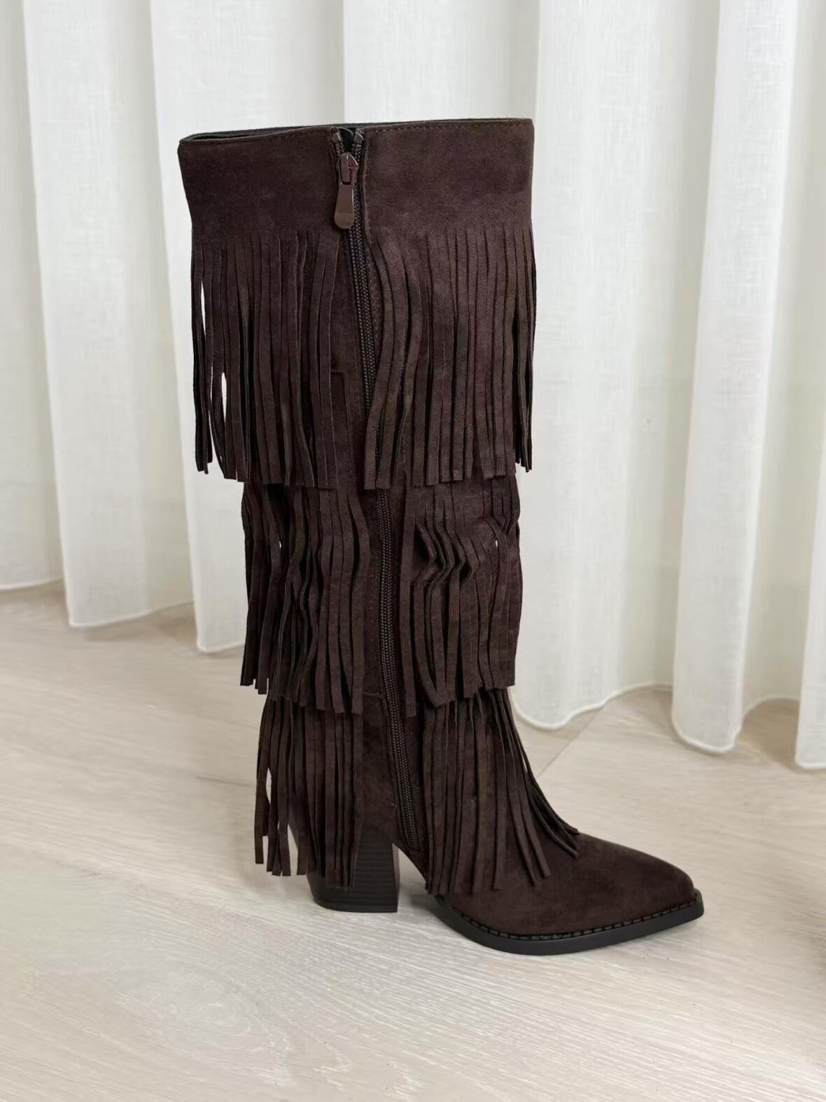 Unikke cowboystøvler i chokoladebrunt ruskindslook med tre lag frynser for et iøjnefaldende western-look. De har spids snude, stabil blokhæl og et blødt materiale, der sikrer komfort hele dagen. Et moderigtigt valg til den stilbevidste kvinde, der vil kombinere boho og western på elegant vis.