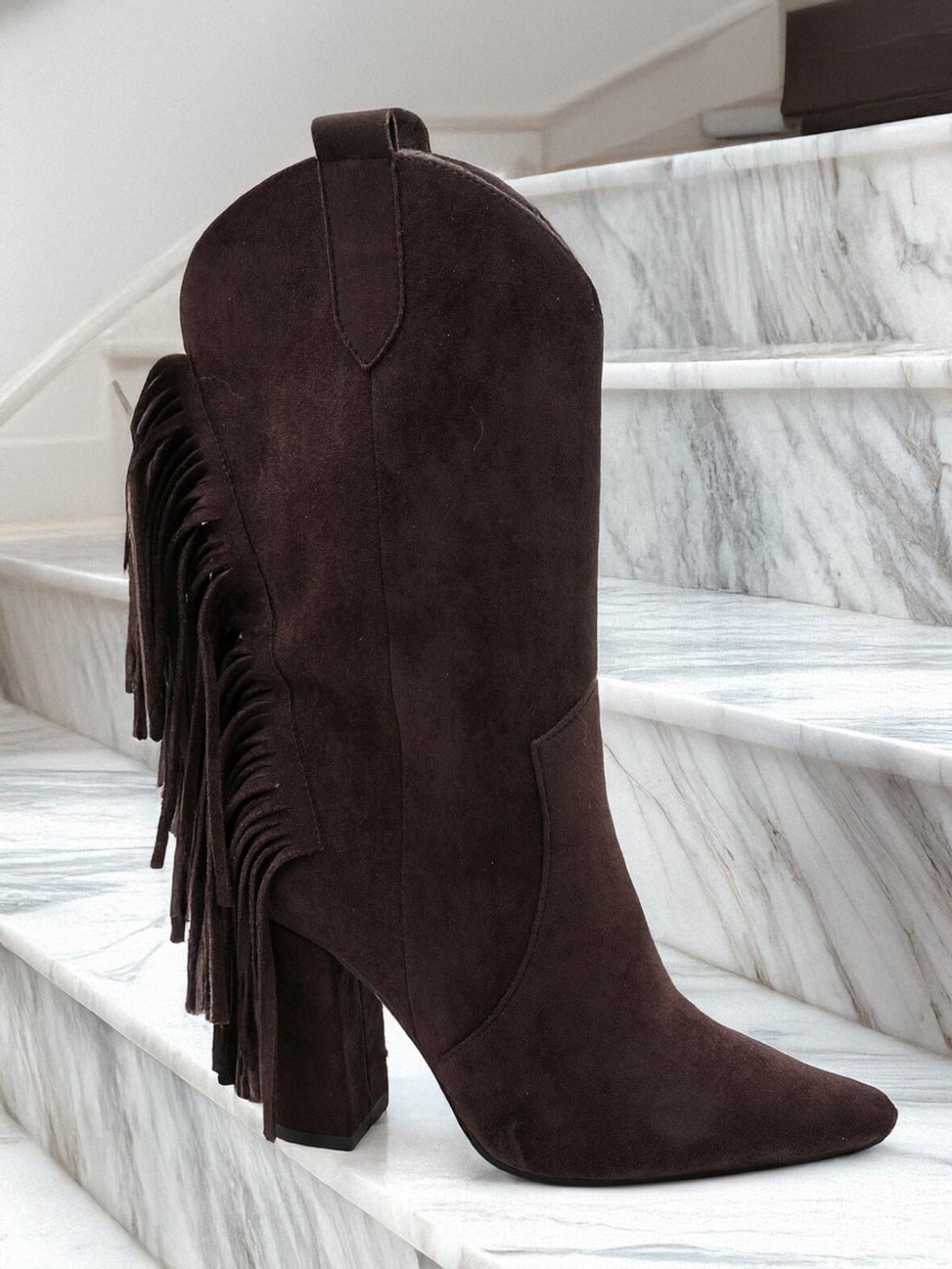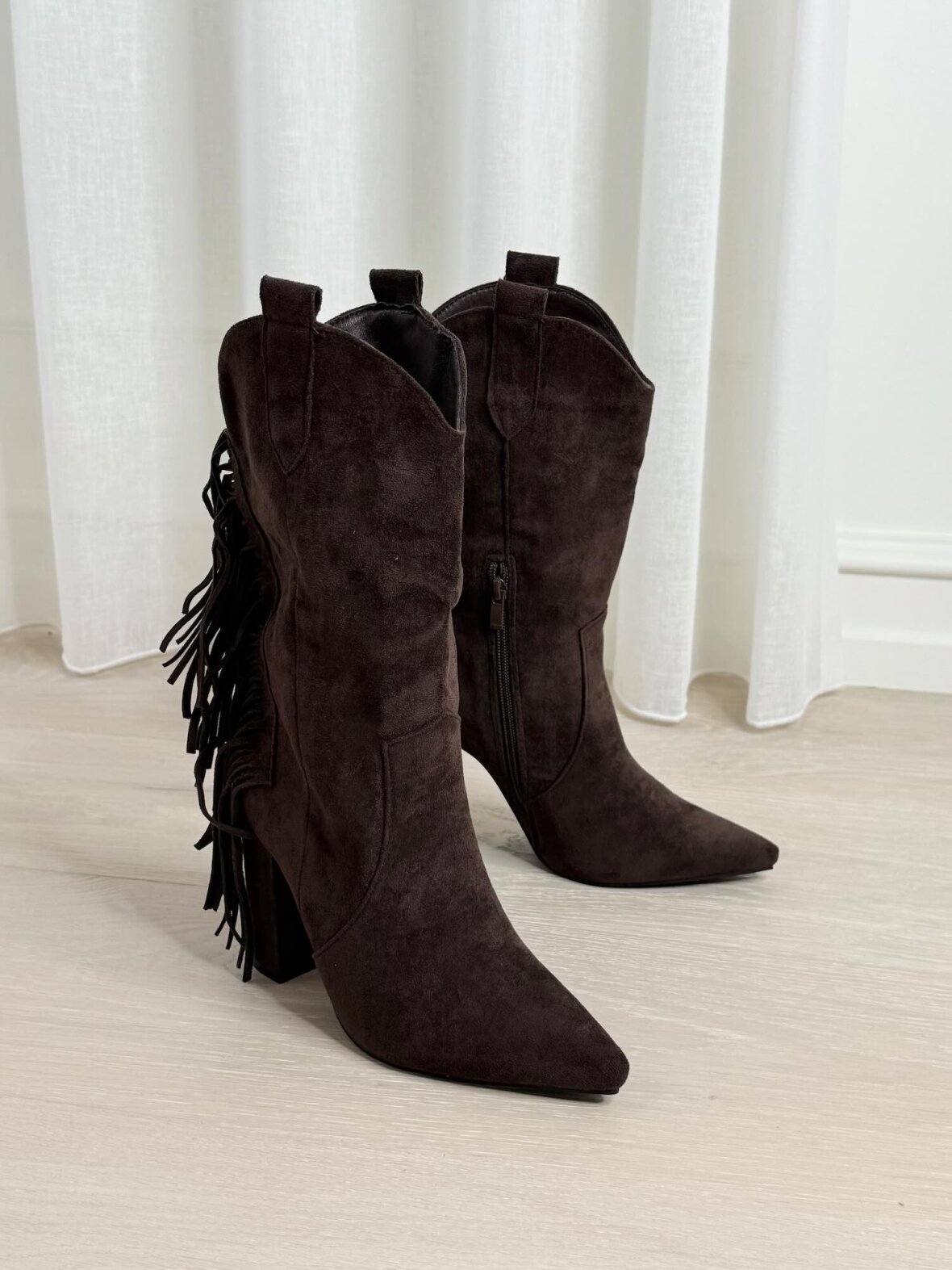 Stilfulde cowboystøvler i mørk chokoladebrunt ruskindslook med lange frynser på ydersiden. De har spids snude, høj blokhæl og klassiske western-detaljer, der giver et feminint og råt udtryk. Disse støvler til dame er perfekte til både kjoler og jeans og giver ethvert outfit et trendy western-touch.