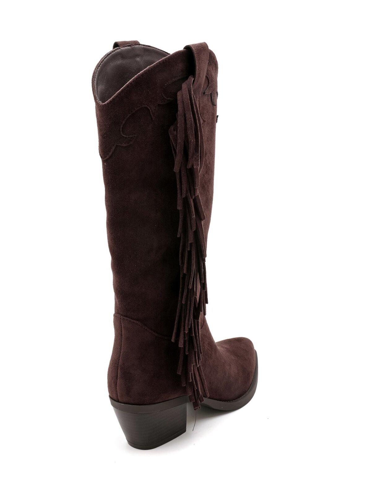 Cowboystøvler i mørk chokoladebrunt ruskindslook med elegante western-detaljer og frynser langs skaftet. De har spids snude, stabil blokhæl og et tidløst design, der giver et feminint og cool udtryk. Disse dame støvler passer perfekt til både kjoler og jeans – ideelle til et moderne western-look.