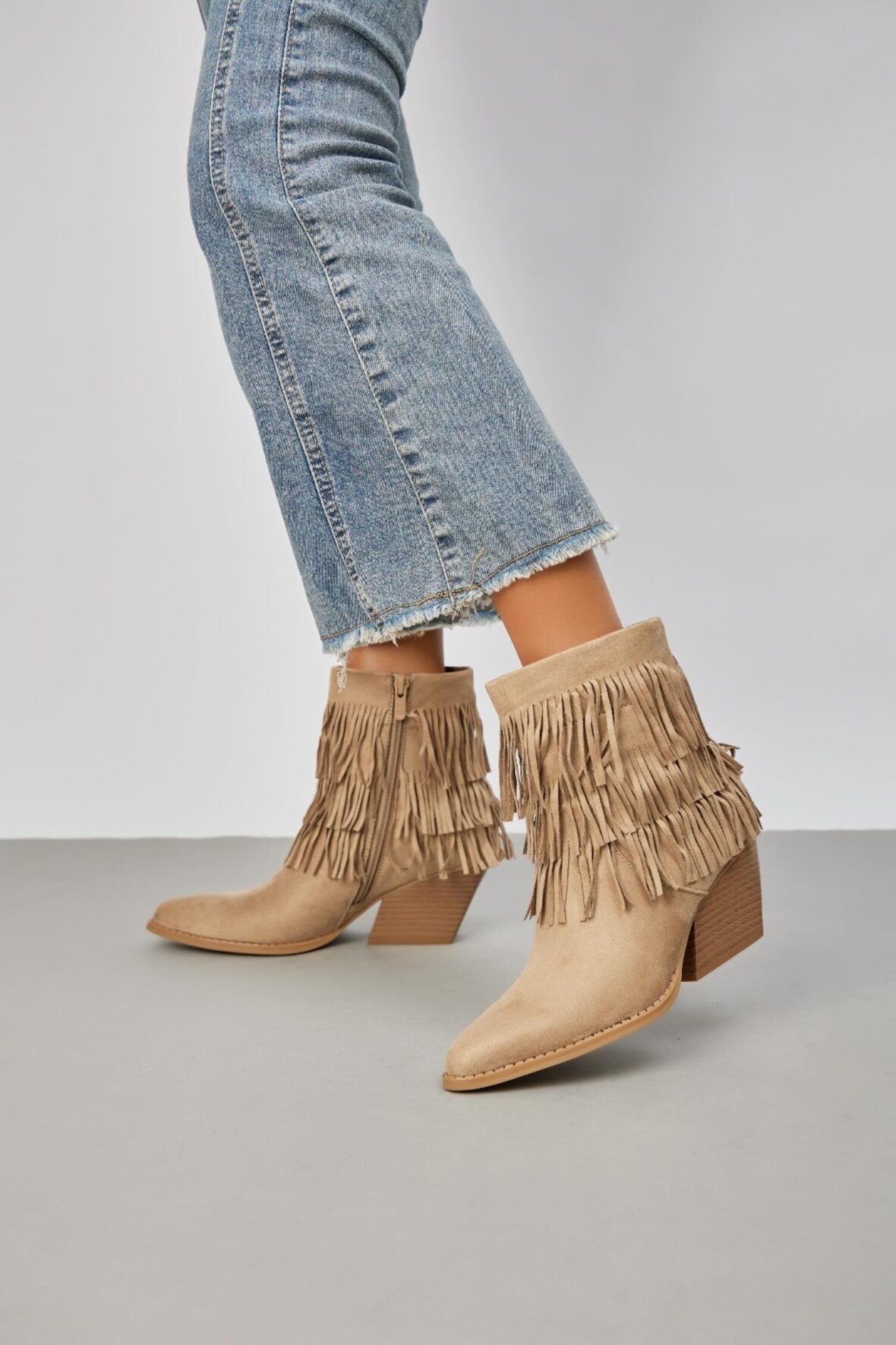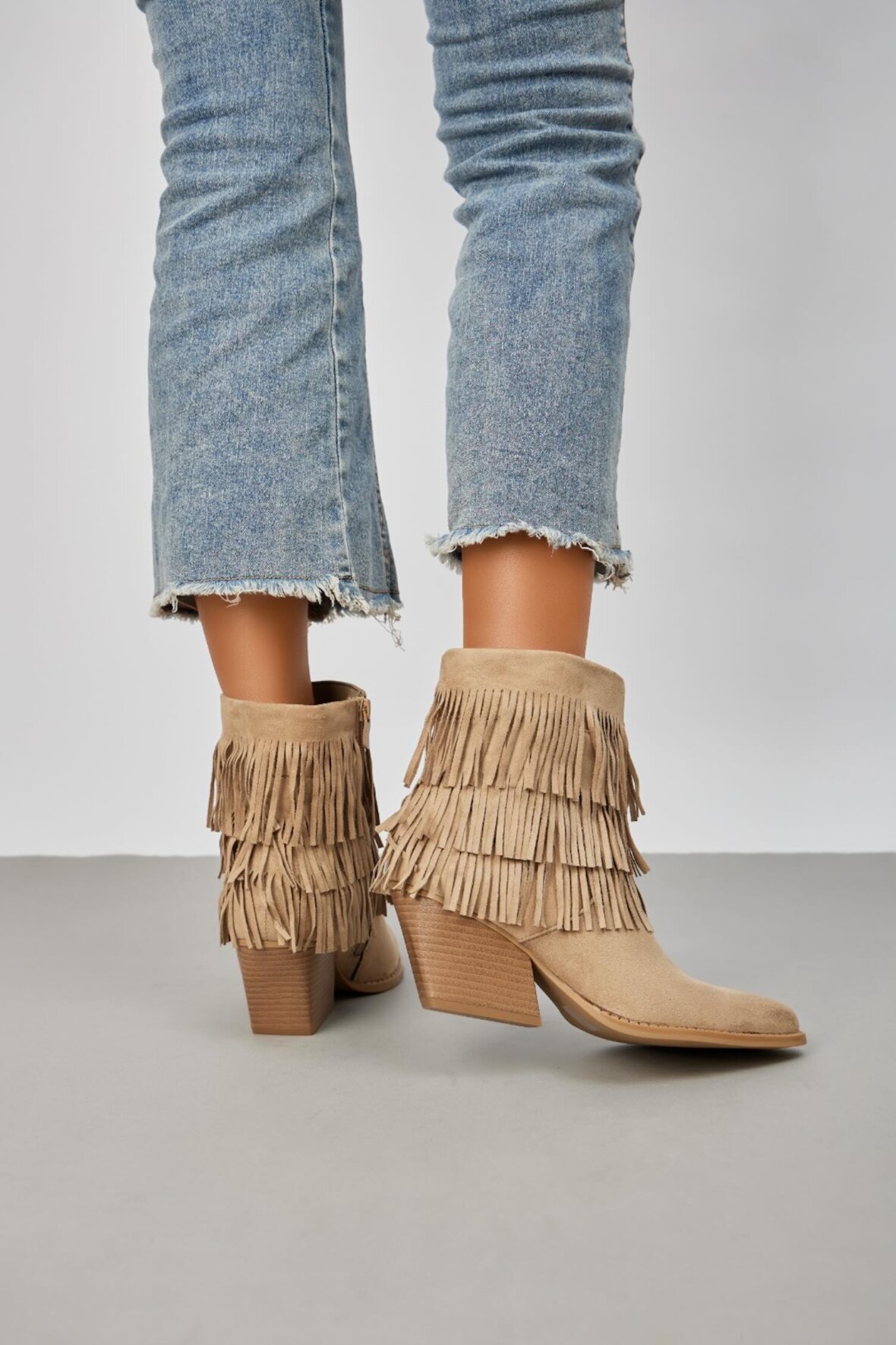 Trendy korte cowboystøvler i sandfarvet ruskindslook med dobbelte lag frynser. Designet med spids snude, skrå blokhæl og lynlås i siden for nem komfort. De giver et cool western-touch til både jeans, kjoler og nederdele. Et must-have til den moderne kvinde, der elsker boho og westernstil.