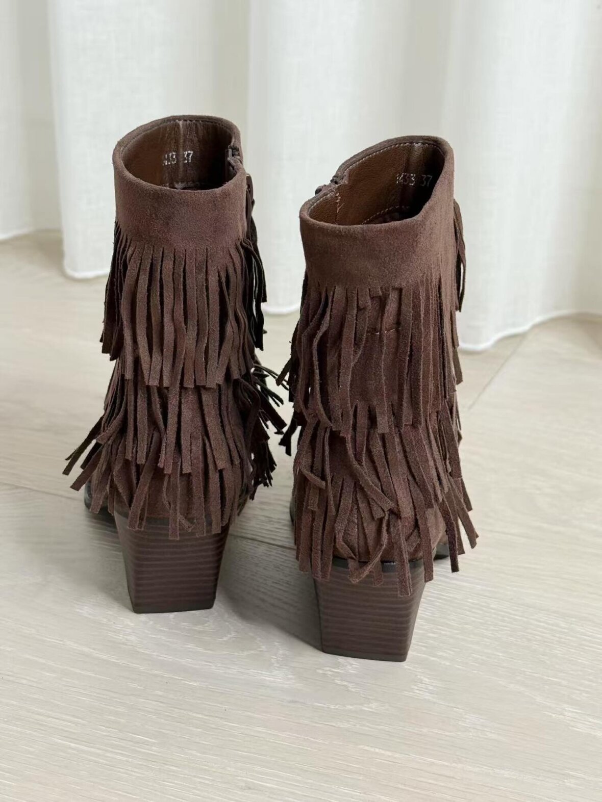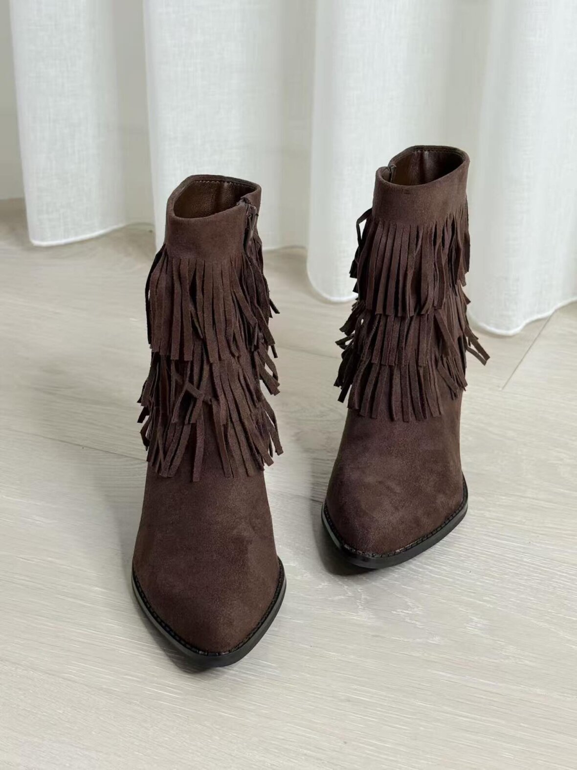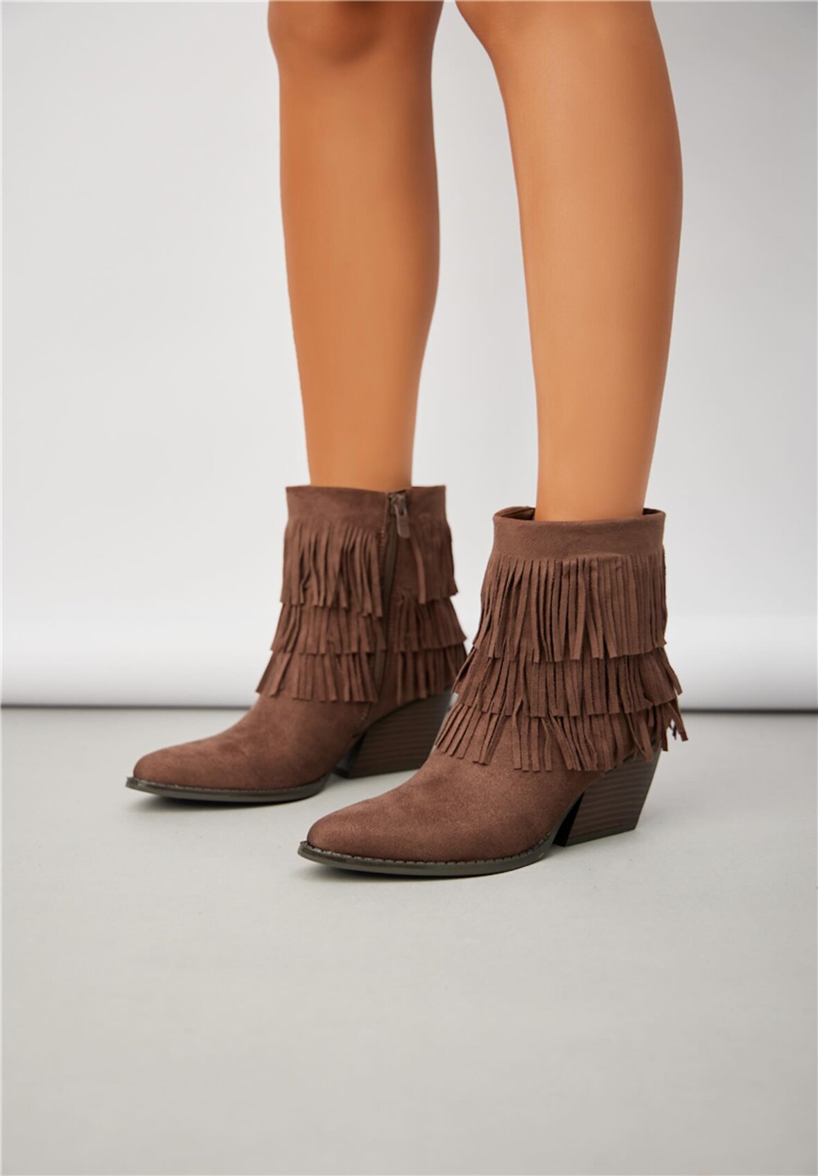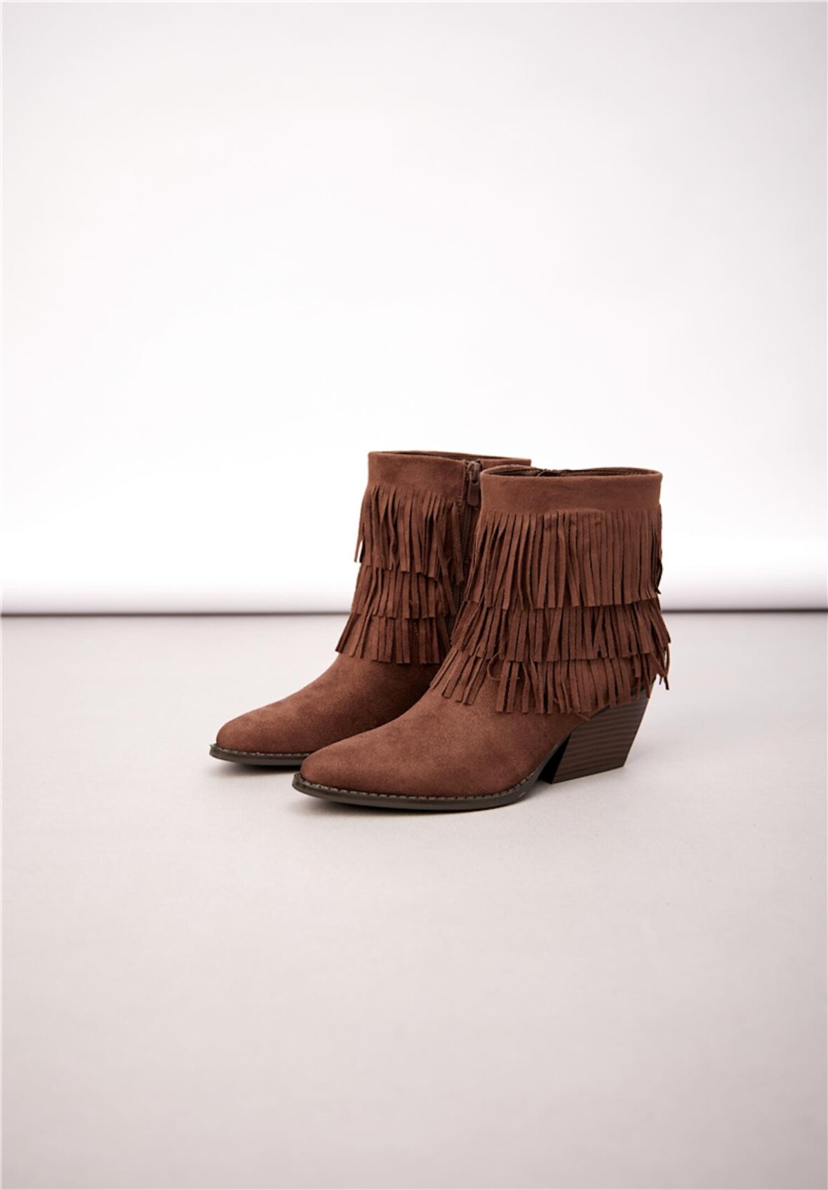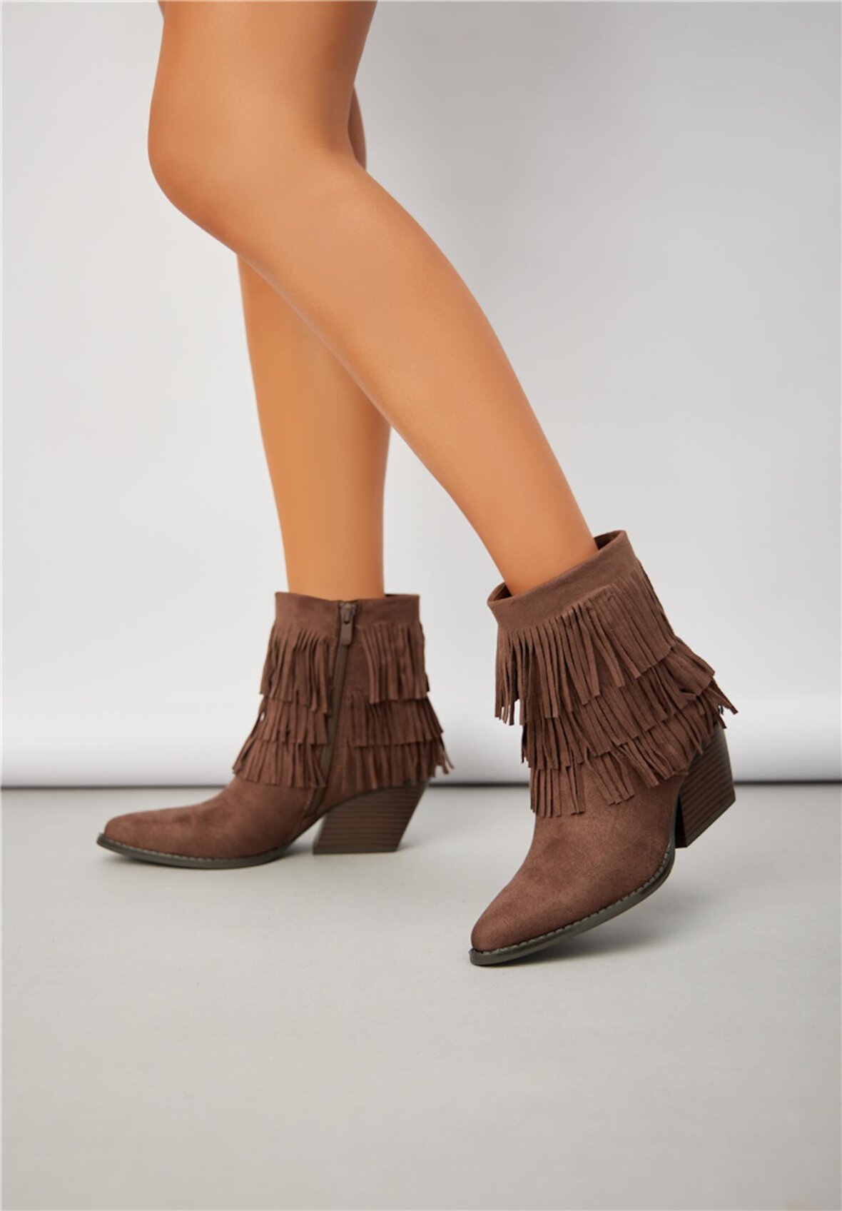 Korte cowboystøvler i chokoladebrunt ruskindslook med to lag frynser. Designet med spids snude, skrå blokhæl og lynlås i siden for perfekt pasform. Støvlerne kombinerer western-inspiration med et feminint og afslappet udtryk – ideelle til både jeans, kjoler og boho-stil outfits.