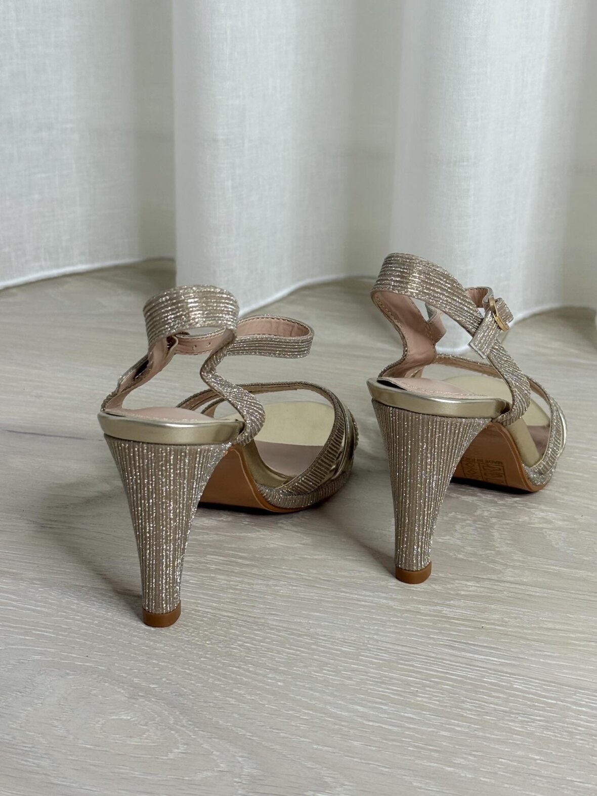 Elegante sandaler i guld med krydsede stropper og en smuk glimmereffekt. Den justerbare ankelrem giver perfekt pasform, mens den moderate hælhøjde sikrer komfort hele aftenen. Perfekte til festlige lejligheder, bryllupper eller en aften ude, hvor du vil tilføje et strejf af glamour.