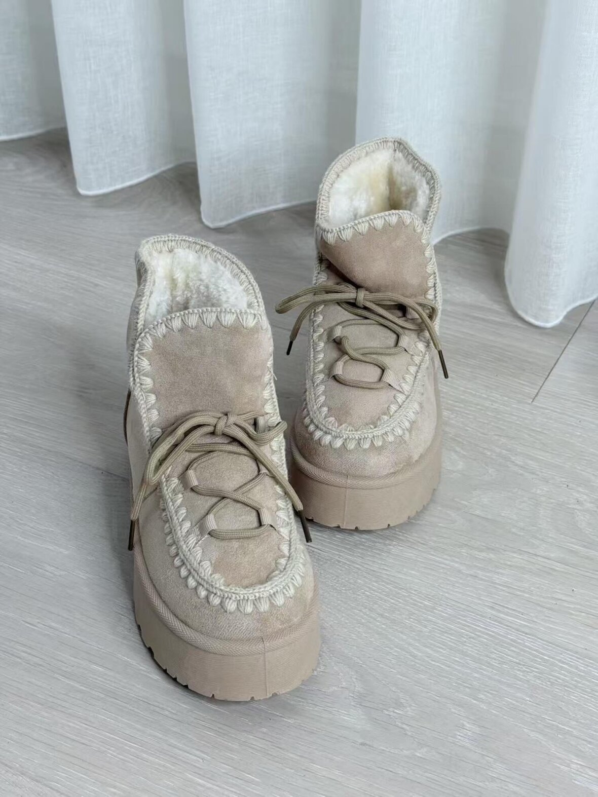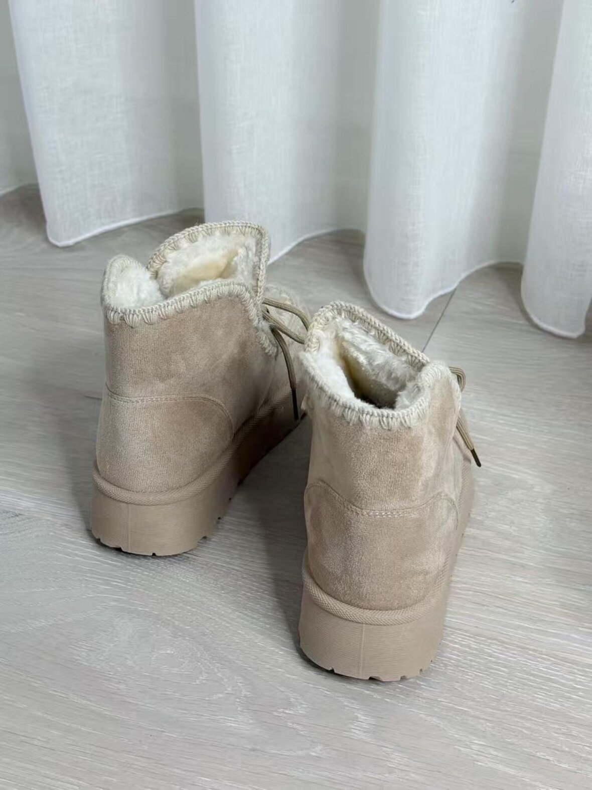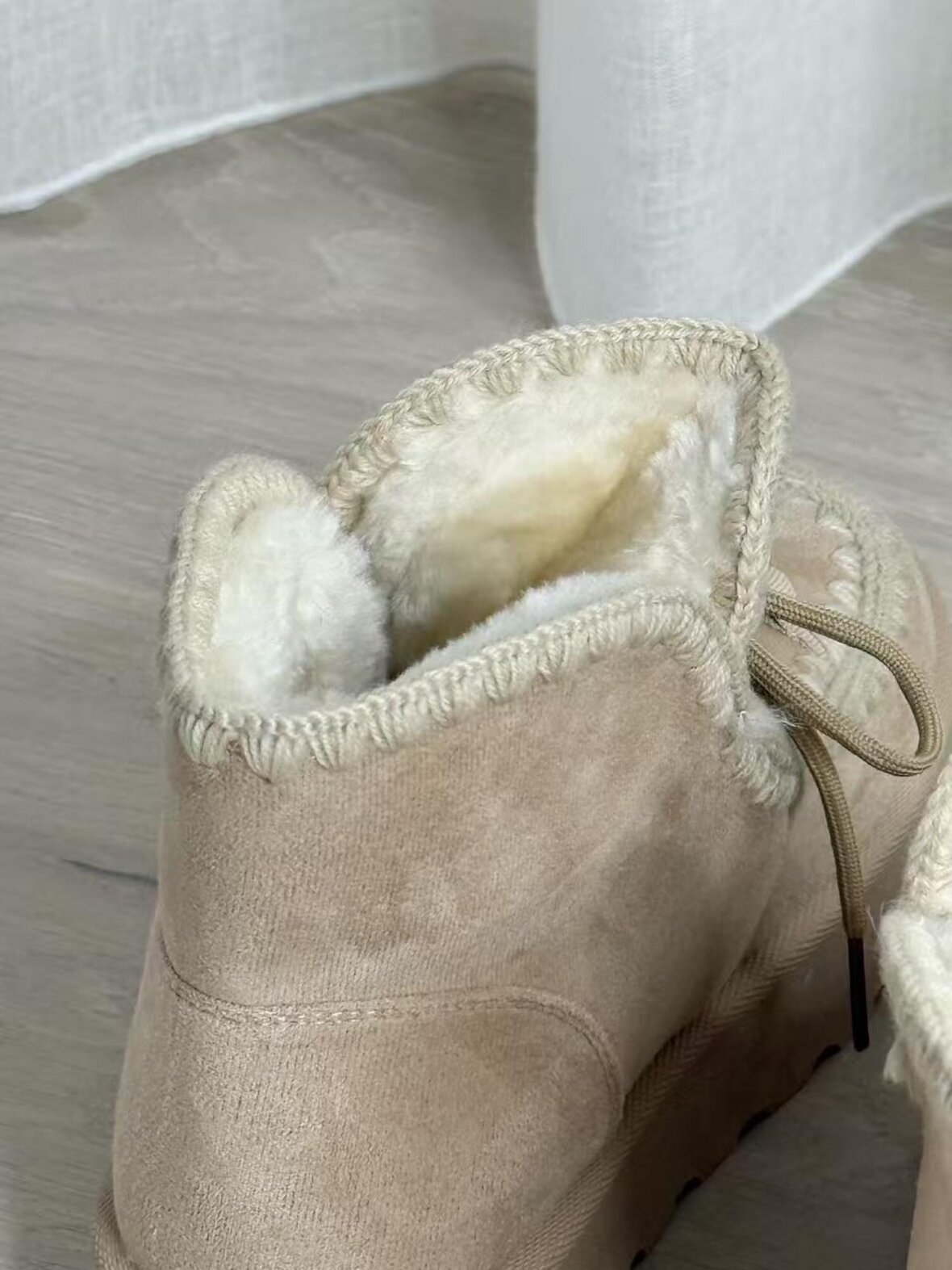 Hyggelige beige vinterstøvler med et varmt og blødt pelsfor, der holder fødderne komfortable på kolde dage. Designet har flotte kontrastsyninger, snøre foran og en robust, skridsikker sål. Den perfekte kombination af stil og funktionalitet – ideel til både udendørs brug og afslappede vinterdage.