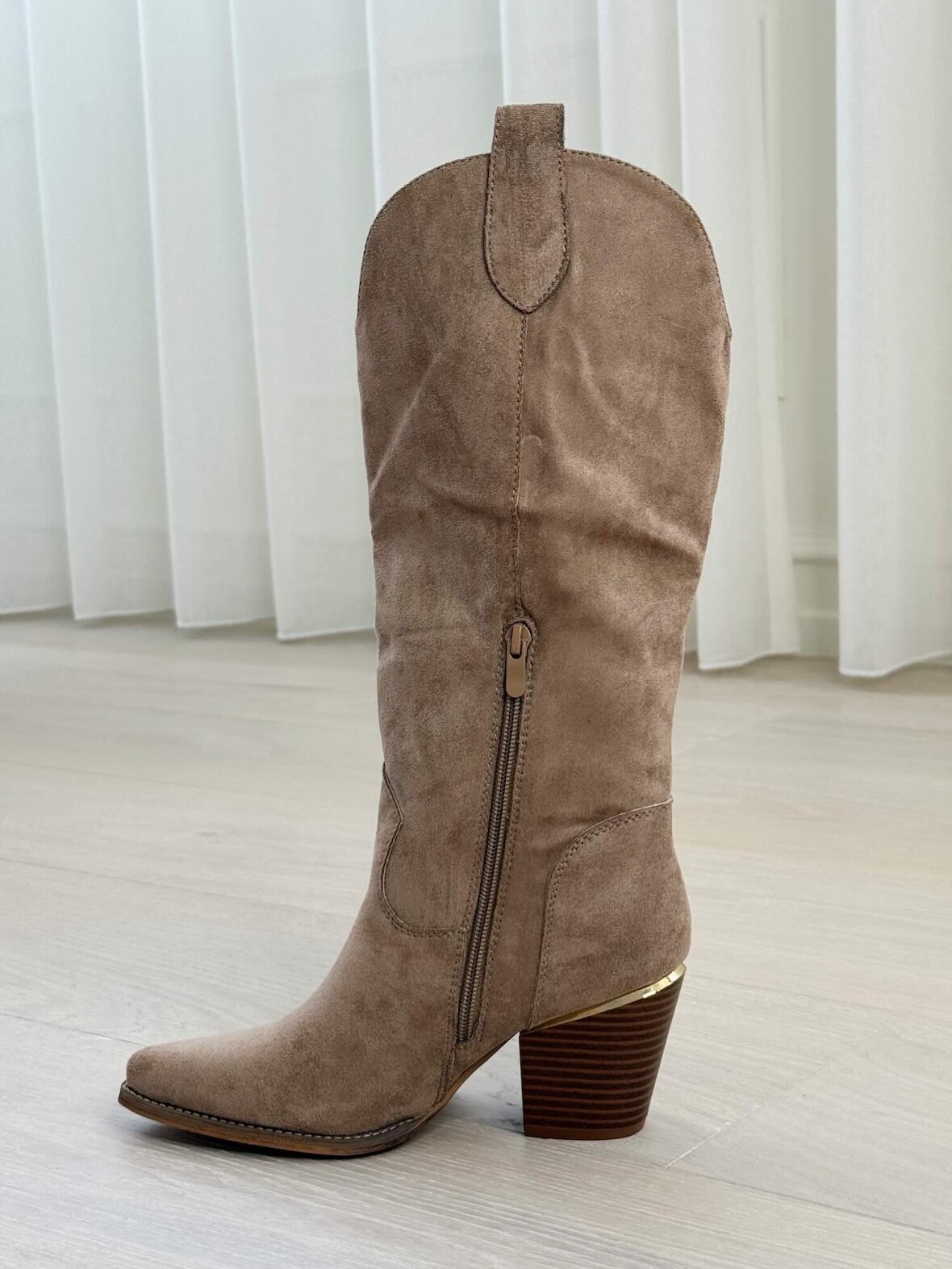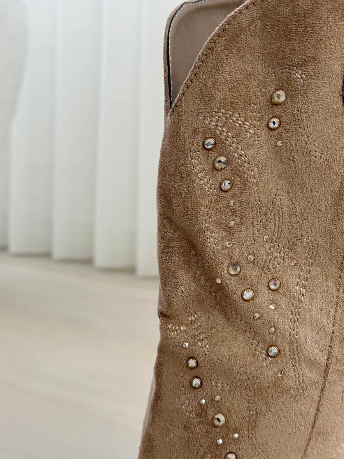 Elegant cowboystøvle i taupe ruskind-look med smukke nittedetaljer og dekorative syninger. Støvlen har spids snude, medium hæl med metallisk kant og klassiske westernlinjer. Et feminint statement-piece, der tilføjer et råt touch til både kjoler og jeans.