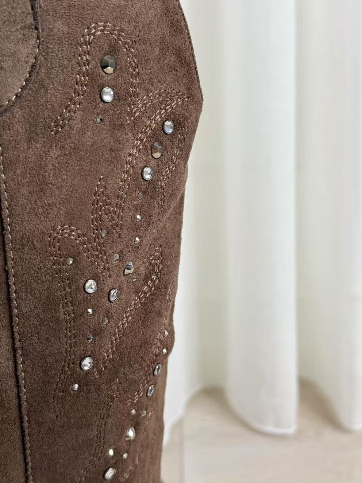 Klassisk cowboystøvle i chokoladebrun ruskind-look med flotte syninger og små nitter som detaljer. Støvlen har en spids snude, medium hæl med metallisk kant og trækstrop øverst. Et feminint og moderne take på den tidløse westernstil.