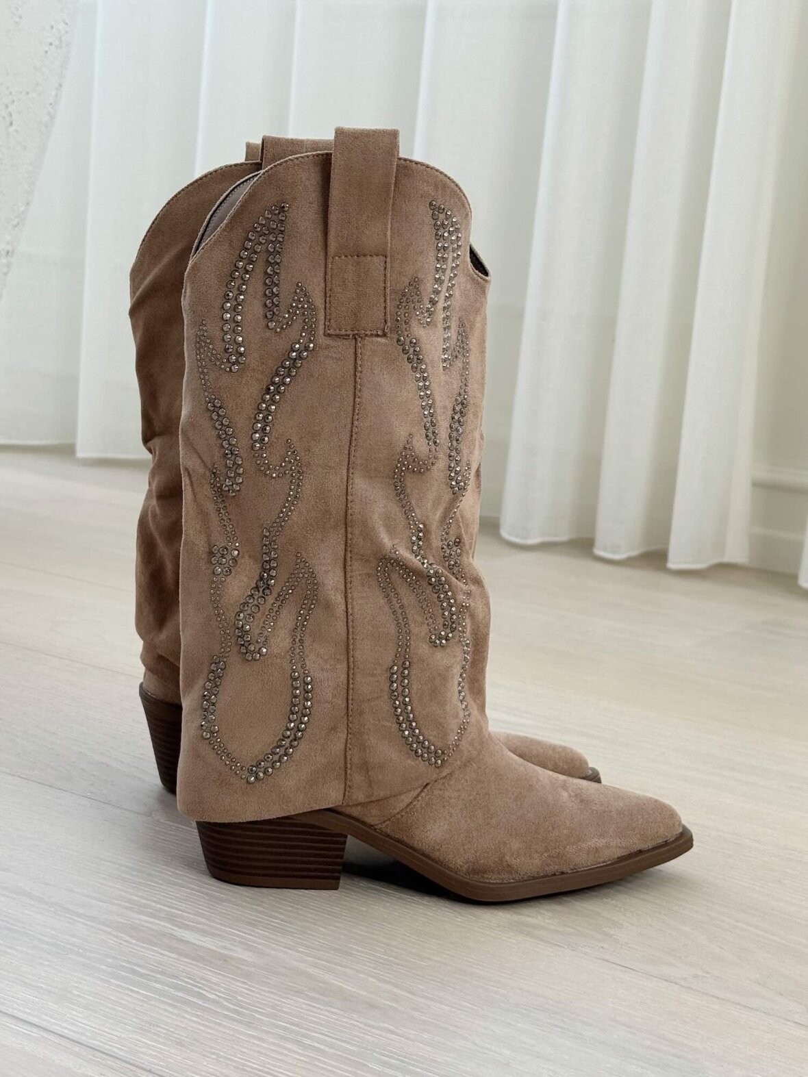 Trendy cowboystøvle i taupefarvet ruskind-look med dekorative nitter i flammemønster. Støvlen har en let hæl, spids snude og klassiske detaljer, der giver et feminint og cool western-udtryk. Perfekt til både kjoler, jeans og nederdele.