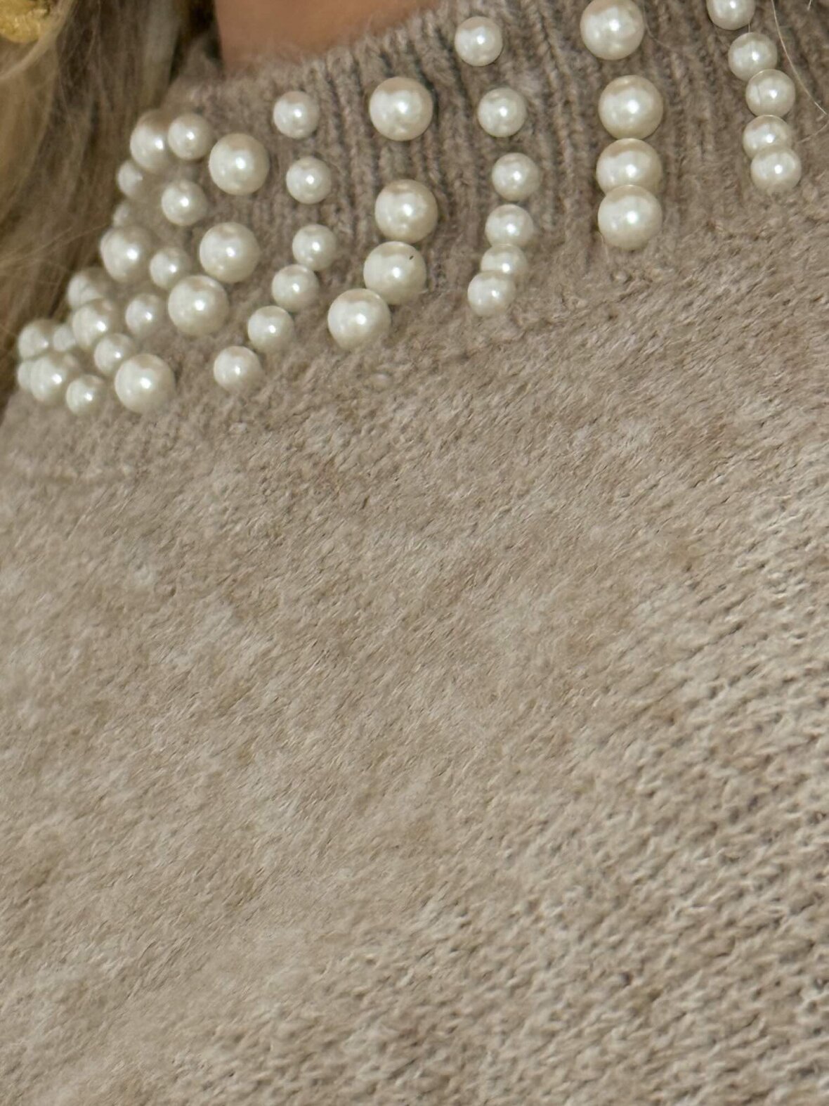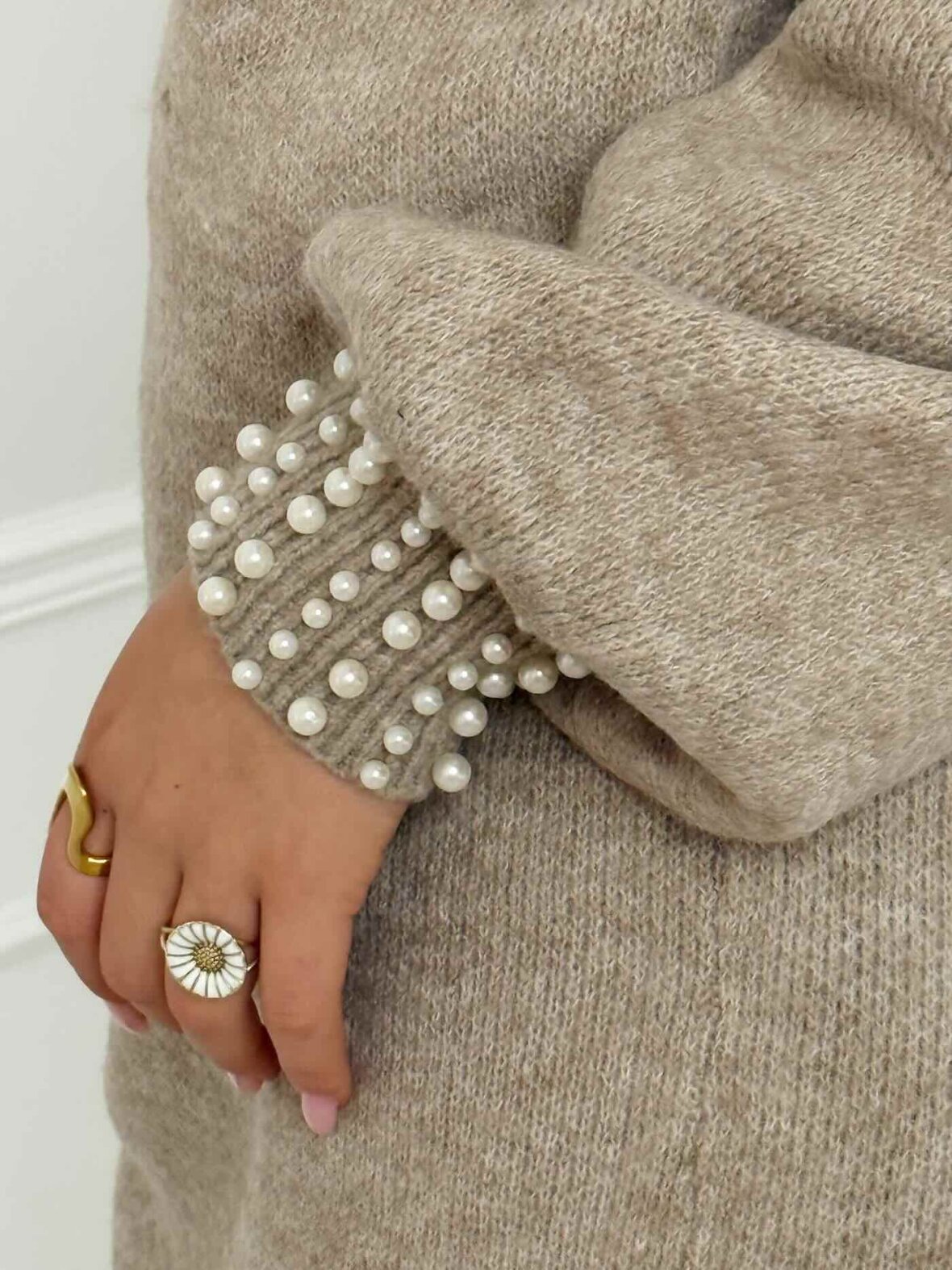 Smuk strik kjole i den fineste camel farve med perledetaljer ved hals og ærmer. Den bløde og behagelige kvalitet kombineret med det feminine design gør denne kjole til et must-have i garderoben. Kjolen har en flatterende pasform med ballonærmer og ribkant forneden, som giver et eksklusivt og tidløst udtryk. Perfekt til både hverdag og fest – style den med støvler eller hæle for et elegant look.