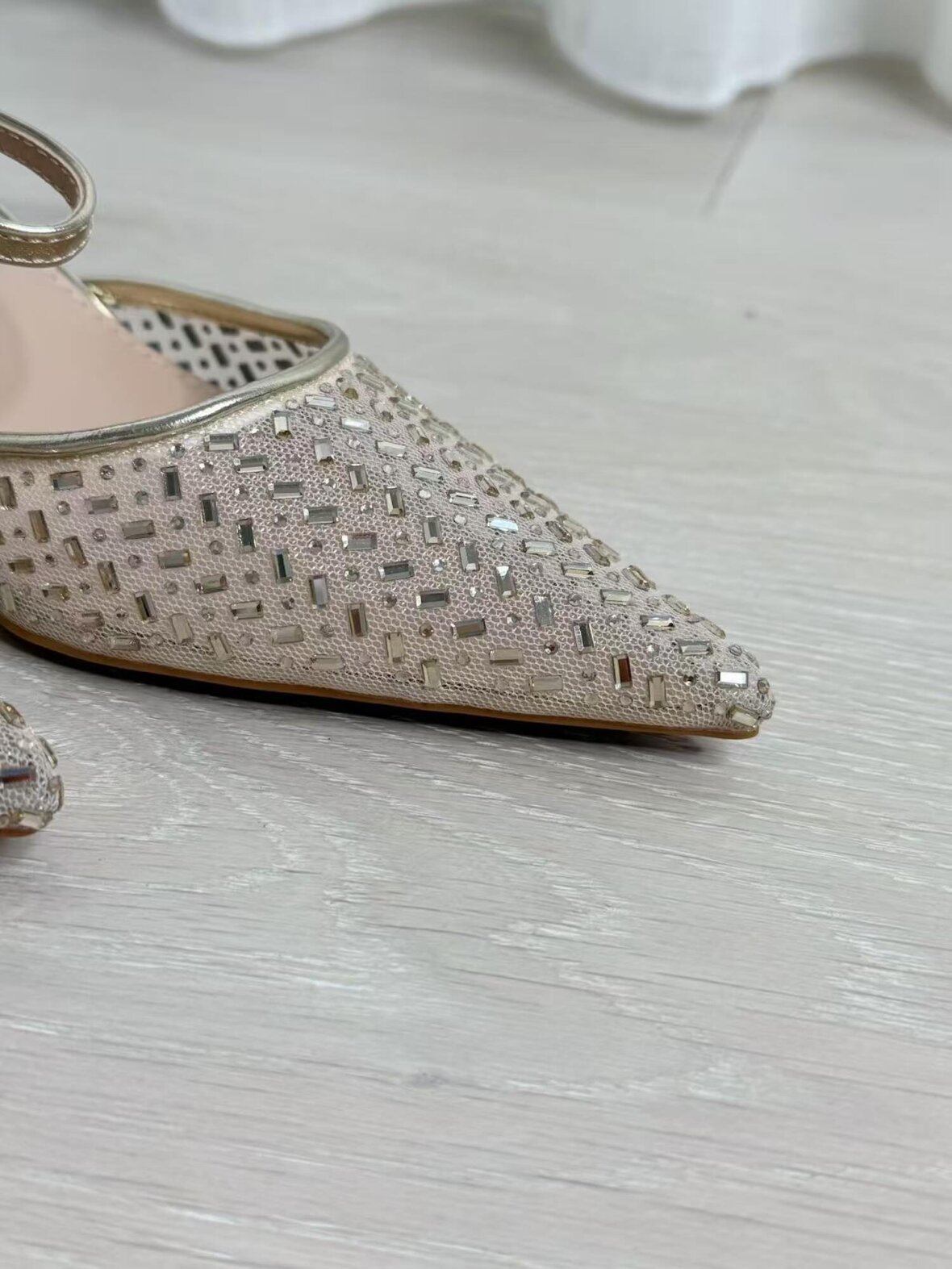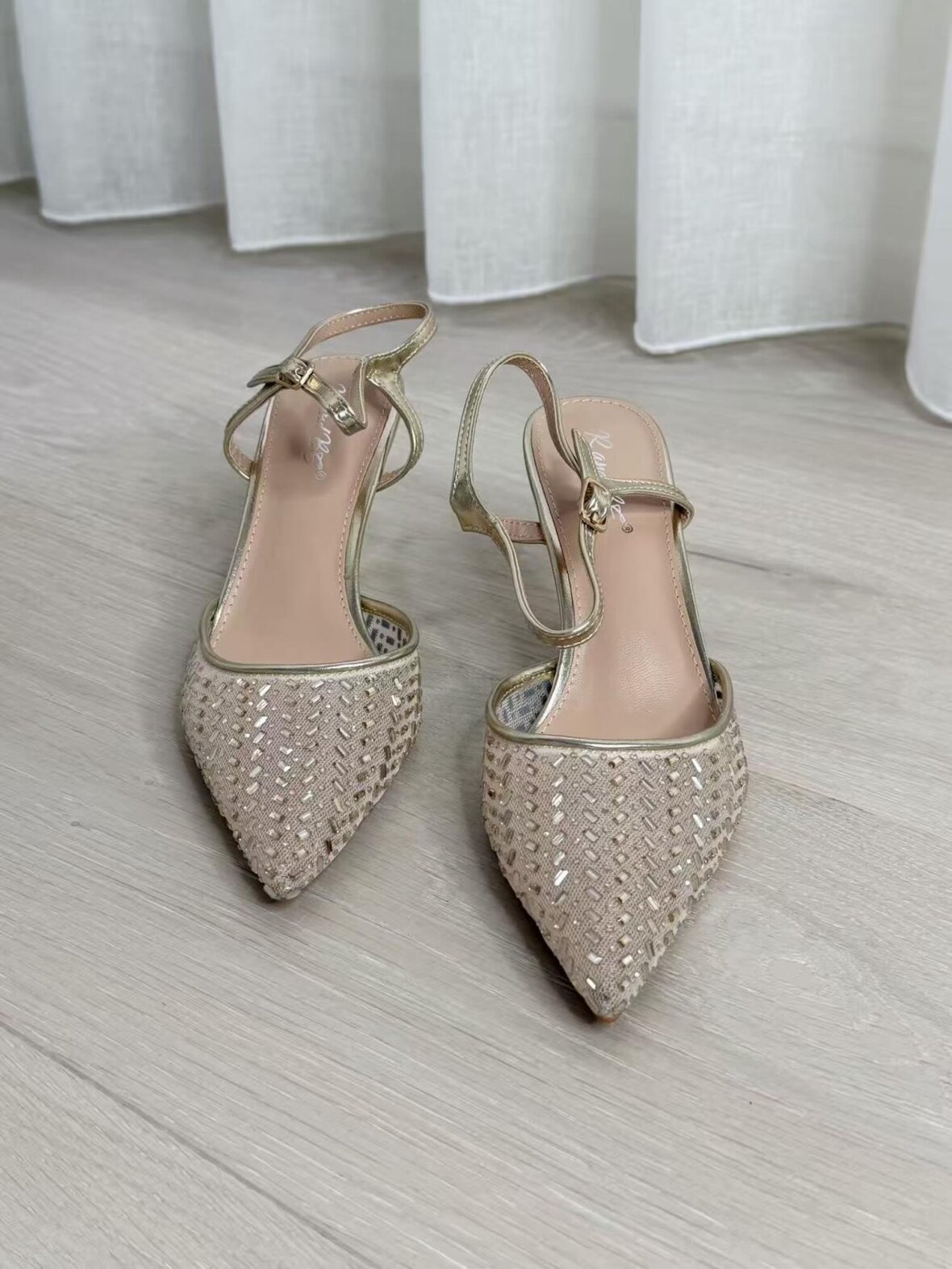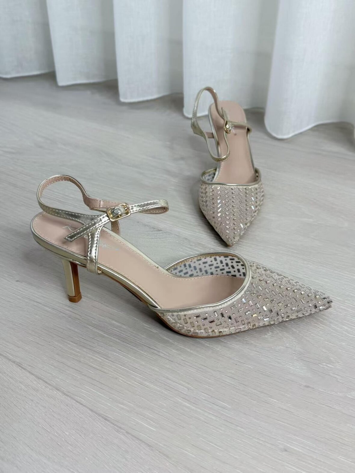 Eksklusive stilethæle i en smuk champagnefarve med elegant mesh og glitrende sten. De spidse snuder og de fine remme giver et luksuriøst og feminint udtryk. Perfekte til fest, bryllup eller særlige lejligheder, hvor du ønsker et sofistikeret look med et strejf af glamour. En tidløs hæl, der kombinerer stil, komfort og elegance.