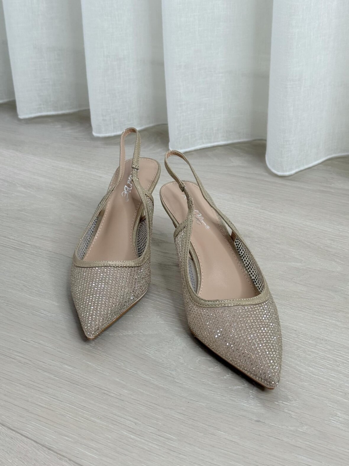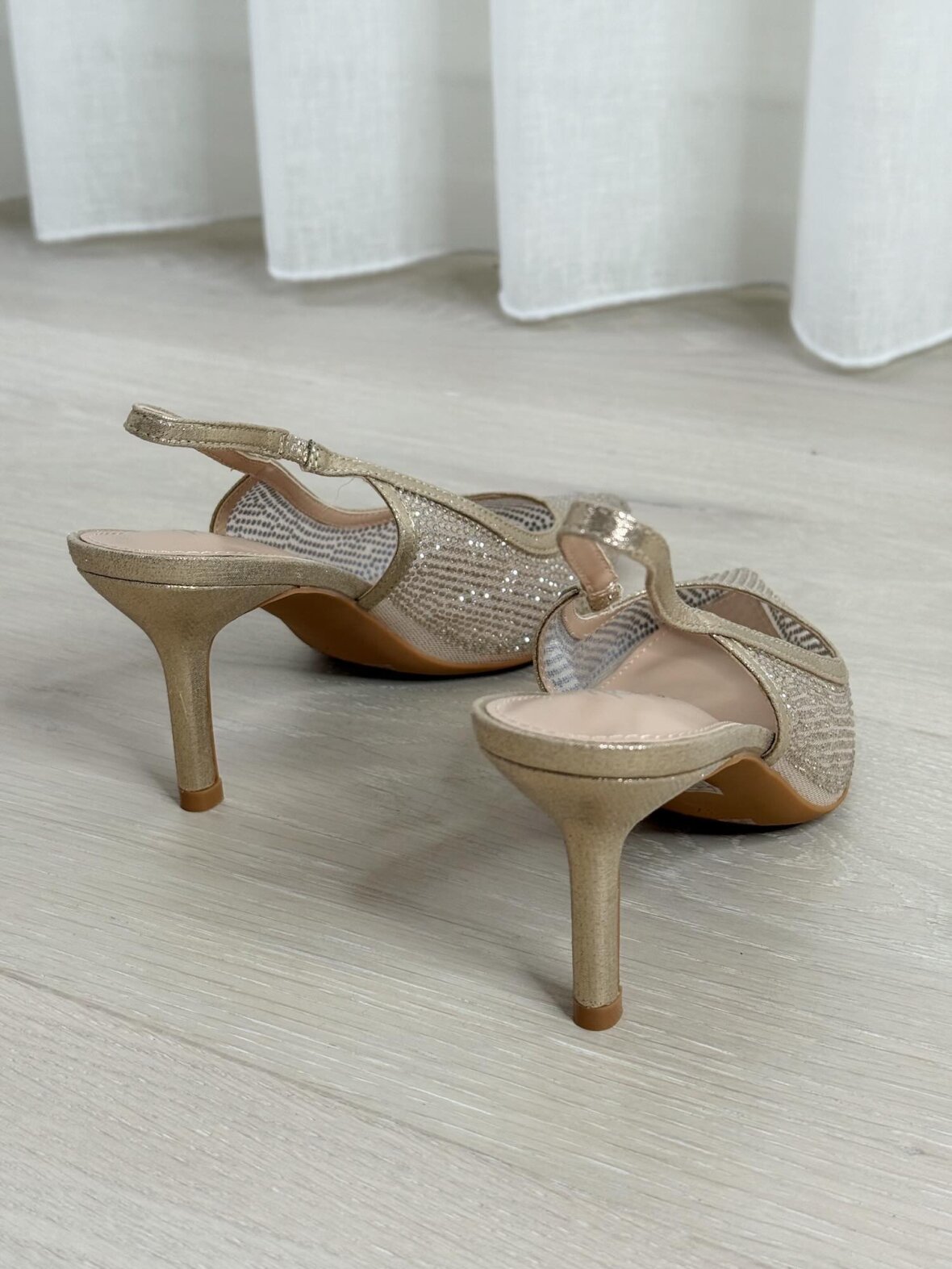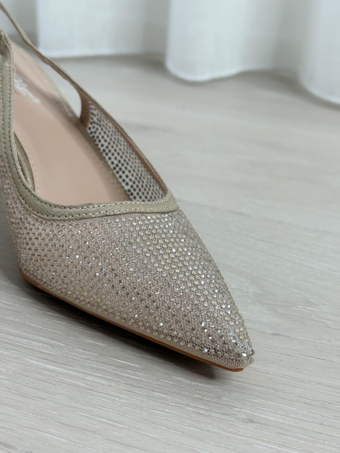 Glitrende guld slingback-hæle med spids snude og elegant strop. De fine rhinsten dækker hele skoen og giver et eksklusivt og glamourøst udtryk. Med en behagelig hælhøjde er de perfekte til fest, bryllup eller en aften, hvor du ønsker at skinne. En tidløs hæl, der kombinerer luksus, komfort og feminin elegance.