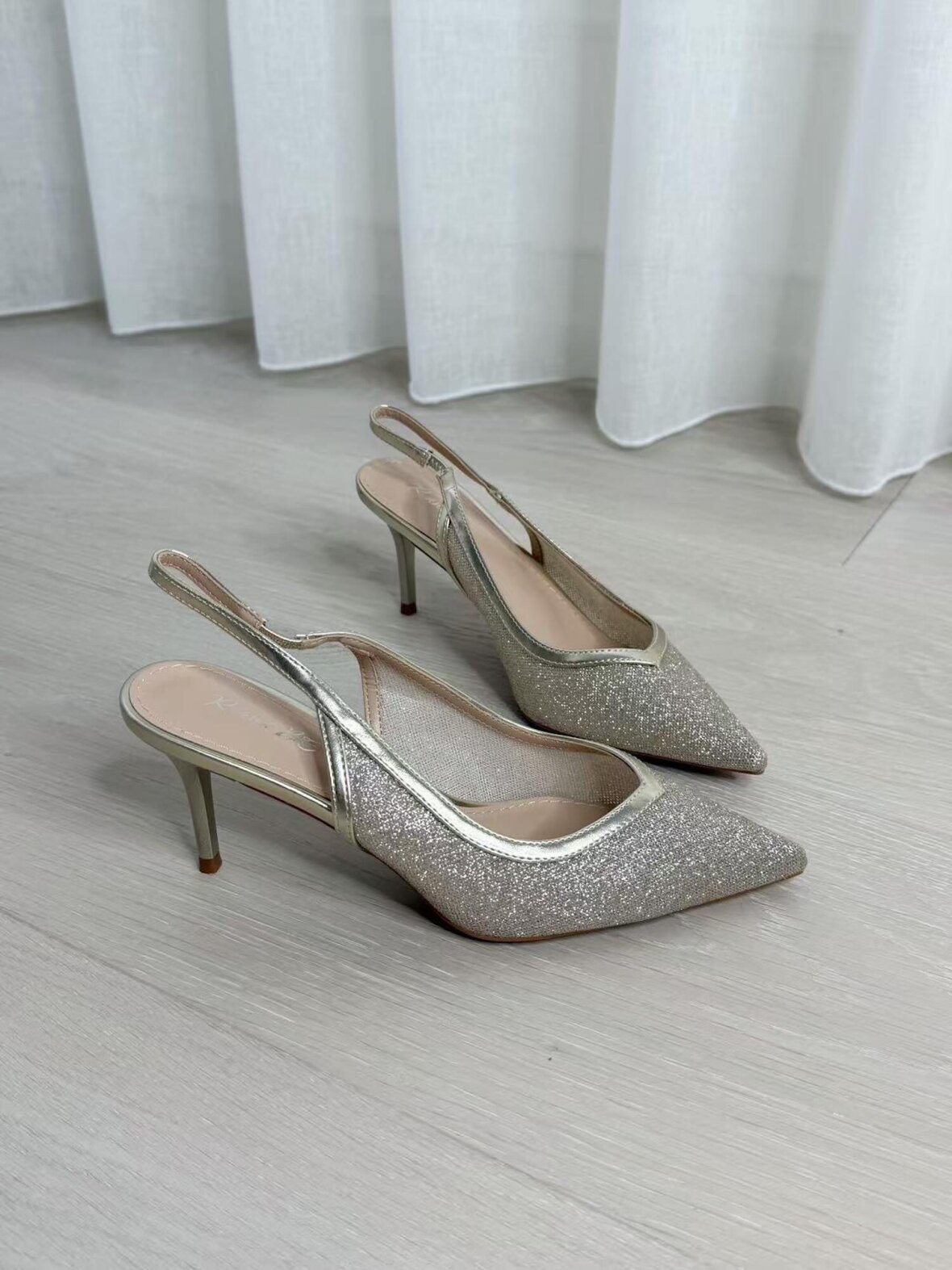 Smukke guld slingback-hæle med spids snude og en elegant glimmerfinish. De fine detaljer og den slanke hæl giver et sofistikeret og feminint udtryk, der passer perfekt til fest, bryllup eller aftenarrangementer. Skoene kombinerer stil og komfort med deres lette design og klassiske pasform – et must-have i enhver garderobe.