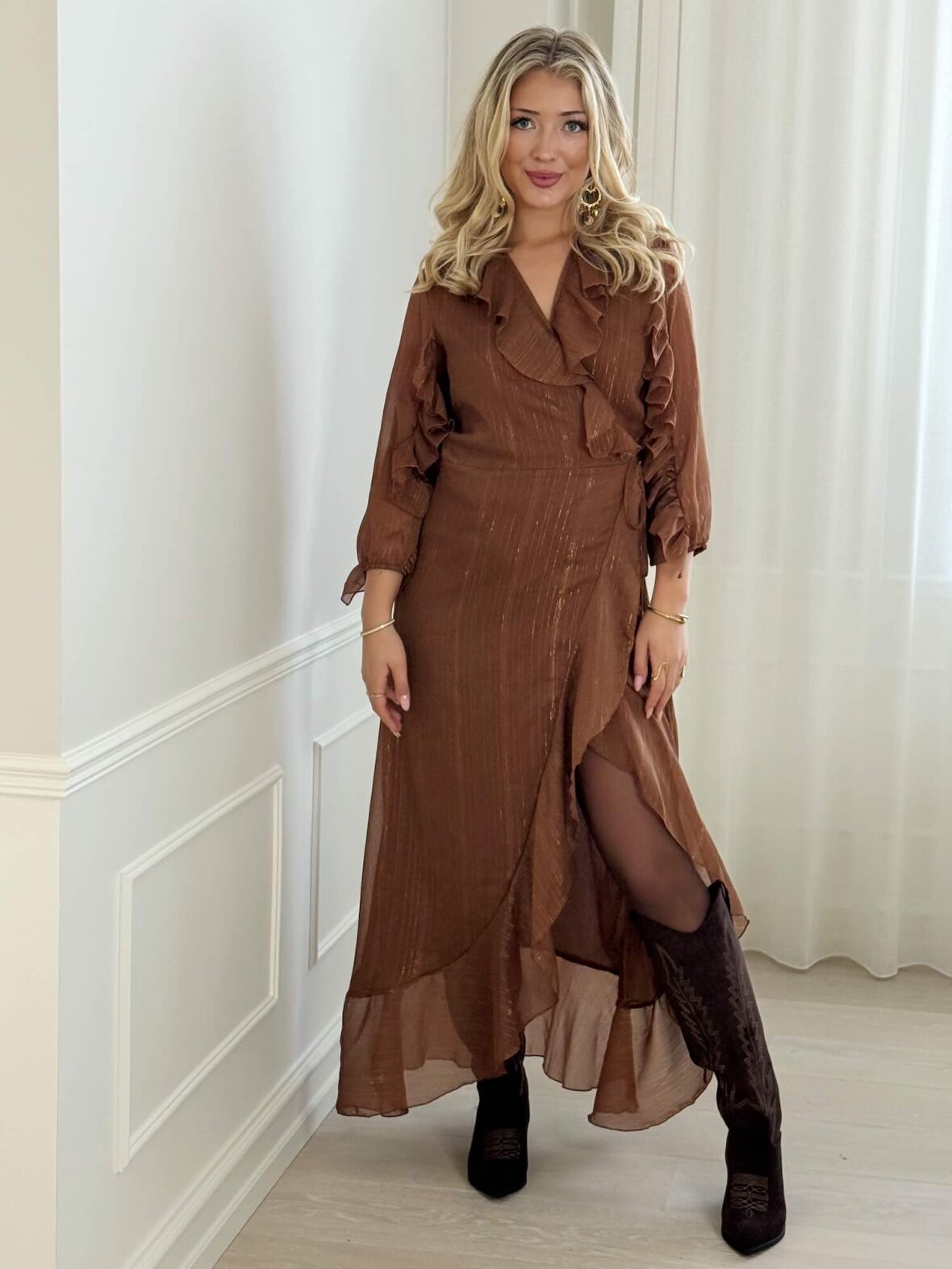 Elegant brun maxi-kjole i let og gennemsigtigt materiale med fine gyldne striber. Kjolen har slå-om effekt med bindebånd i taljen, flæsedetaljer langs kanten og smukke ærmer med volumen. Et feminint og tidløst valg til både festlige lejligheder og aftener.