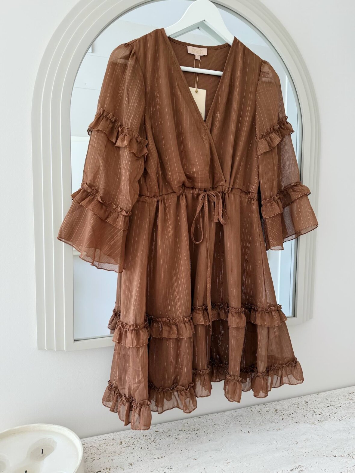 Smuk brun kjole i let, transparent materiale med fine gyldne striber. Kjolen har et feminint snit med slå-om effekt, bindebånd i taljen og elegante flæsedetaljer ved ærmer og kant. Perfekt til efteråret – style den med støvler og en strik for et chic, lag-på-lag look.
