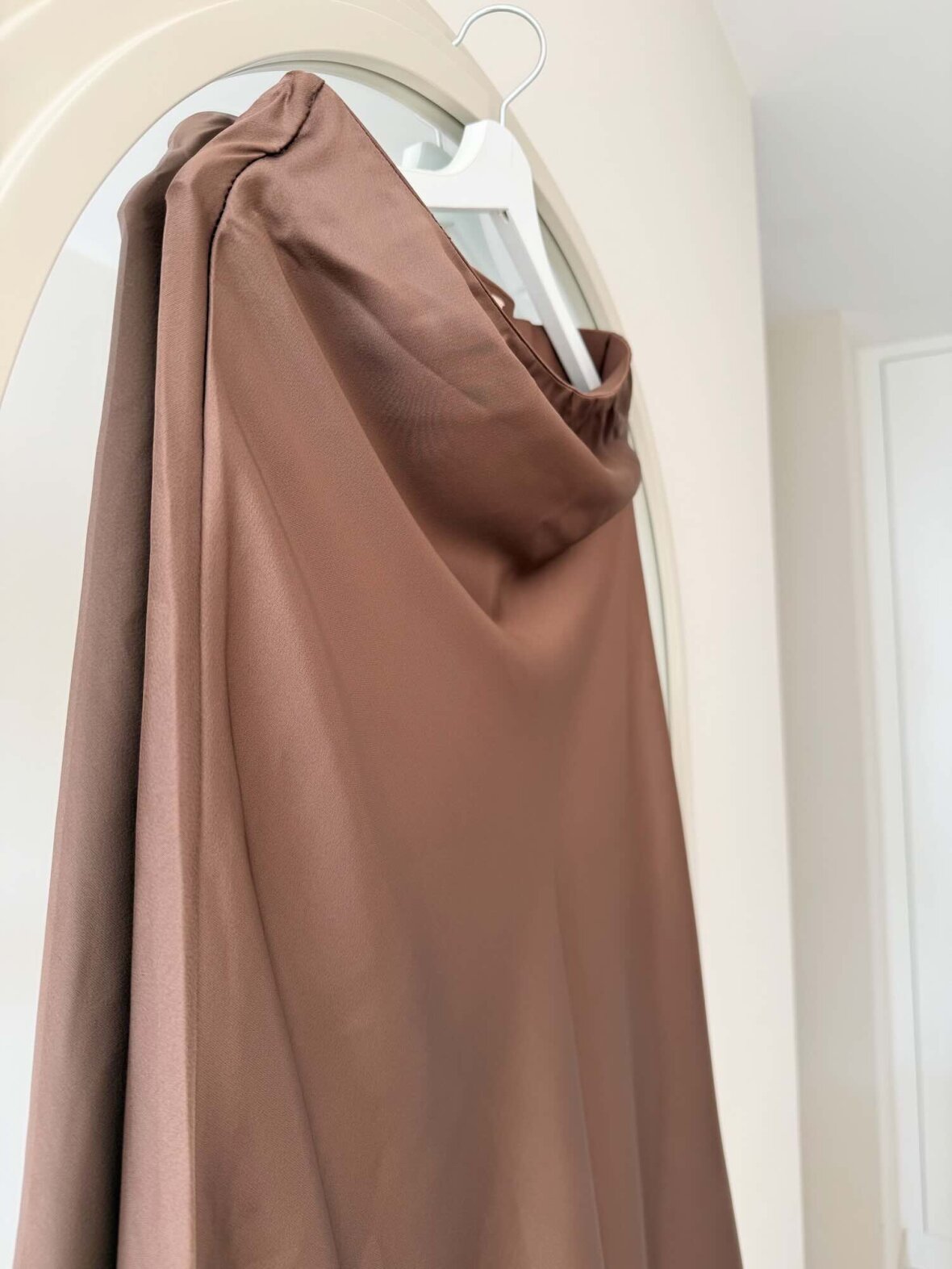 Elegant satin nederdel i chokoladebrun nuance med en smuk, glansfuld overflade. Nederdelen har elastik i taljen og en let slids i siden, der giver et feminint og sofistikeret udtryk. Perfekt til både hverdag og mere festlige anledninger.