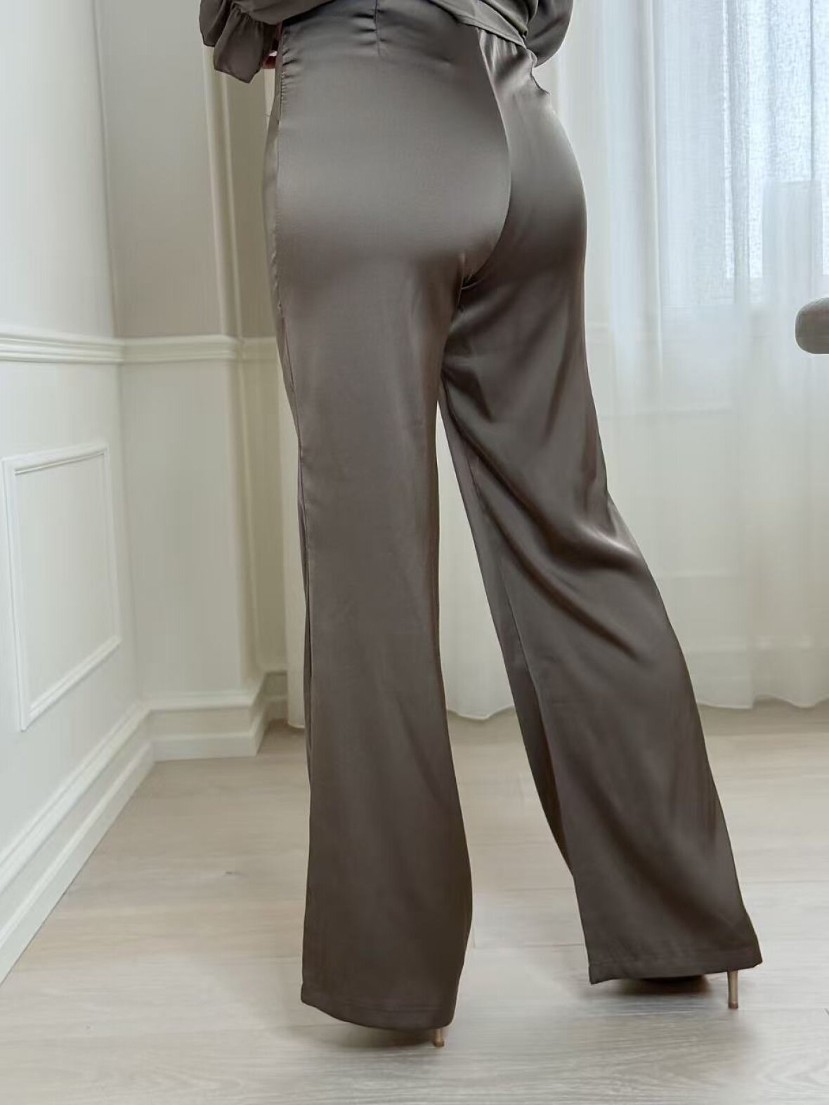 Smukke satinbukser i en elegant taupefarve med et glansfuldt og luksuriøst udtryk. Bukserne har et flatterende, højtaljet snit og et klassisk lige ben, der skaber et sofistikeret og feminint look. Perfekte til både festlige anledninger og hverdagsbrug, hvor du ønsker et chic og stilrent outfit. Kombinér dem med en matchende top for et eksklusivt sæt.