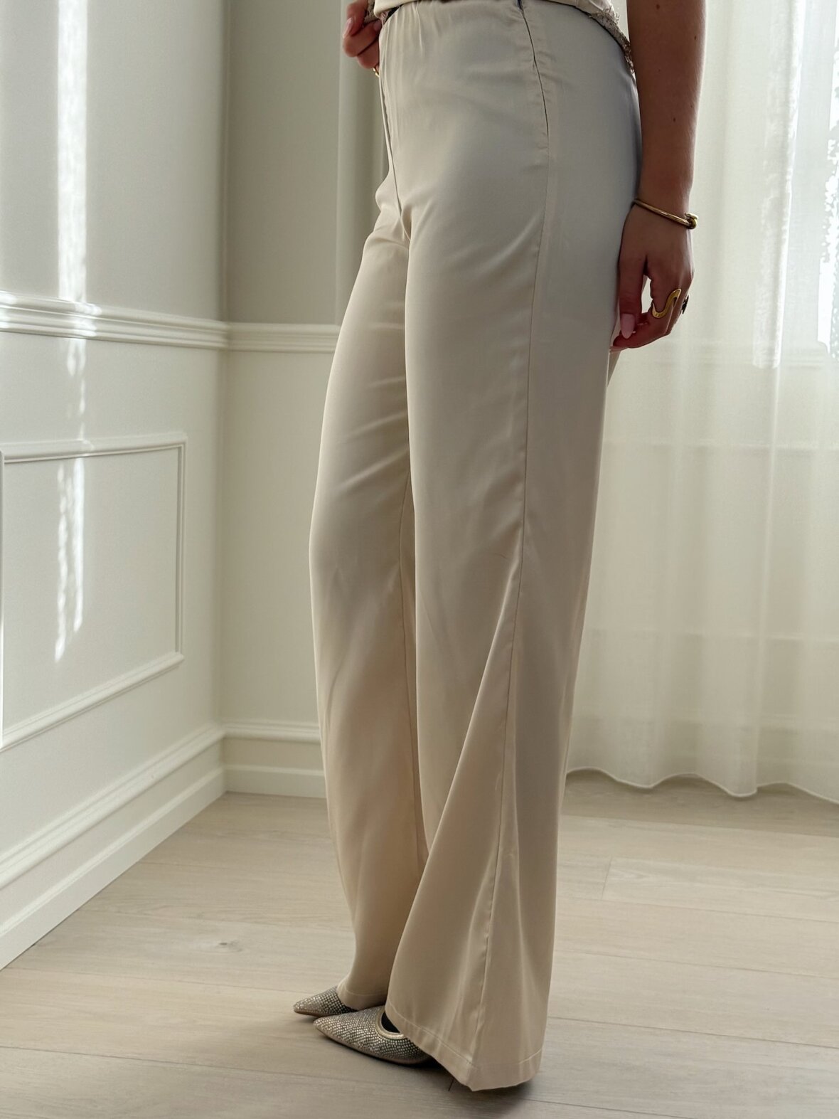 Satinbukser i beige med elegant glans og let, flydende pasform. Bukserne har elastik i taljen for optimal komfort og et flot fald med svaj i benene. Et stilrent valg, der nemt kan dresses op eller ned.