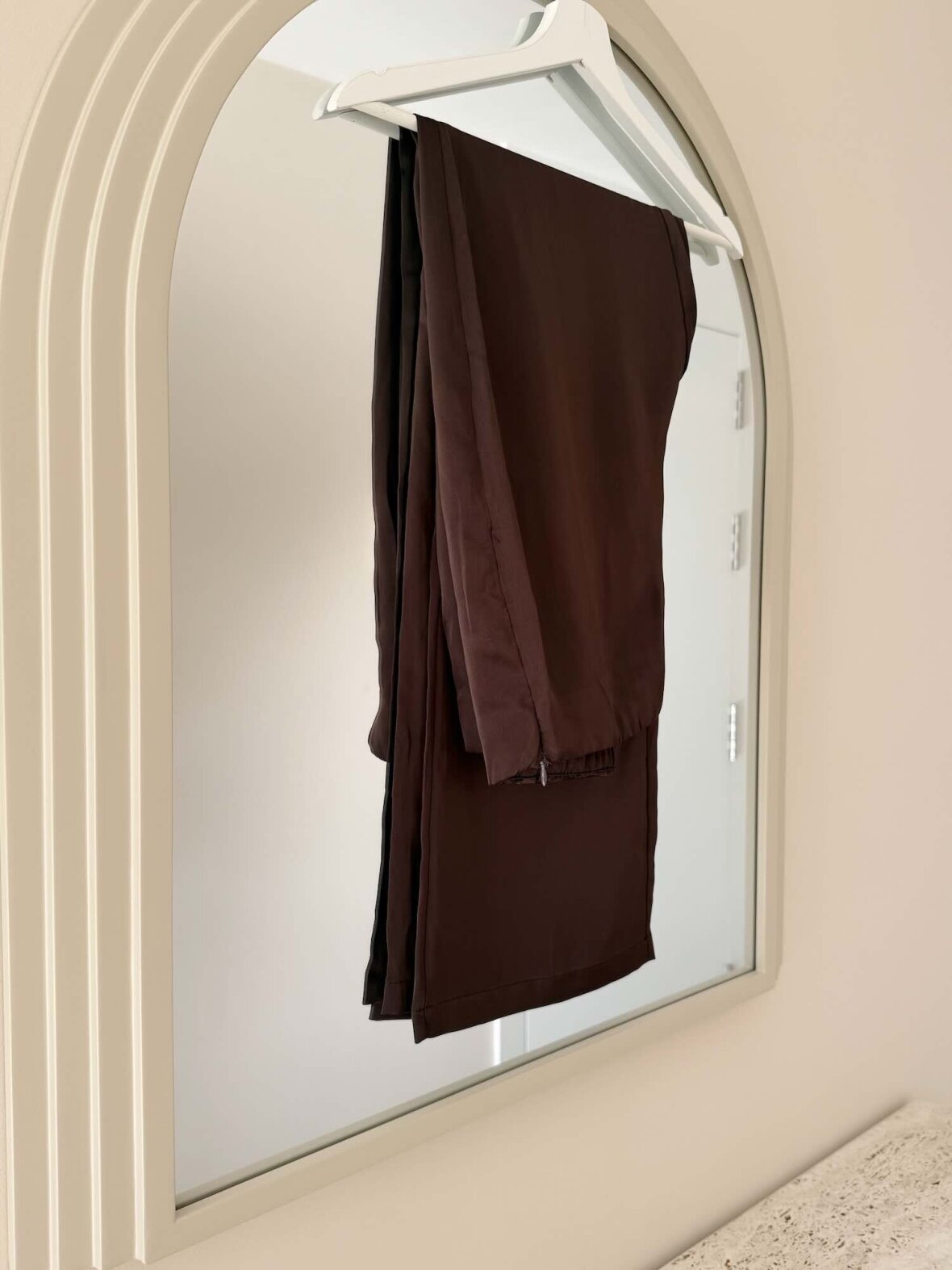 Satinbukser i dyb chokoladebrun nuance med smuk glans og et elegant fald. Bukserne har elastik i taljen og et let svaj i benene, der giver en flatterende silhuet og en behagelig pasform.