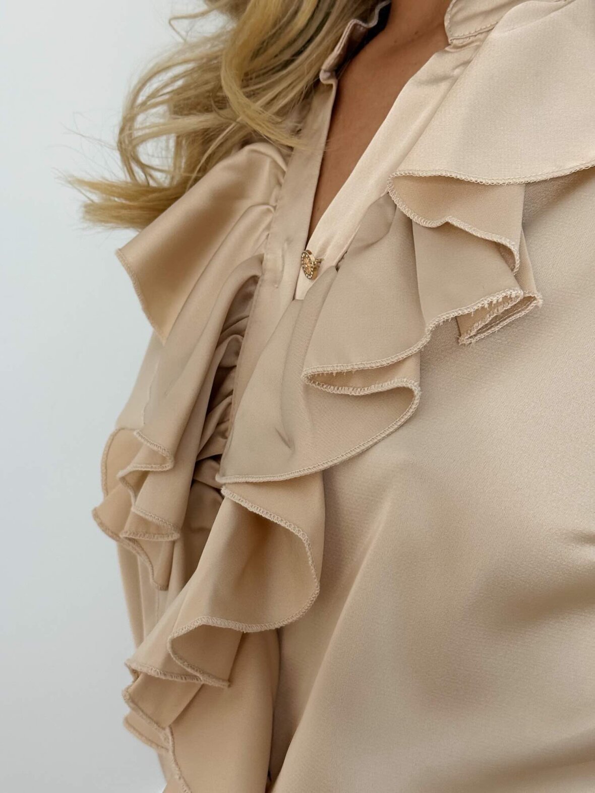 Elegant beige skjorte med smukke flæser foran og fine knapper. Skjorten har en klassisk pasform med manchetter, der fuldendes af små sløjfedetaljer. Den let blanke kvalitet giver et eksklusivt udtryk – perfekt til både hverdag og festlige anledninger.