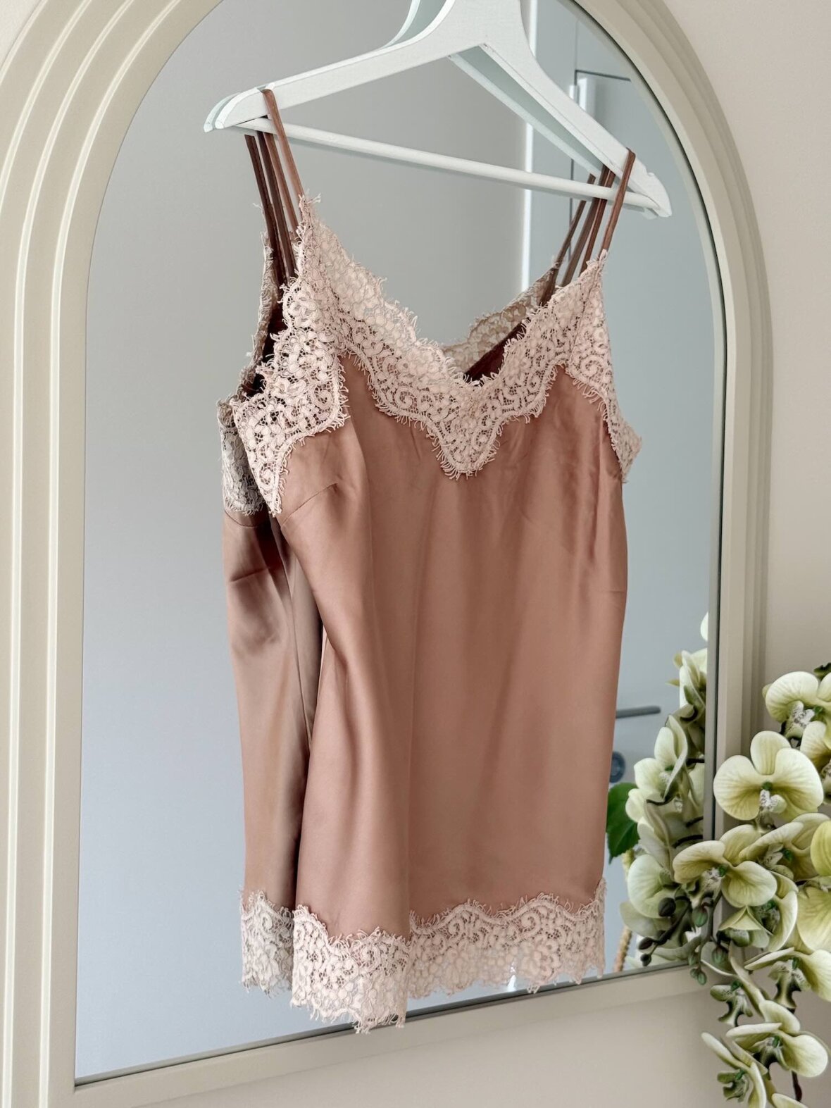 Feminin top i en smuk camel nuance med delikate blondedetaljer langs udskæring og kant. Den glatte, let skinnende kvalitet og de justerbare stropper giver et elegant og komfortabelt fit. Perfekt under en blazer, cardigan eller alene til et sofistikeret look.
