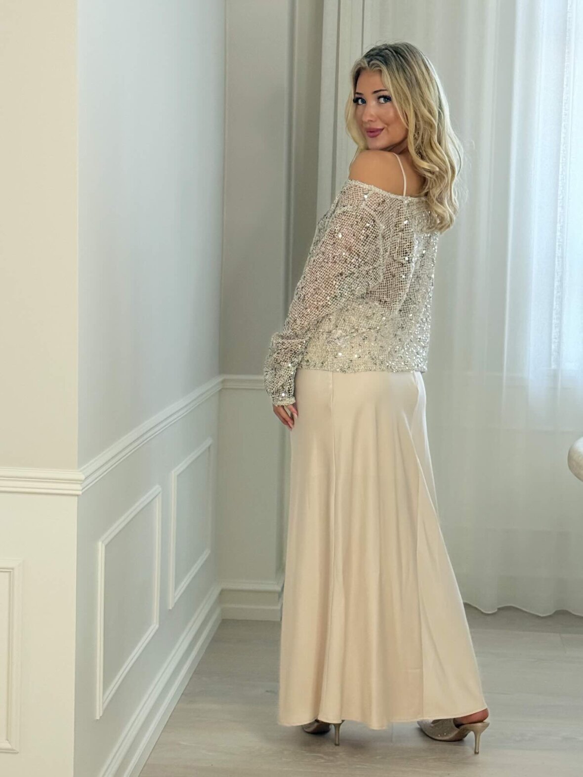 Kort top dækket af elegante pailletter i beige tone. Toppen har en let gennemsigtig struktur, rund hals og lange ærmer, som giver et eksklusivt og festligt udtryk. Perfekt til at kombinere med både bukser og nederdel for et glamorøst look.